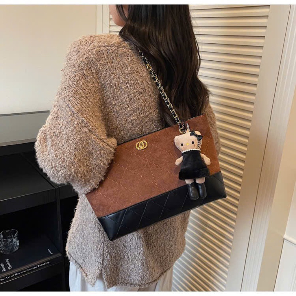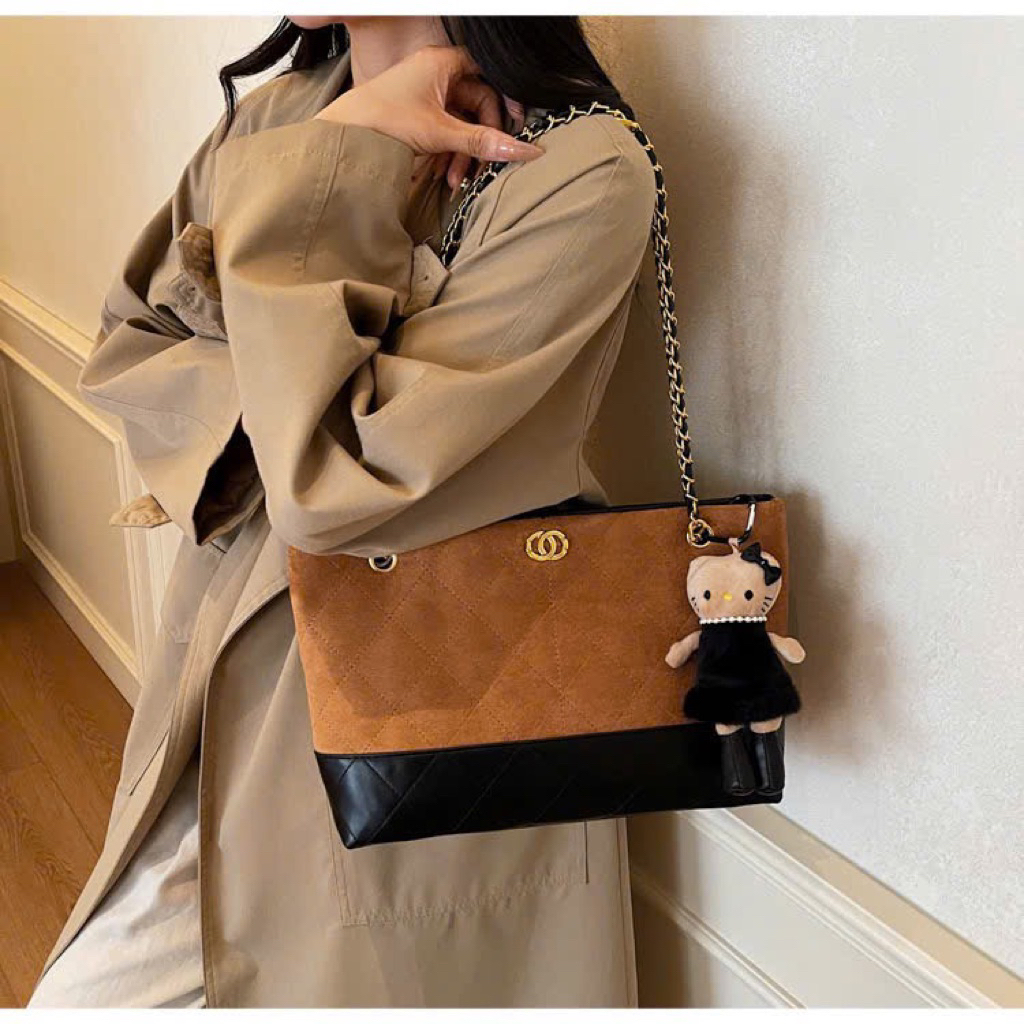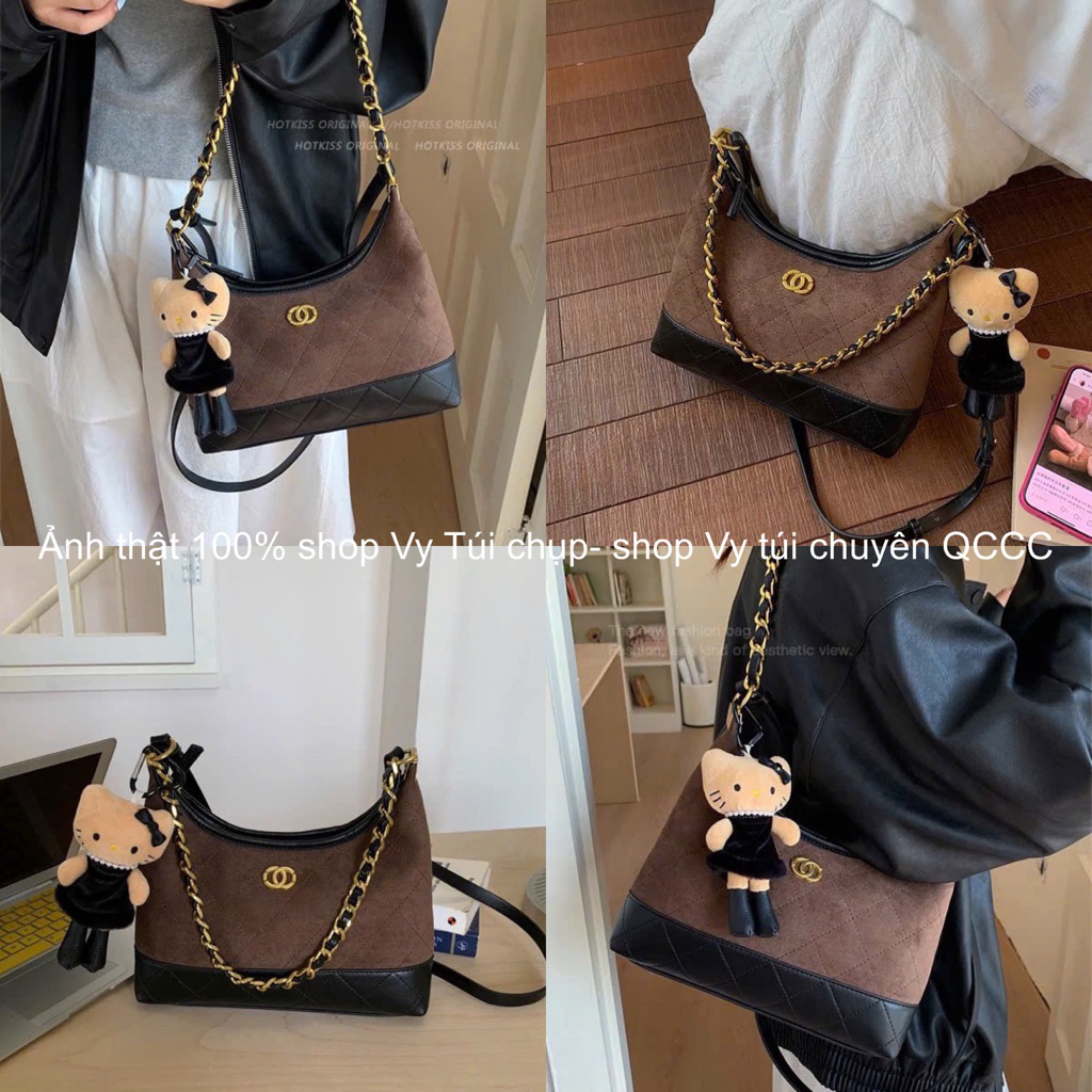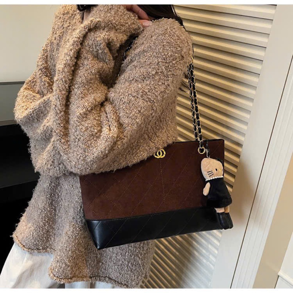 Túi da phối da lộn size 38cm có quai cầm dây da pha xích đeo kẹp nách fome rộng đựng đồ thoải mái