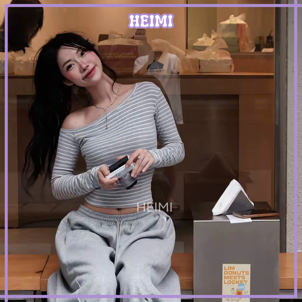 Áo Thun Lệch Vai Dài Tay Họa Tiết Kẻ Sọc Form Ôm Body Basic HEIMI