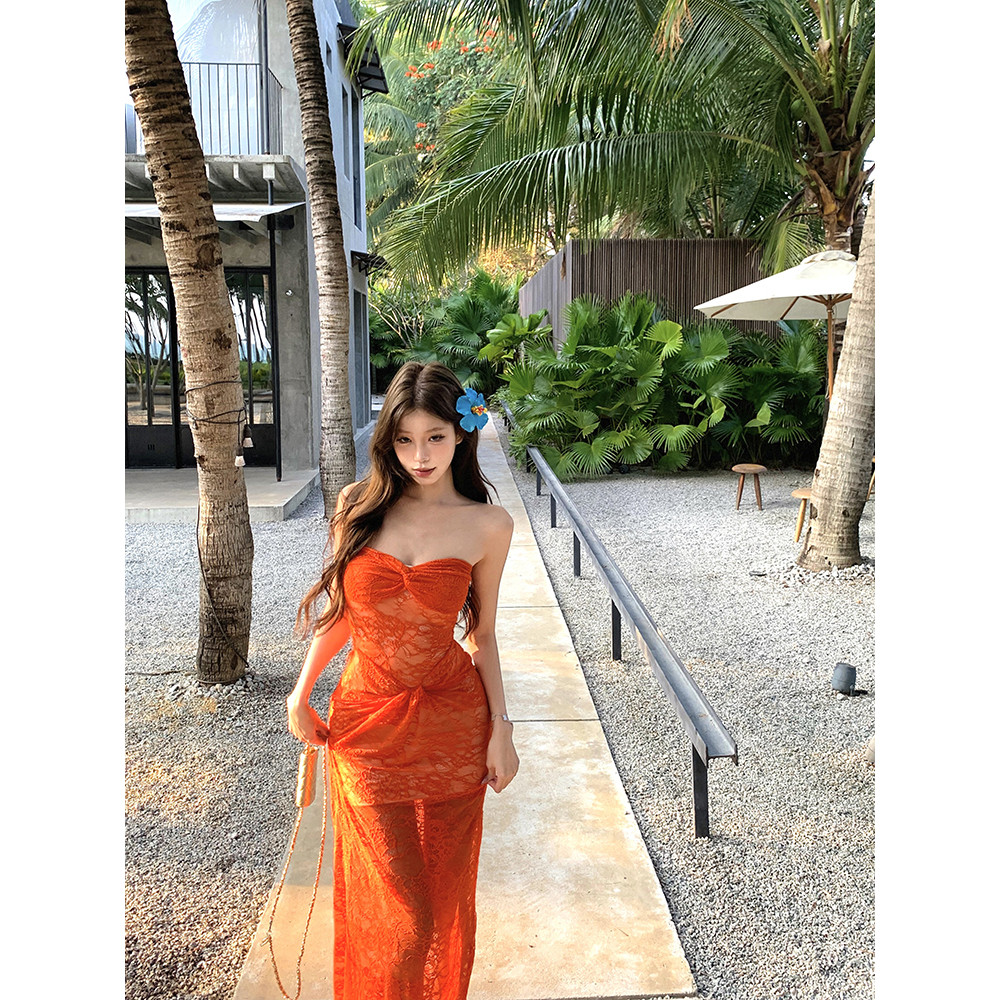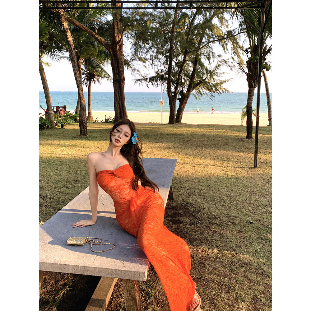 Đầm quây ren xuyên thấu màu cam mùa hè | 𝑨𝑱𝑰𝑵𝑰