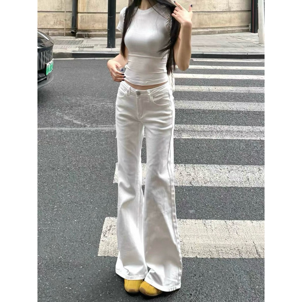 Quần Jeans Nữ màu Trắng ỐNG LOE Form rộng dài Chùm Chân Lưng thấp Hách Dáng Quần Bò Nữ ống Rộng Loe chất liệu Jeans Mềm