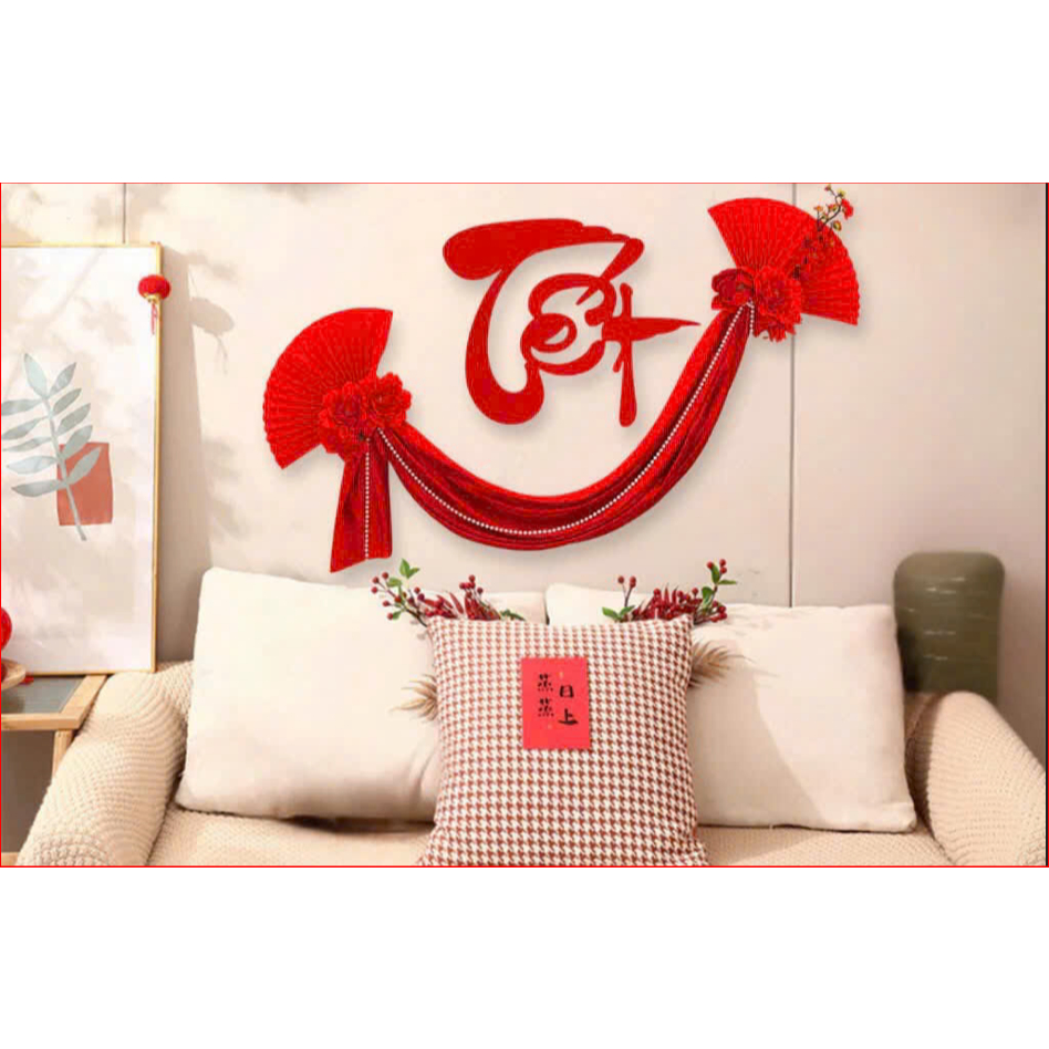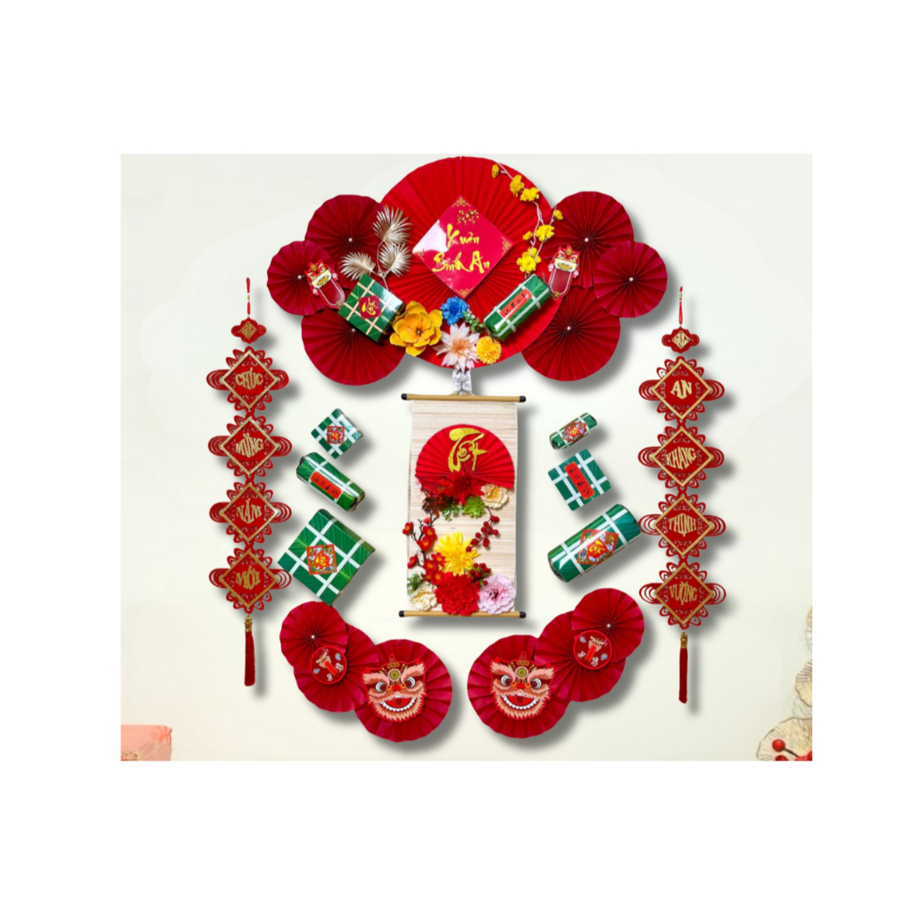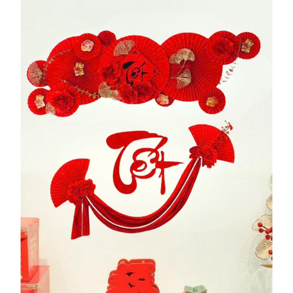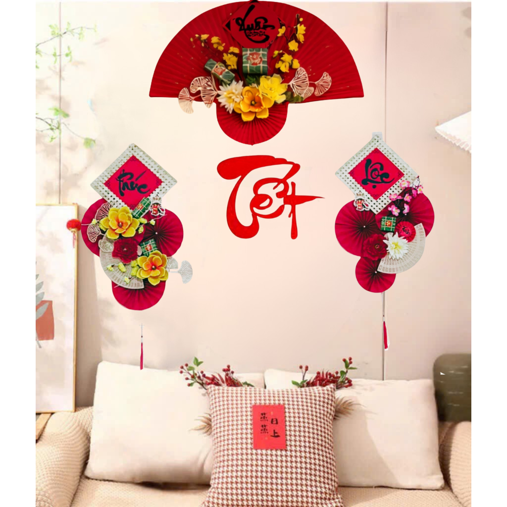 Trang Trí Tết 2026 Bính Ngọ, Set Decor Treo Nhà Cửa Kính, Combo Phụ Kiện Khánh Quạt Ông Thần Tài Lắc - Quạt Hoa Câu Đố