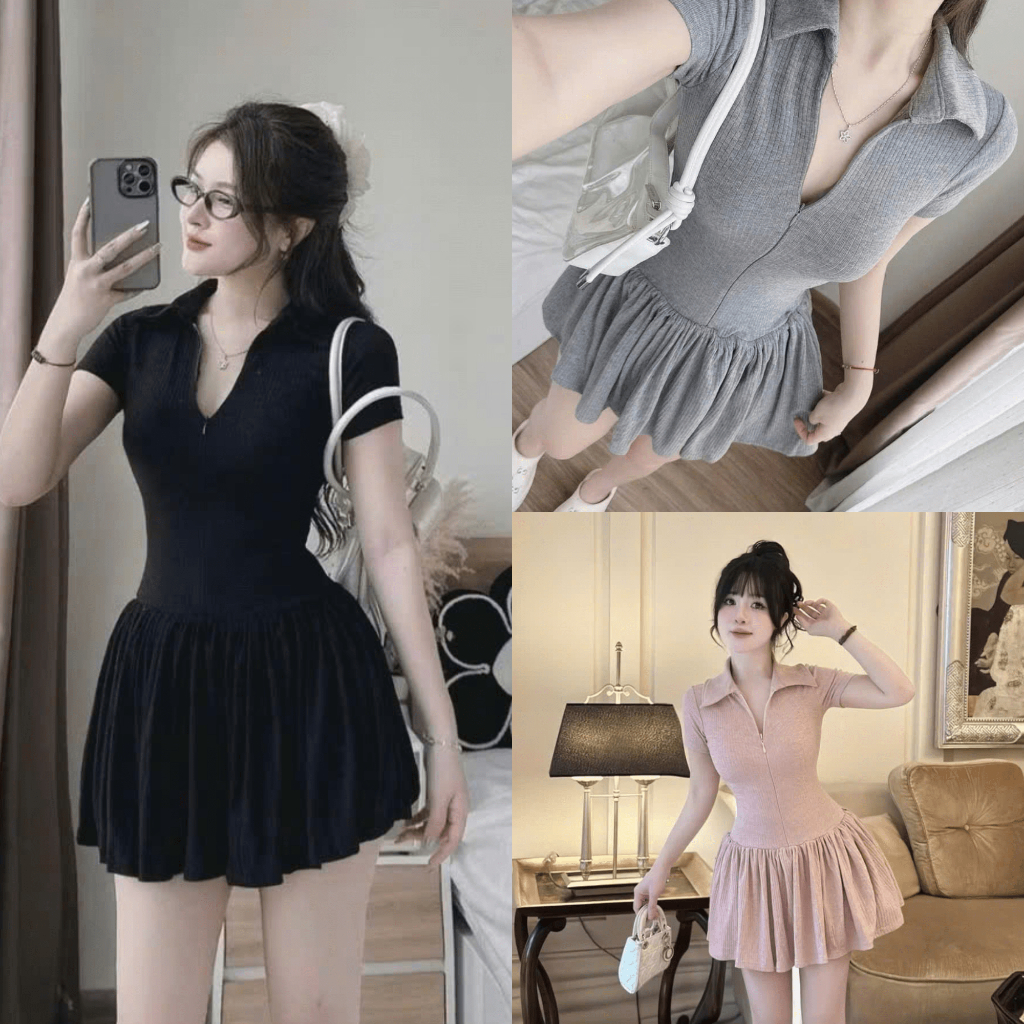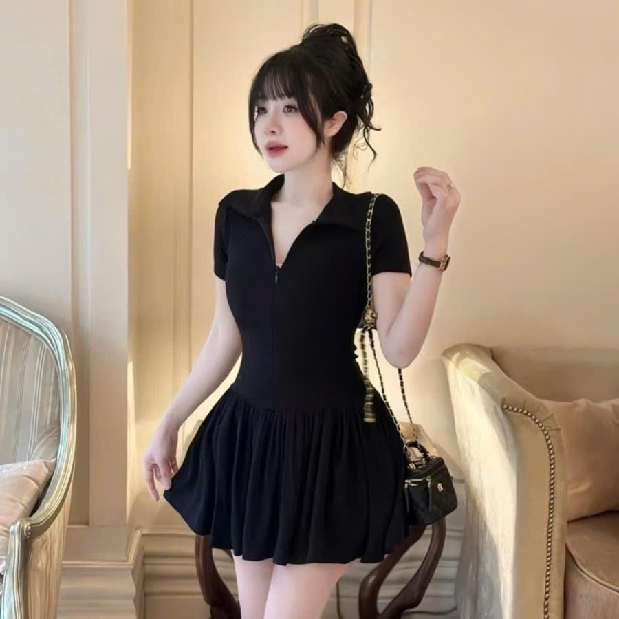 247store - Váy đầm cổ polo kéo khóa trước dáng ngắn váy nữ cổ V xòe phồng Vaybi911