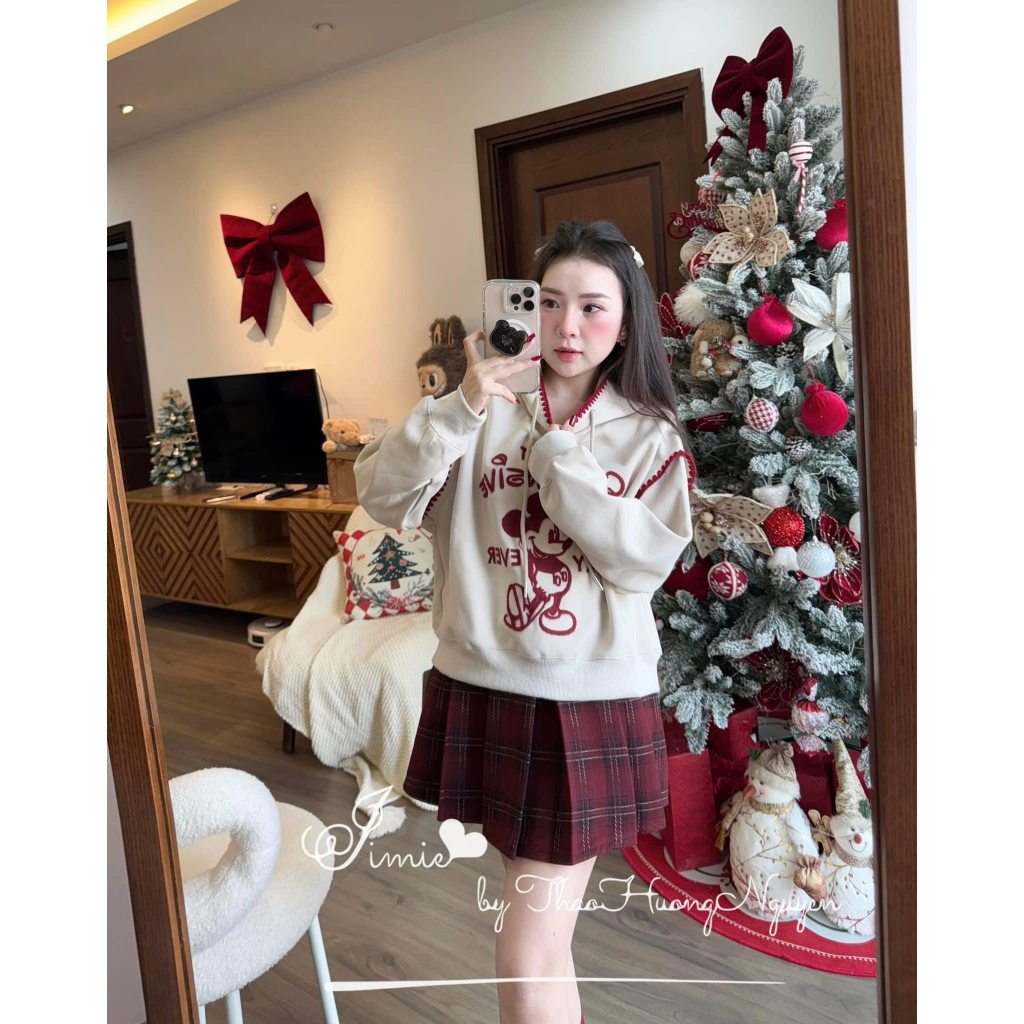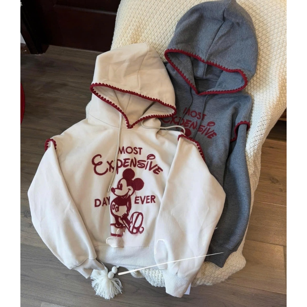 Áo hoodie nữ in hình mickey phối chỉ nổi phong cách trẻ trung Tina, áo nỉ dài tay có mũ thời trang mùa đông hcom3585