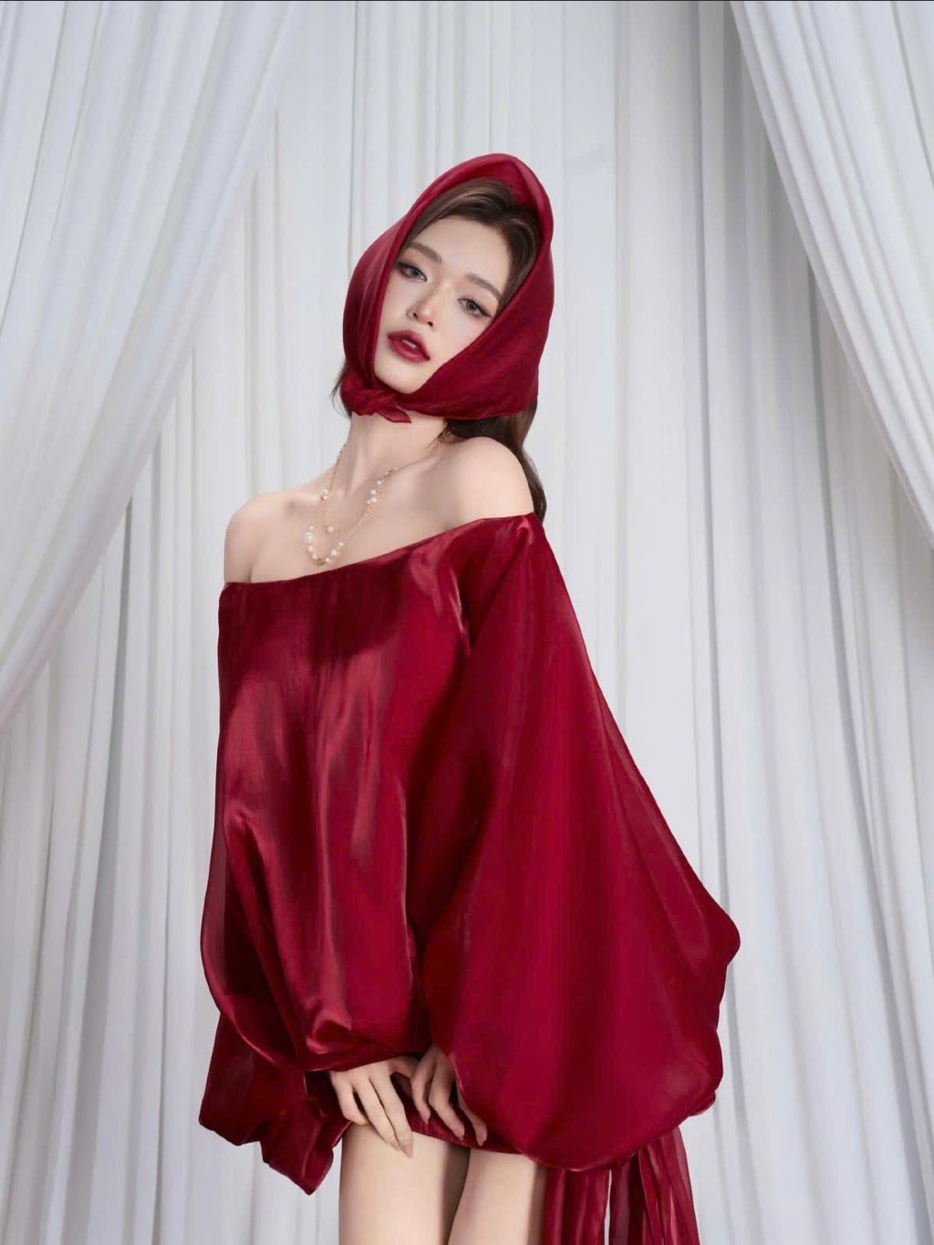 Đầm Trễ Vai Màu Đỏ Tay Phồng Tiểu Thư Siêu Xinh
