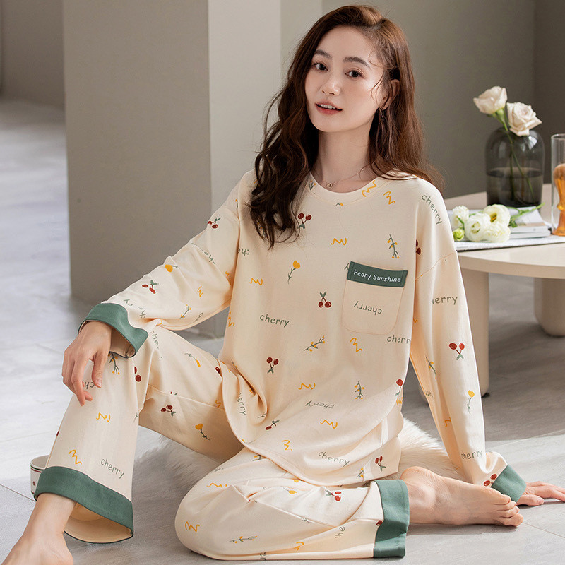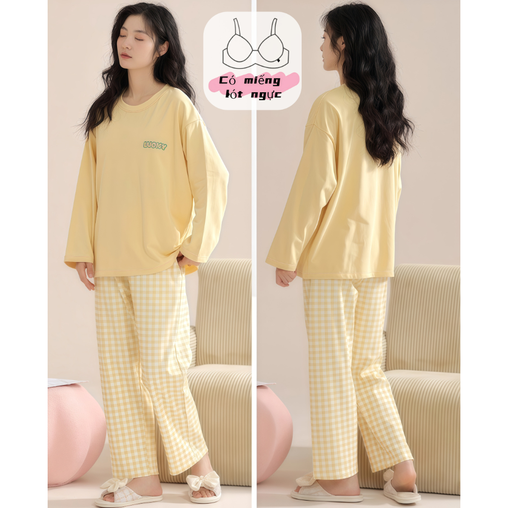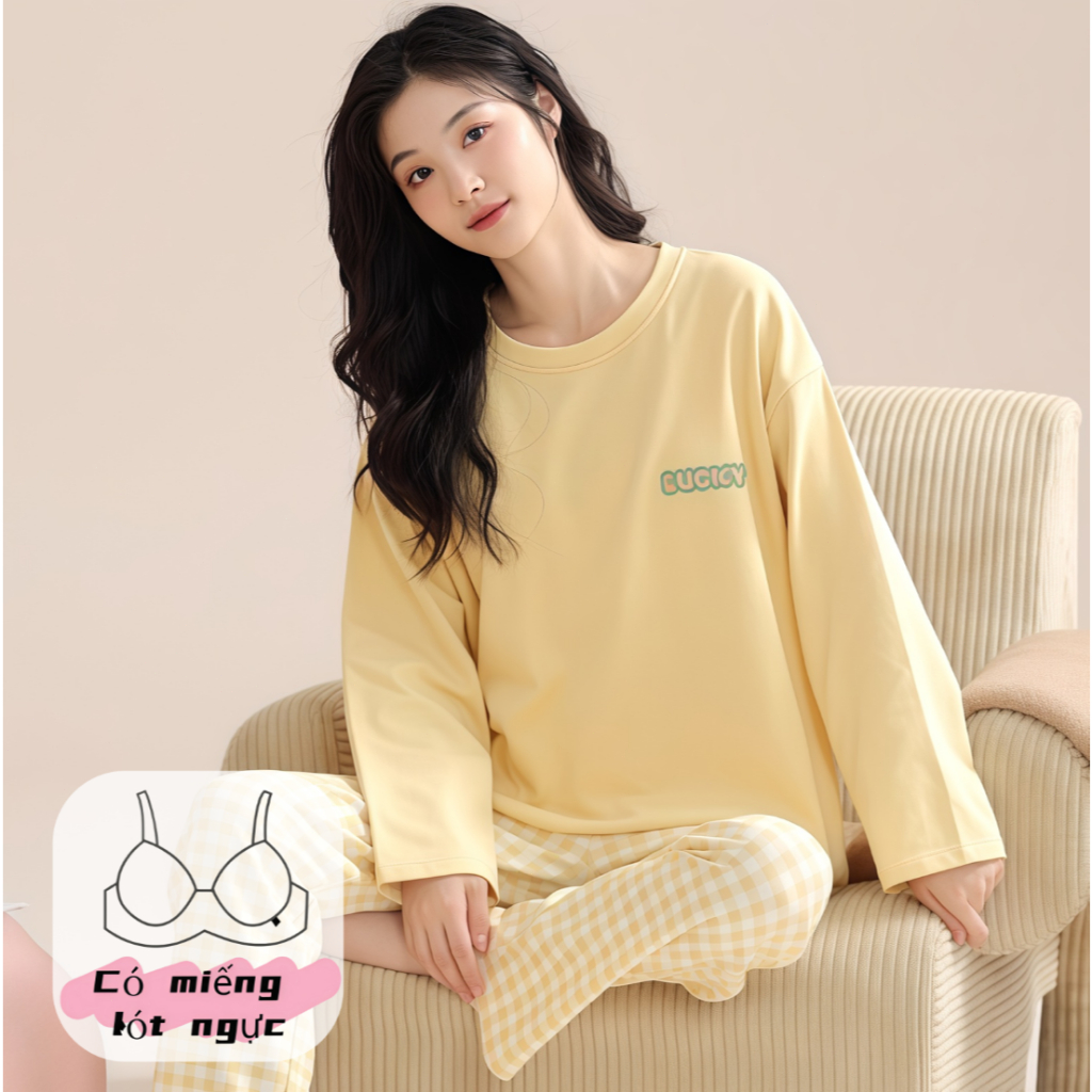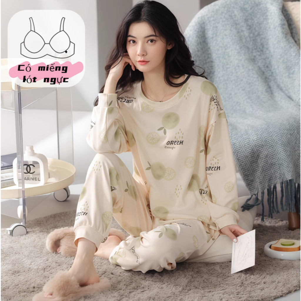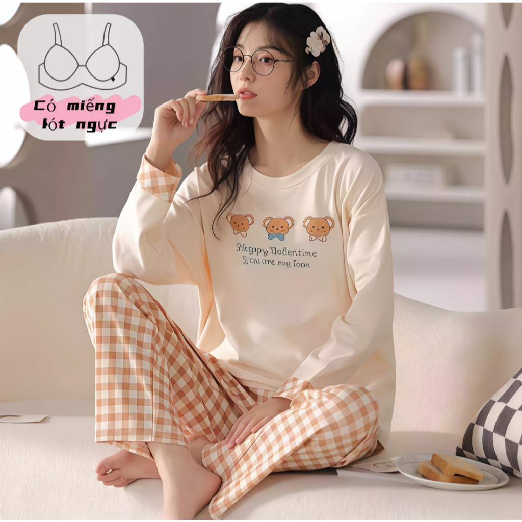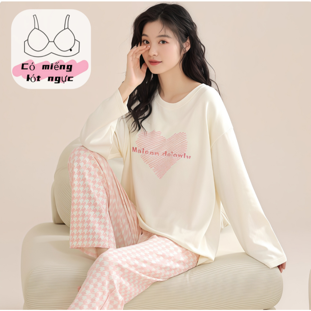【Có miếng lót ngực】Bộ đồ ngủ nữ có sẵn áo ngực | Hàng mới thu đông họa tiết cute | Thiết kế tay dài quần dài ấm áp | Chất liệu thoáng khí | Mặc nhà hoặc mặc ngoài