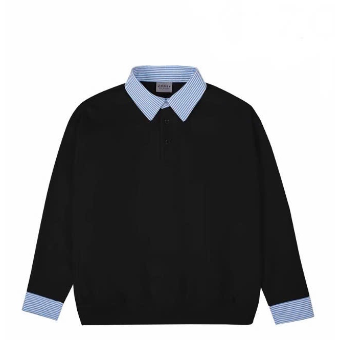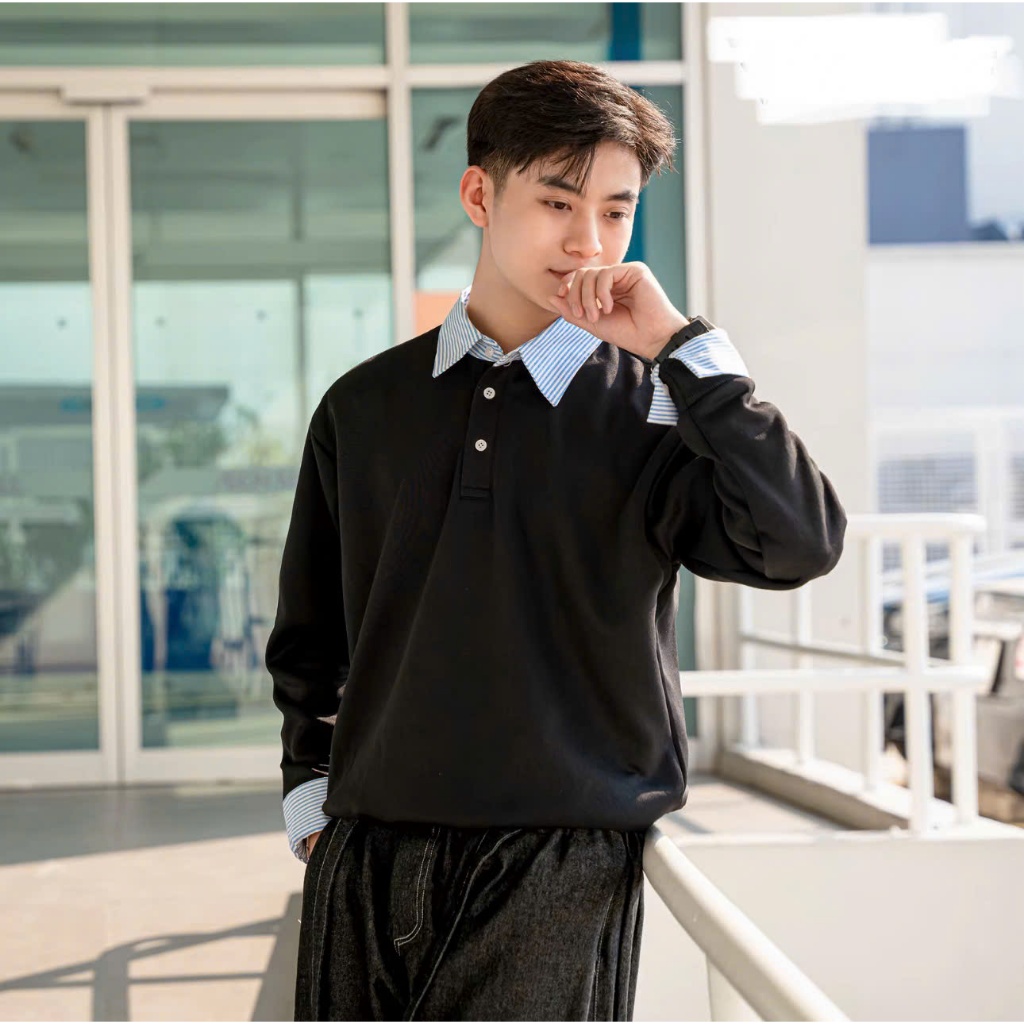 Áo Sweater Dài Tay Phối Sơ Mi Kẻ Xanh Nhạt Liền Thân. Áo Sweater nỉ 2 da nam nữ oversize Menswear