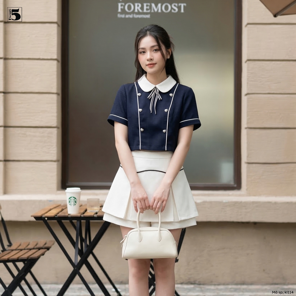 Set bộ nữ Twentyfive gồm áo kiểu cổ sen đính nơ tiểu thư và quần giả váy xếp ly xòe SAVH55