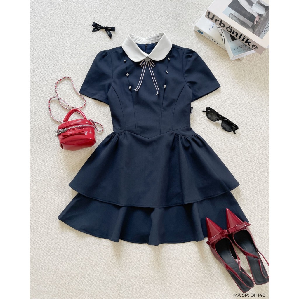 Đầm nữ Twentyfive ngắn tay, cổ sen đính nơ, chân váy 2 tầng DH140