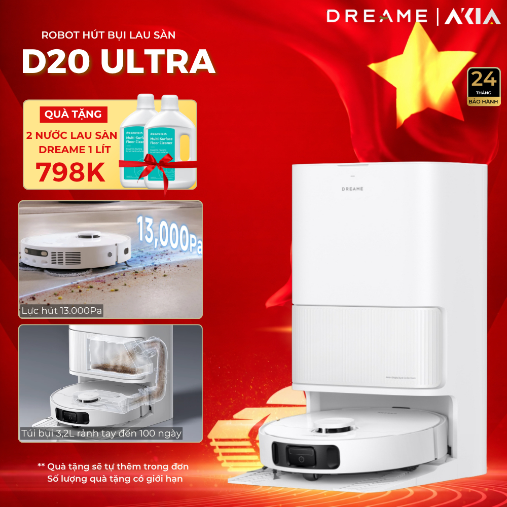 Robot hút bụi lau sàn Dreame D20 Ultra - Lực hút 13.000Pa - Trạm sạc đa năng rảnh tay đến 100 ngày - BH 24 Tháng