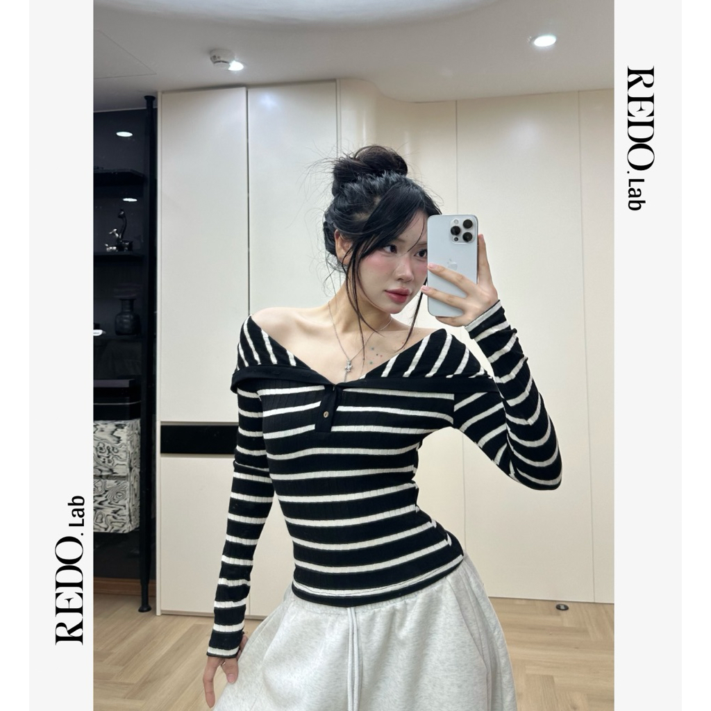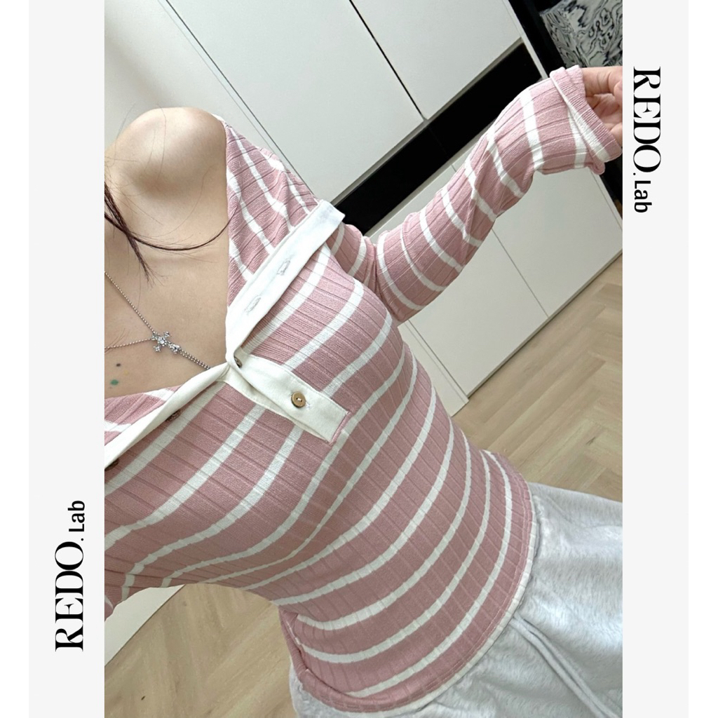 | REDO MỞ BÁN | ÁO KIỂU CHẤT DỆT KIM KẺ SỌC TRỄ VAI CỔ BẺ NHẤN THIẾT KẾ, DÁNG ÔM TÔN EO, CO GIÃN MỀM