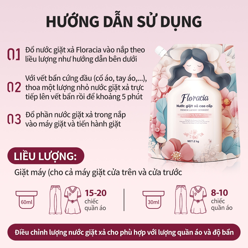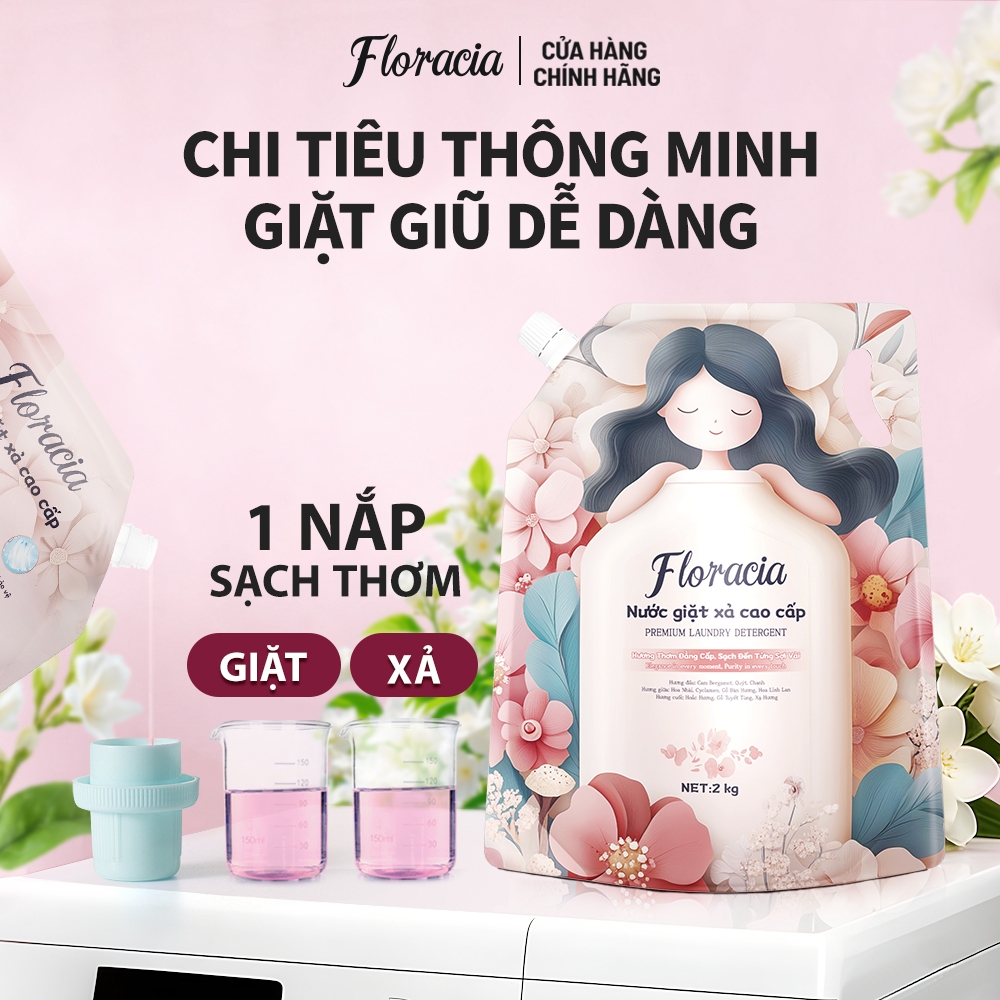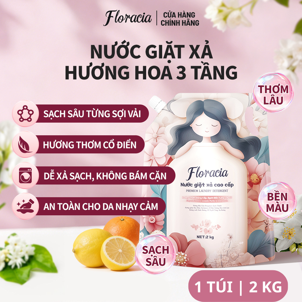 [MUA 1 TẶNG 1] Nước giặt xả Floracia hương hoa 3 tầng túi 2KG, không huỳnh quang sạch sâu an toàn dịu nhẹ giặt đồ lót
