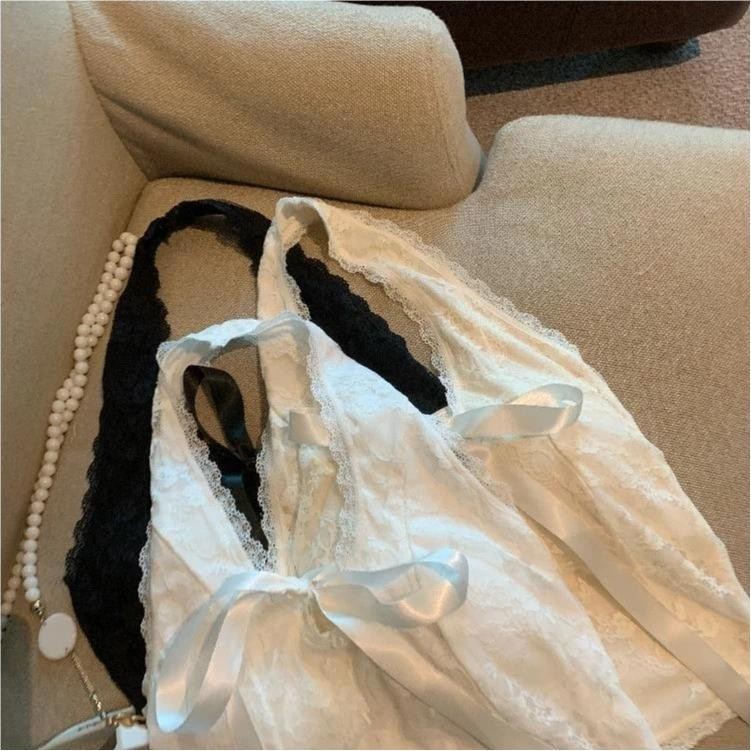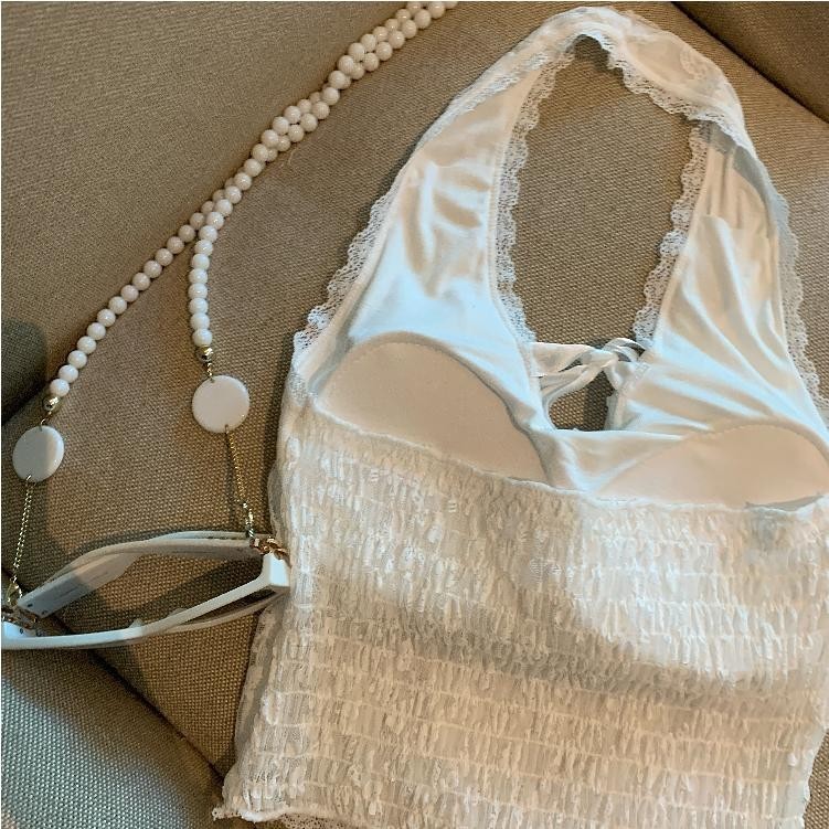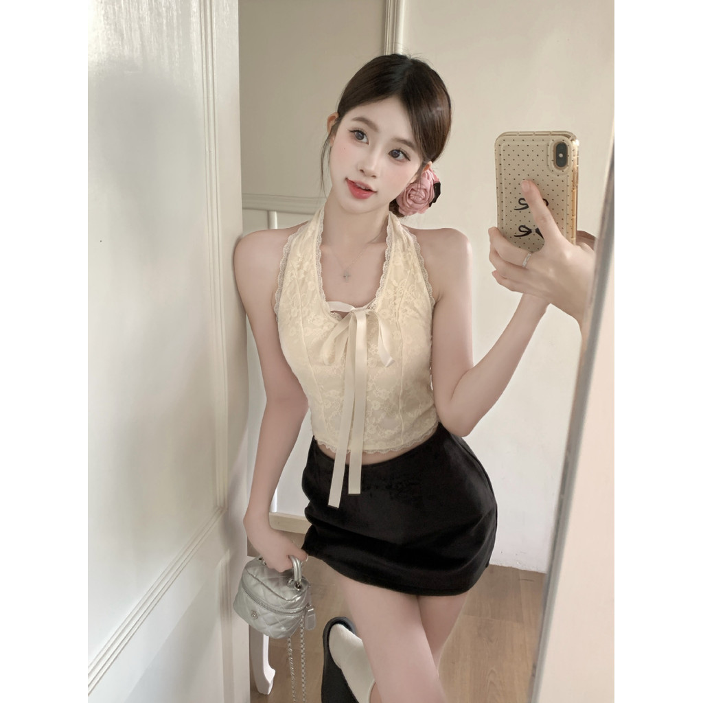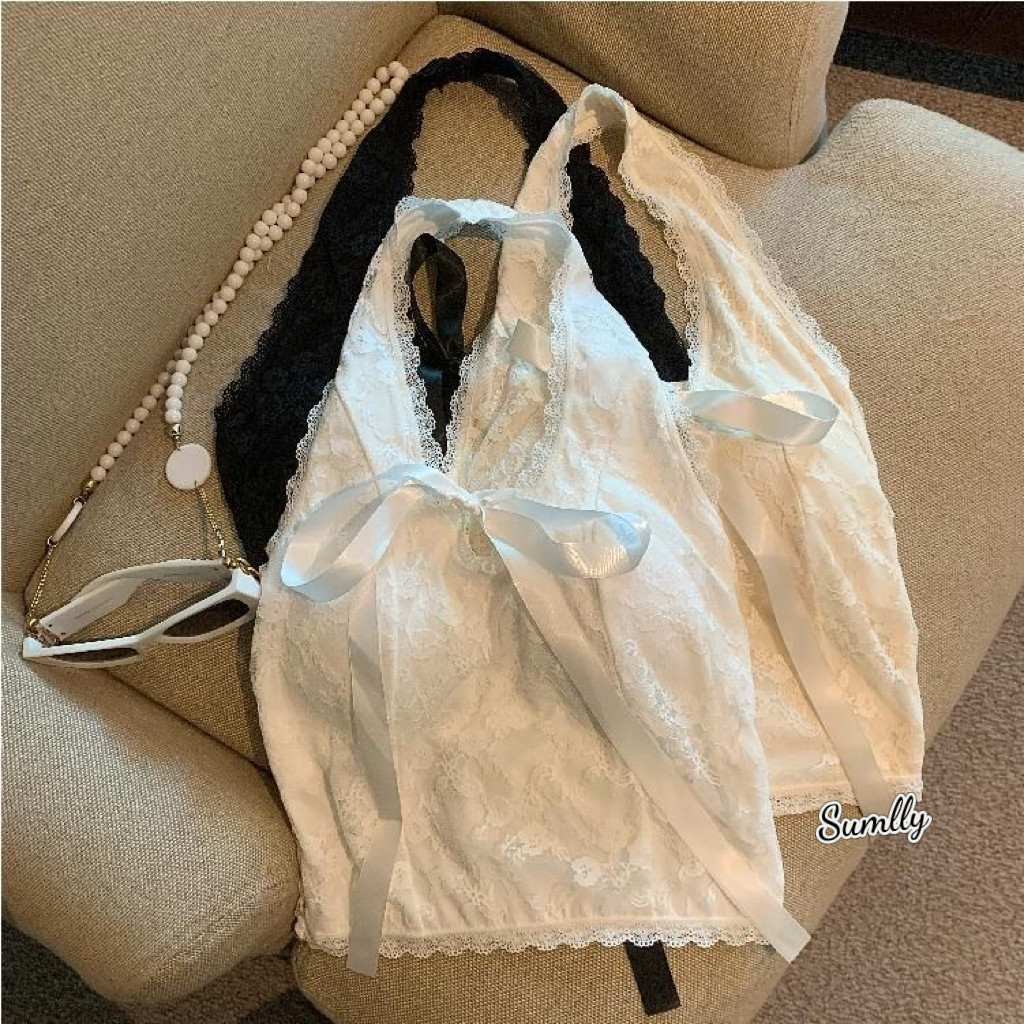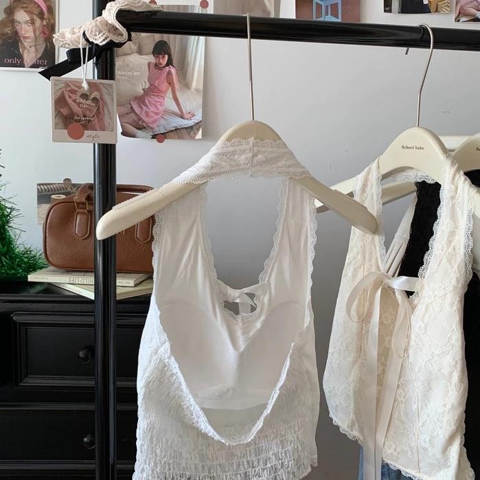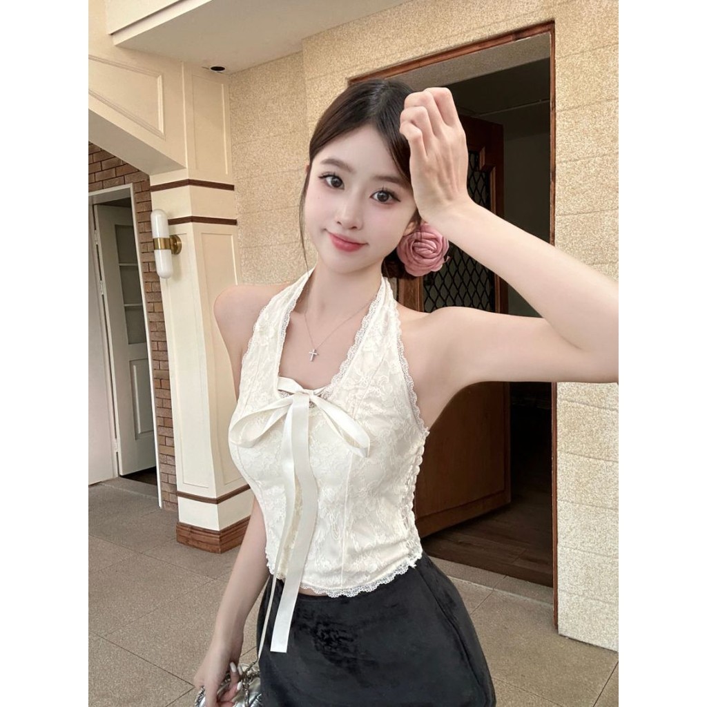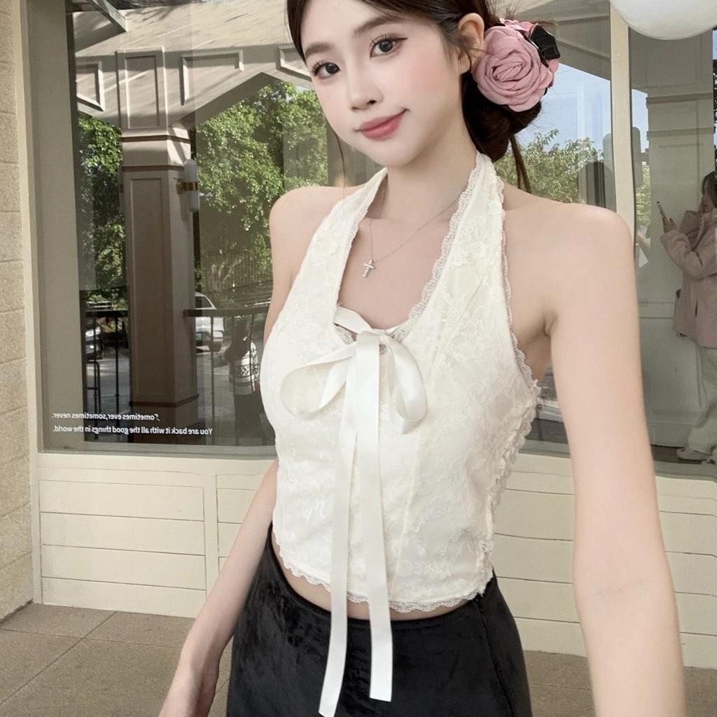 Mùa hè nơ ngọt ngào cổ chữ V áo vest bó sát ren hở lưng gợi cảm áo yếm không tay có miếng đệm ngực