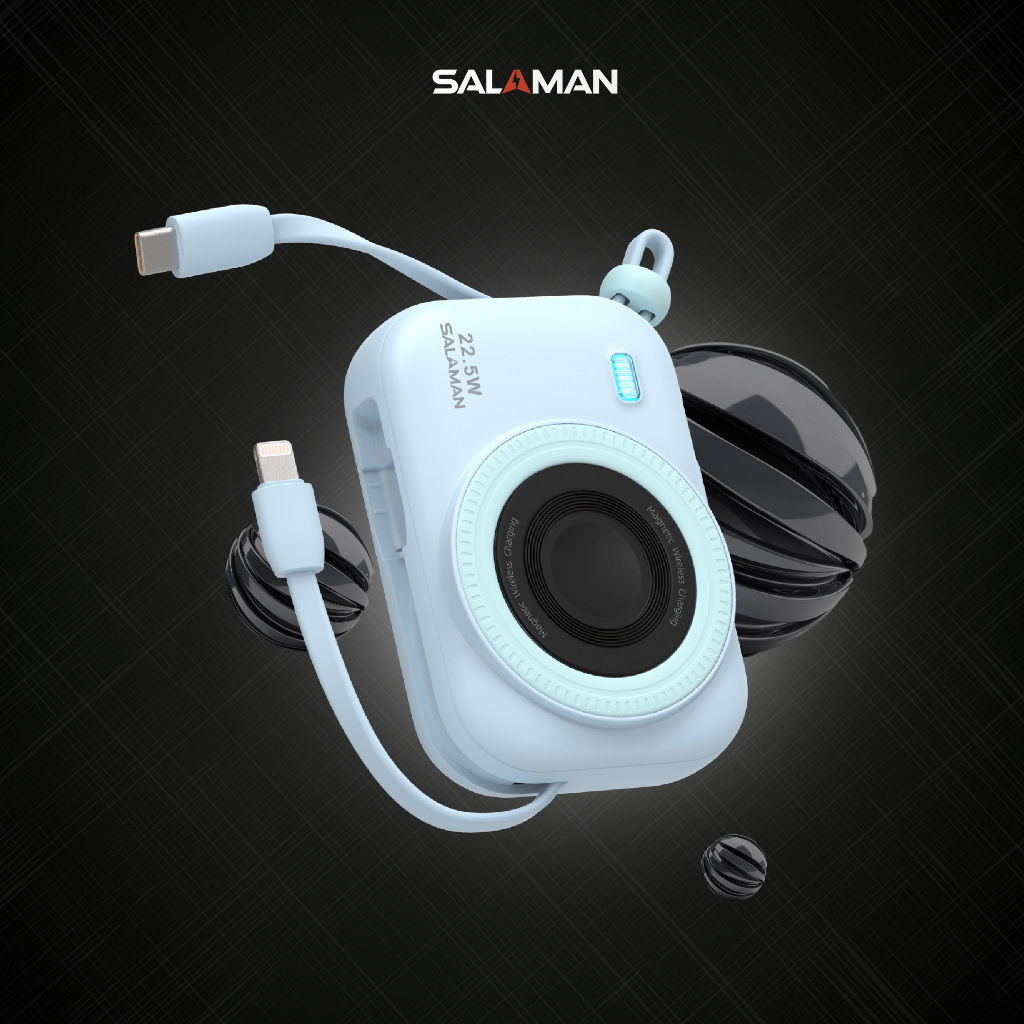 Sạc dự phòng Salaman Lensmate 10000mAh PD 22.5W, Sạc ko dây, Tích hợp 2 dây TypeC + IP, BH12 tháng