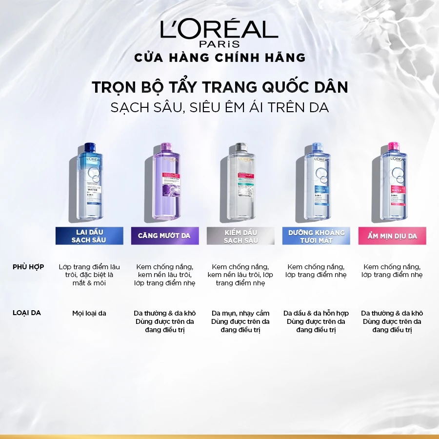 Nước tẩy trang 3-in-1 L'Oreal Paris Micellar Water làm sạch sâu, loại bỏ bụi bẩn và lớp trang điểm