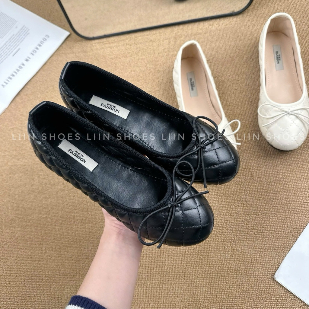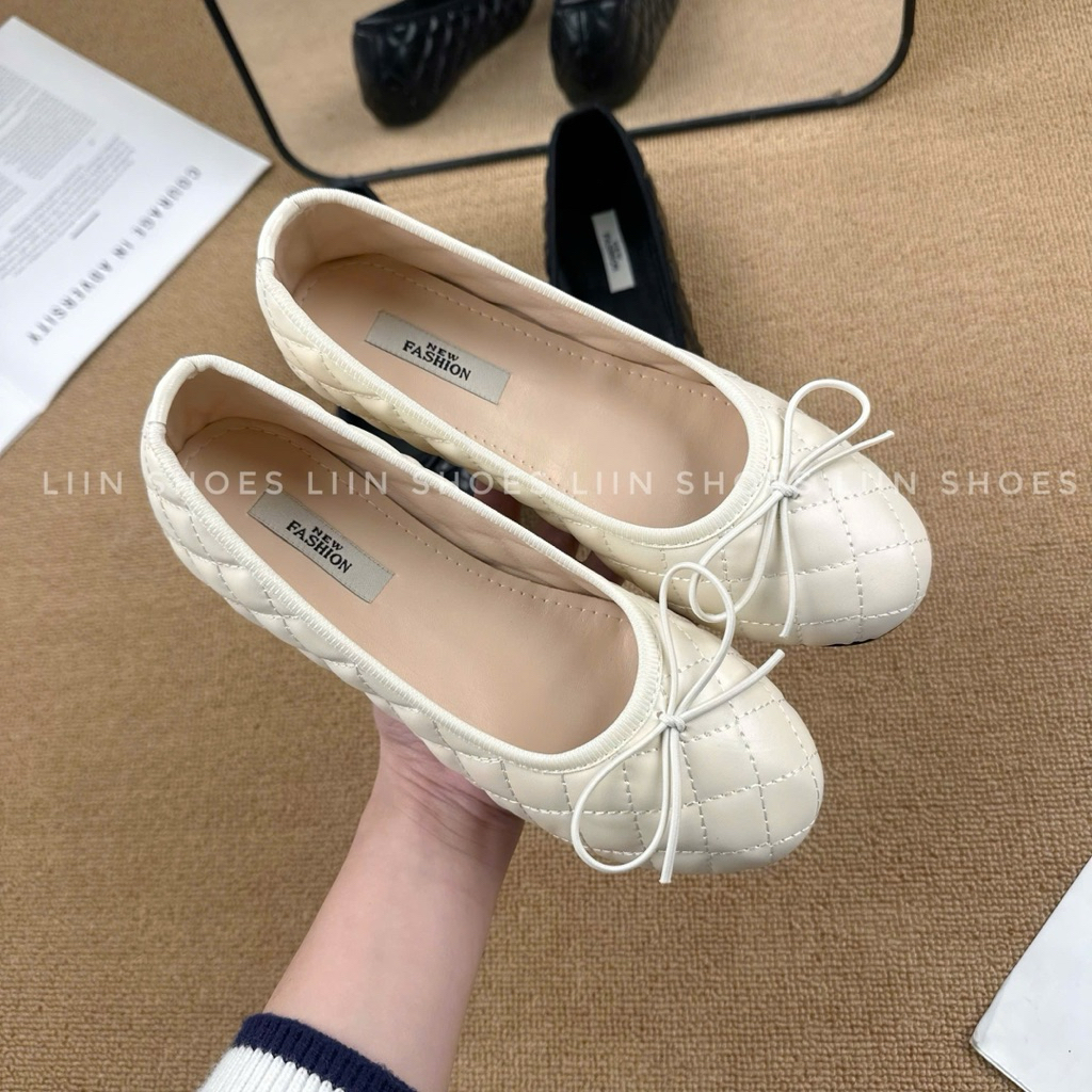 Giày búp bê mix nơ chun thêu ô trám