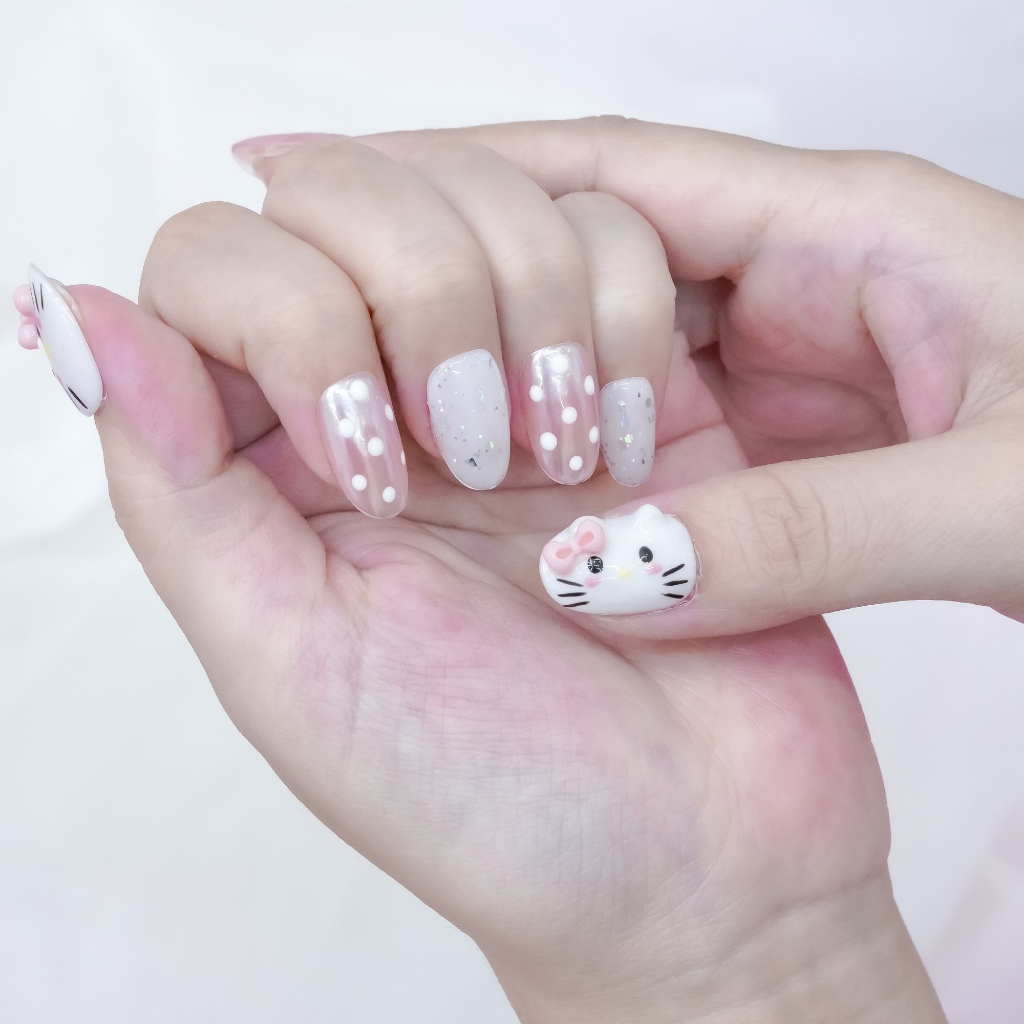[M233] - Kimsu Nailbox Hello Kitty chấm bi đắp gel tai nổi đính nơ (form tròn ngắn)