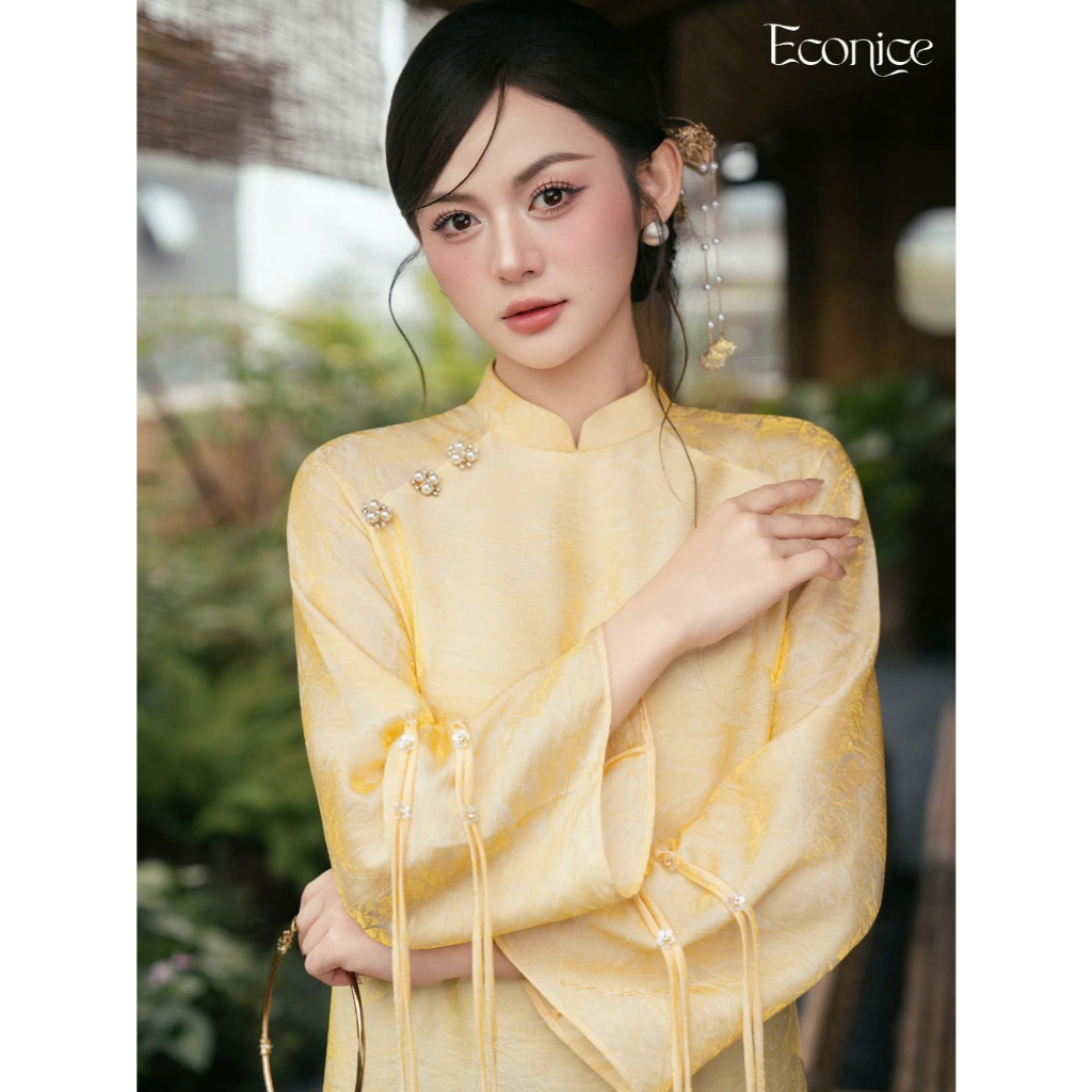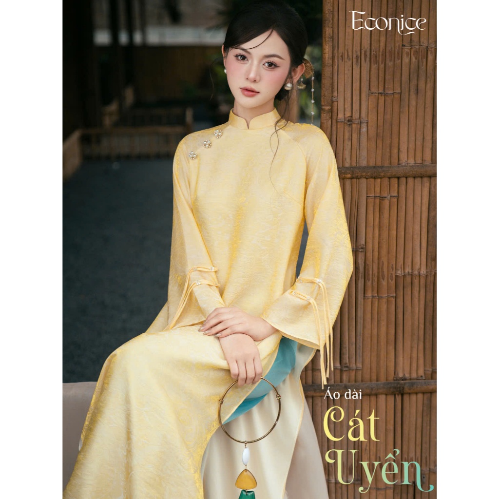 Áo Dài ( CÁT UYỂN ) 4 Tà Cách Tân Vải Tơ Tằm óng Hoạ Tiết Kêt Hơp Tay Xếp Loe Cách Điệu- ÁO DÀI CHỤP HÌNH