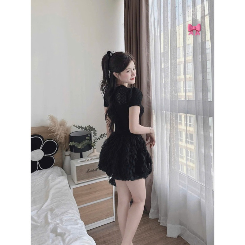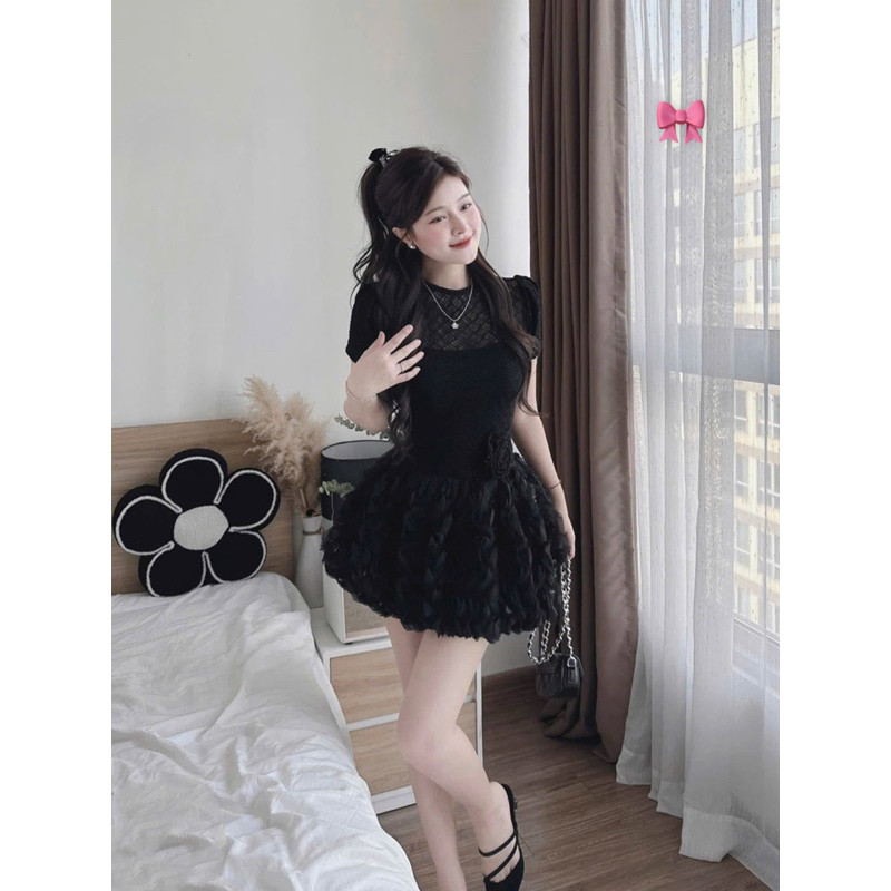 Đầm thiết kế ren tay phồng đính hoa phối tơ sóng dự tiệc sang chảnh kèm quần