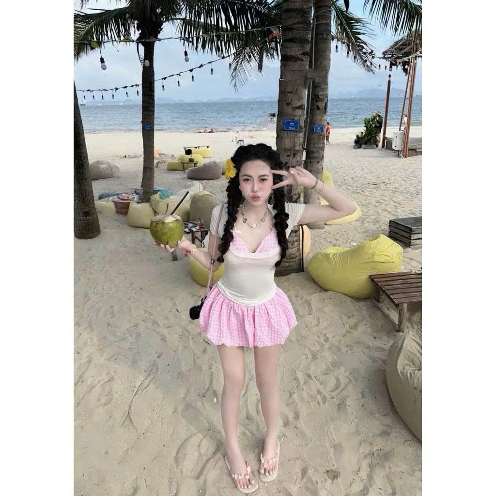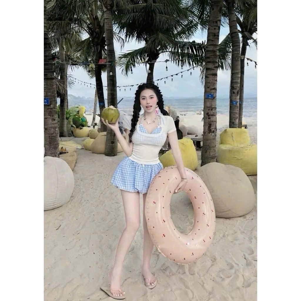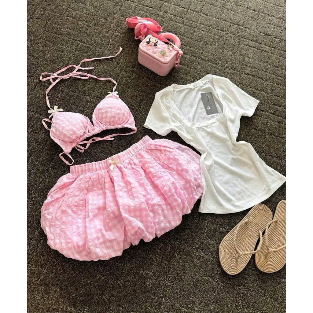 Set bikini đi biển, kèm áo thun tay ngắn, áo bra, quần bí màu pastel dễ thương
