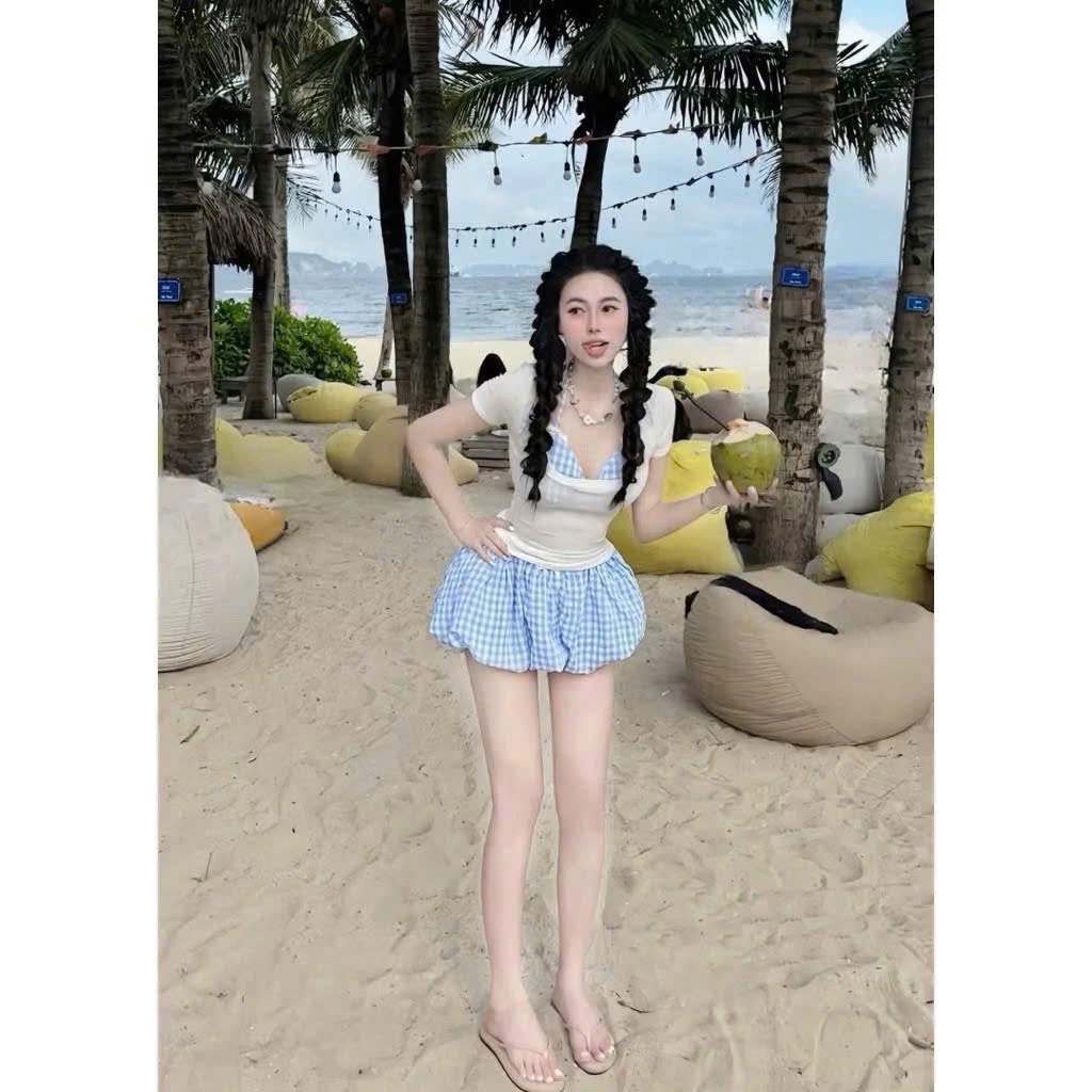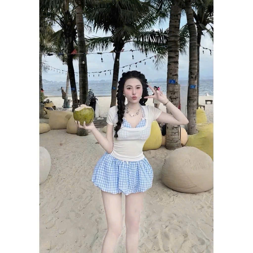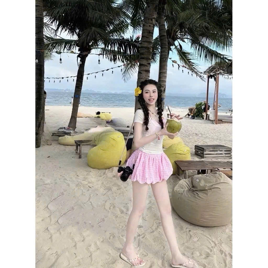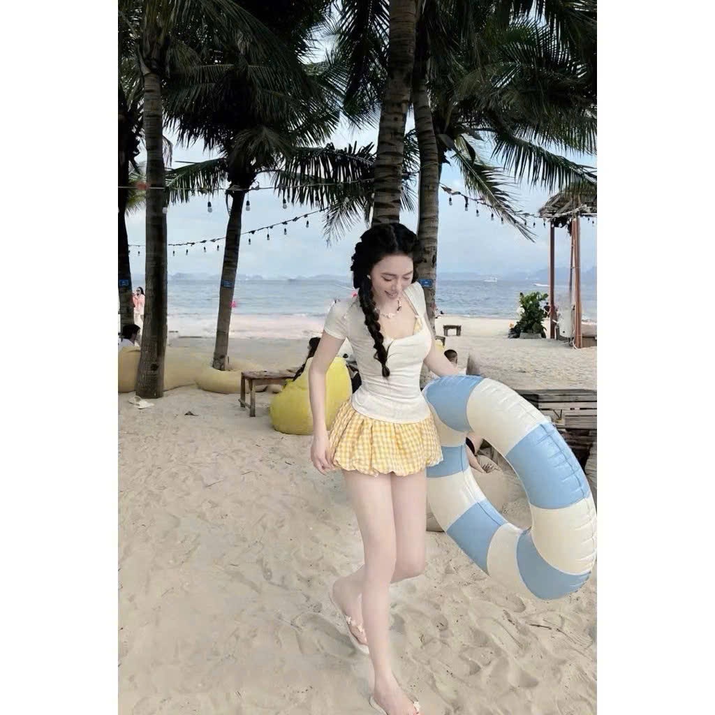 Set bikini đi biển, kèm áo thun tay ngắn, áo bra, quần bí màu pastel dễ thương
