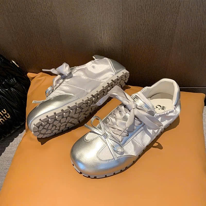 Giày sneaker nữ phong cách công chúa Hàn Quốc, Giày nữ đế bệt, đính nơ, thiết kế da bóng trendy A03