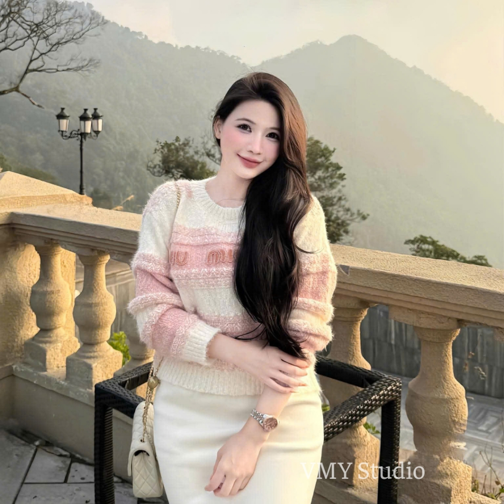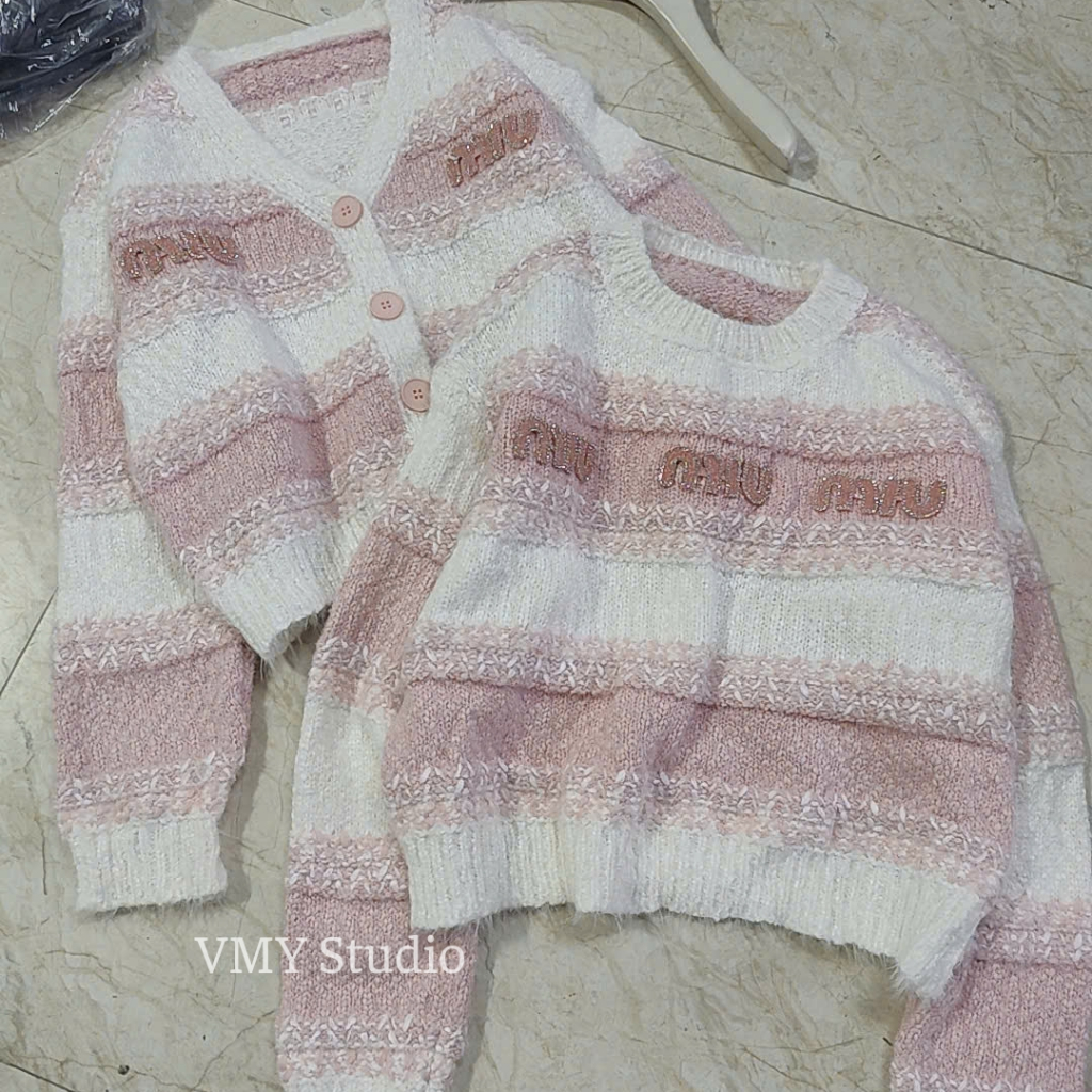 VMY Studio - Áo len kẻ hồng MIUMIU dài tay QCCC xinh xắn, áo len cardigan cổ tim dài tay phong cách Hàn Quốc