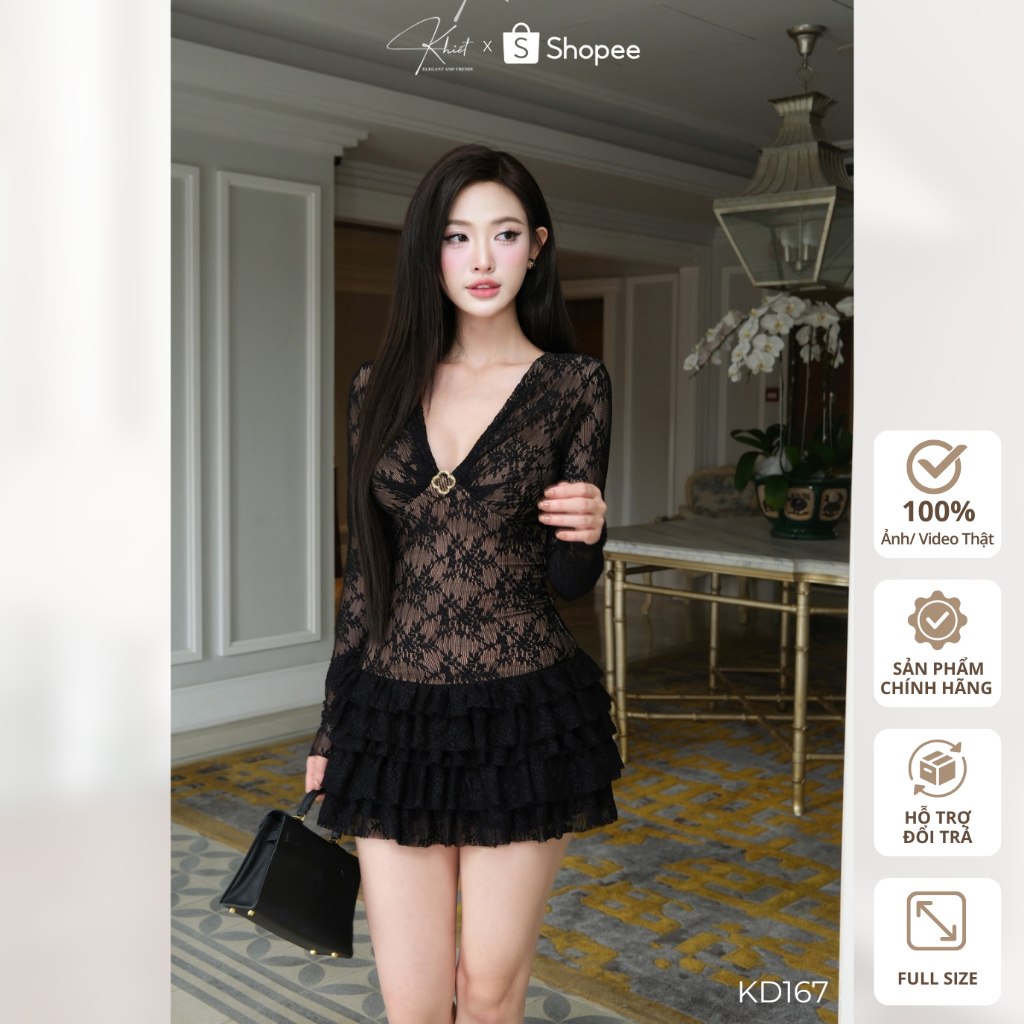 Đầm ren đen tay dài phối tầng bèo quyến rũ Khiết Style phong cách tiệc tùng sang trọng KD167
