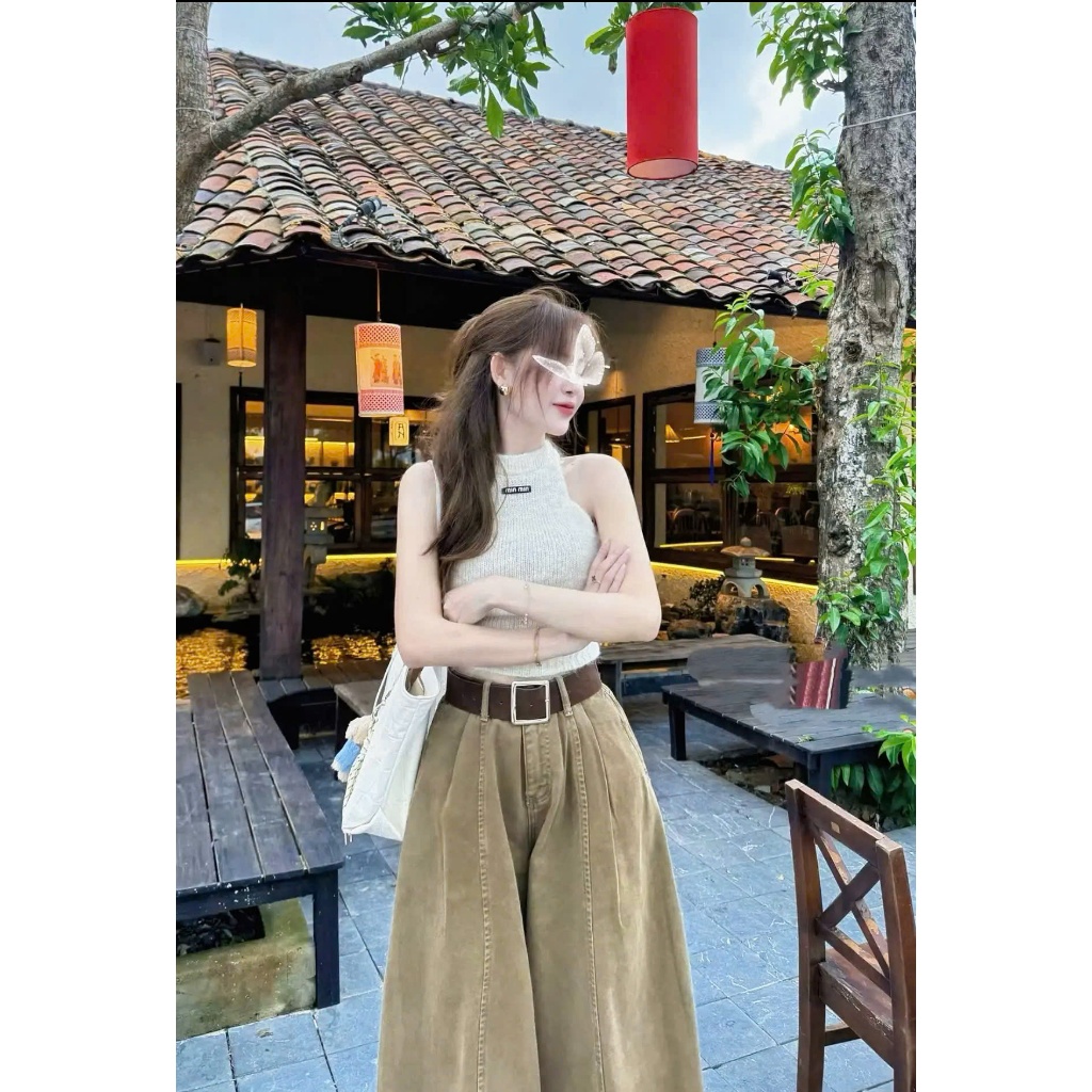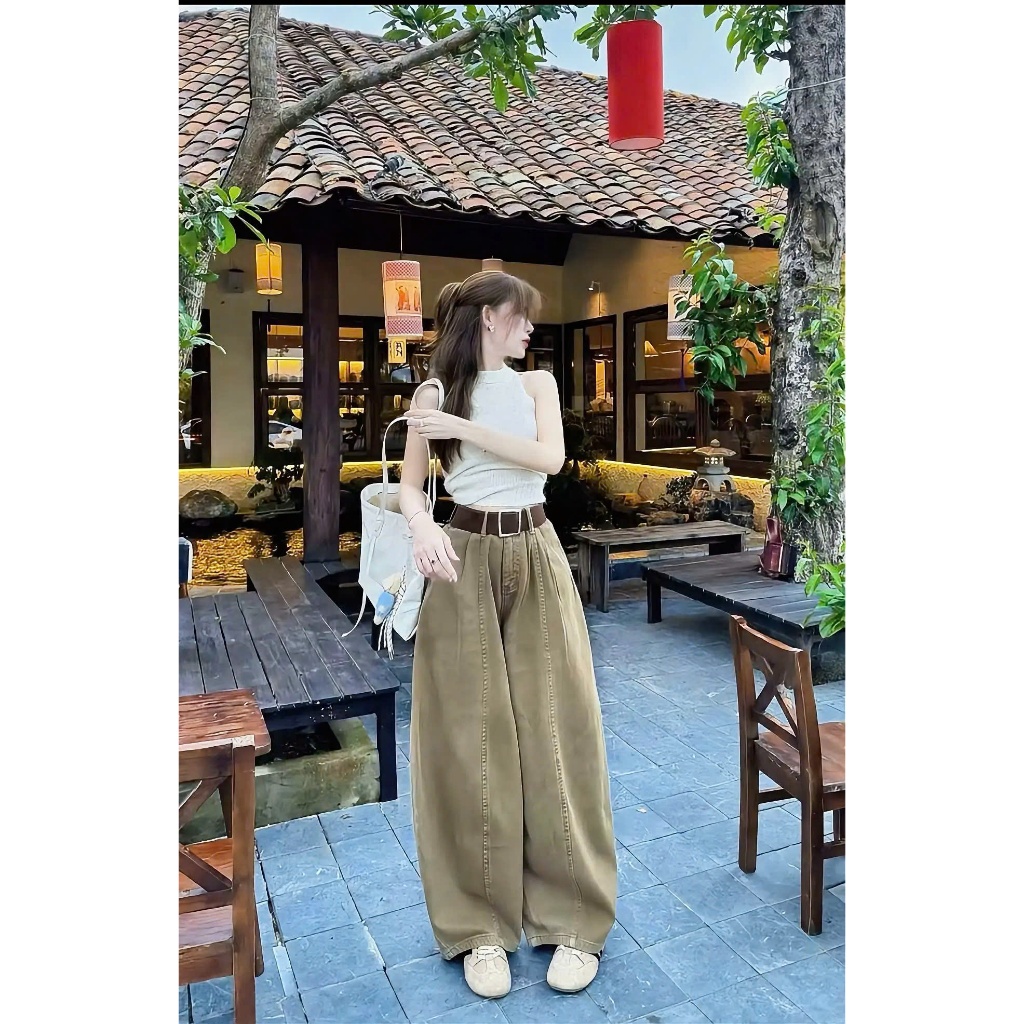 (S-XL) Quần jean nữ ống rộng wash nâu cạp cao tôn dáng tôn da dáng dài chất jean mềm