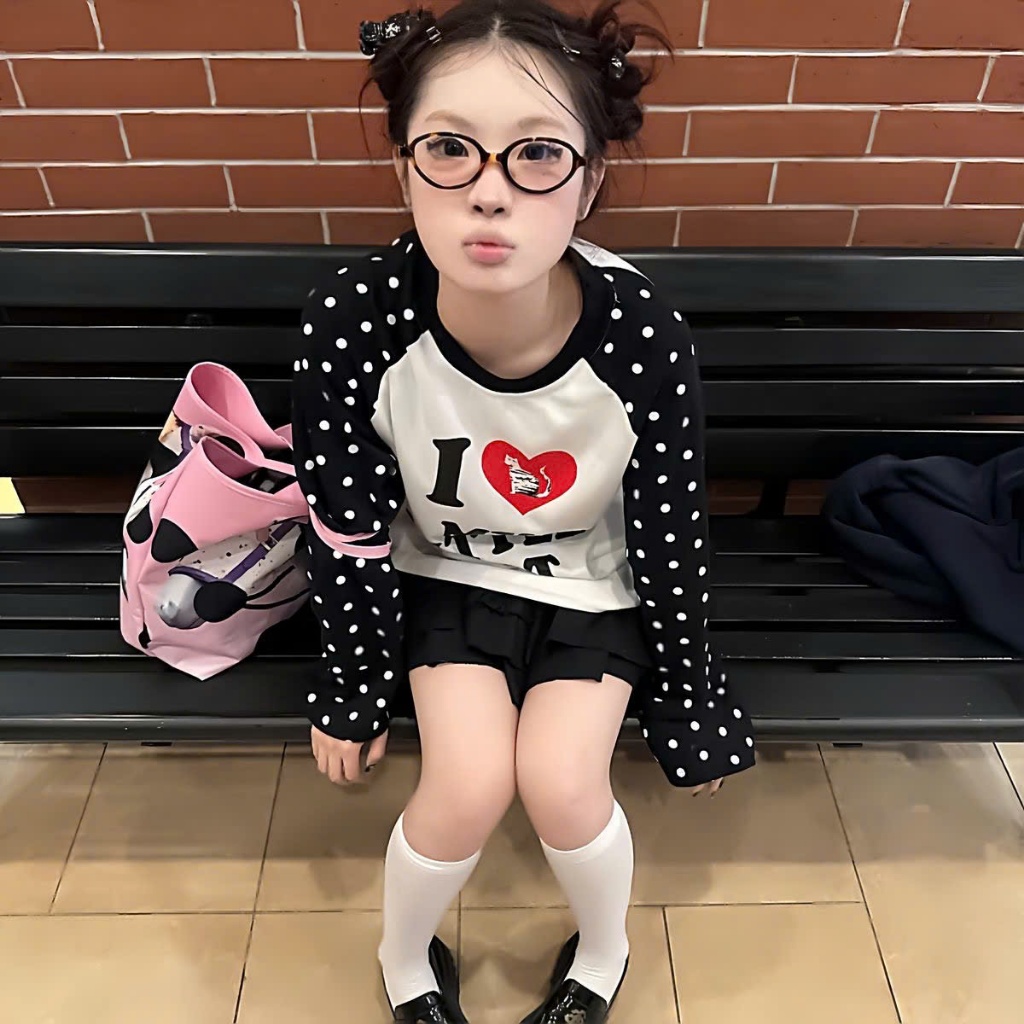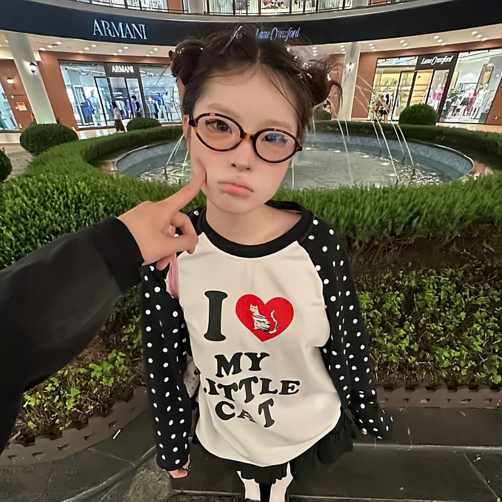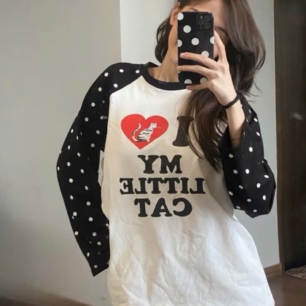 Áo thun dài tay tay phối chấm bi, in hình I LOVE MY LITTLE CAT phong cách dễ thương, năng động