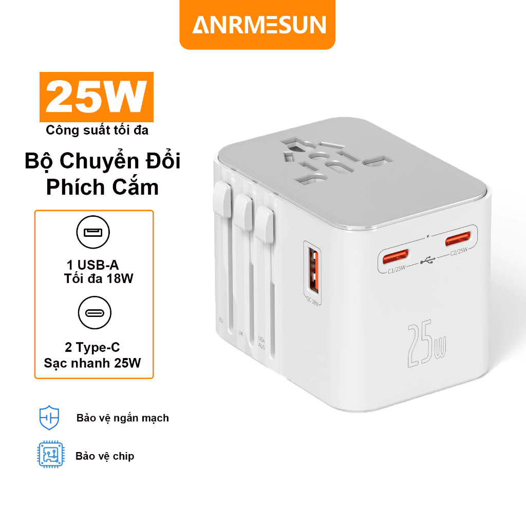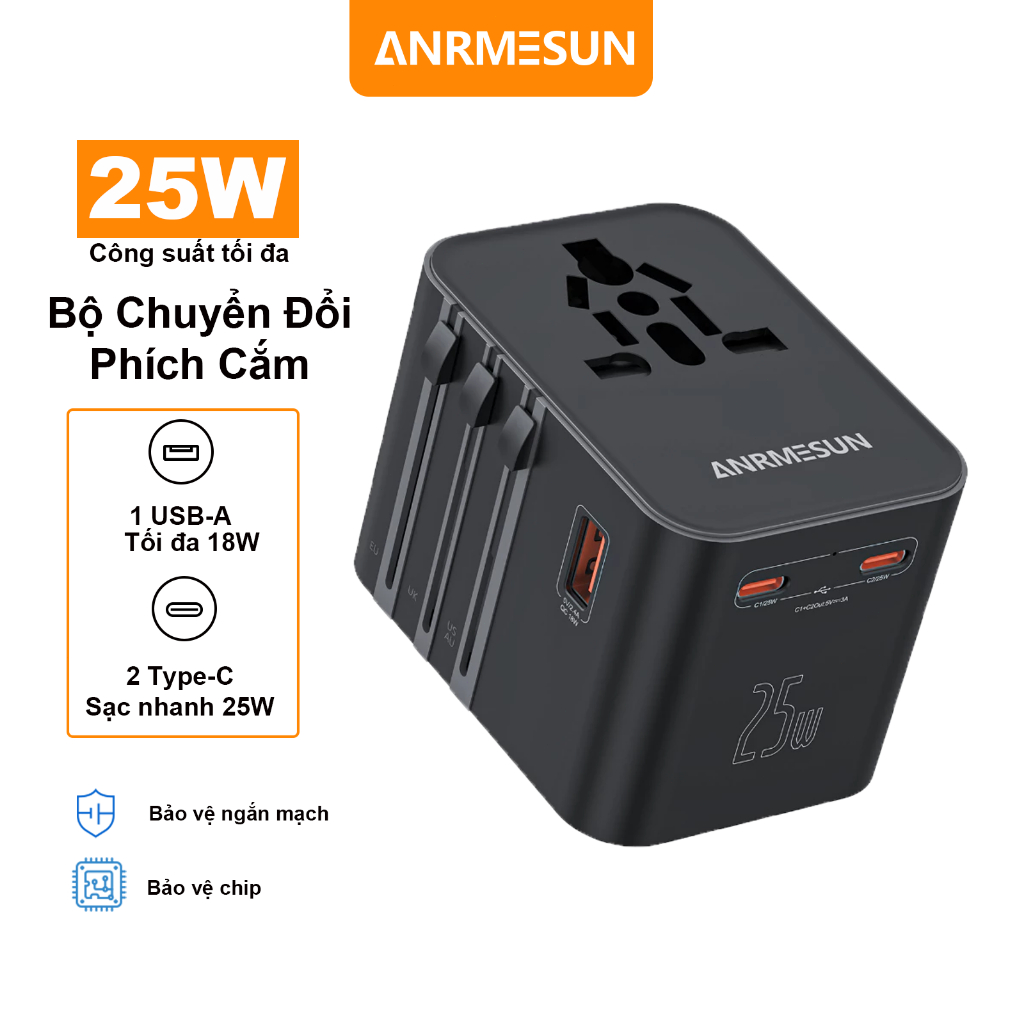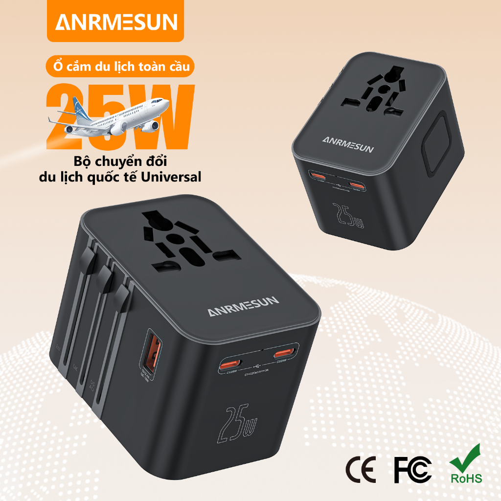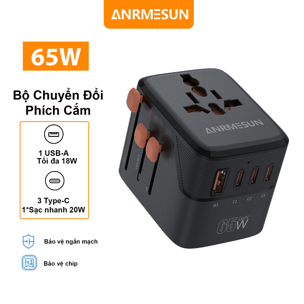 Ổ Cắm Du Lịch toàn cầu ANRMESUN, 25W 45W 65W công suất,USB TypeC Hỗ trợ sạc nhanh,Bảo vệ quá tải tích,4 Loại Chân Că