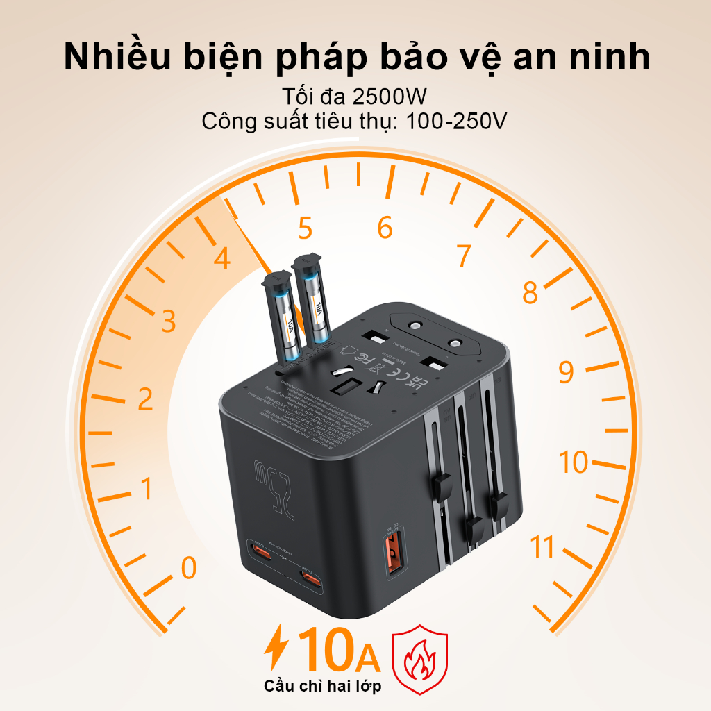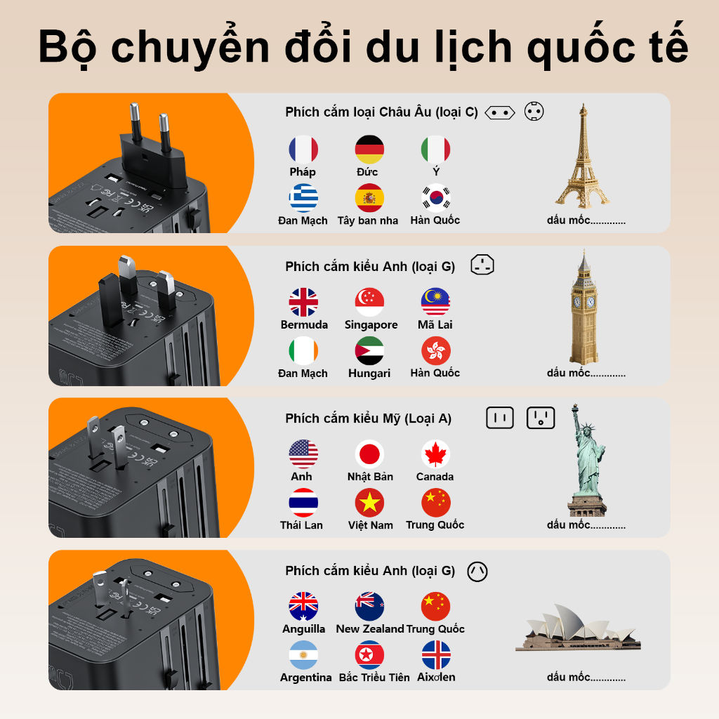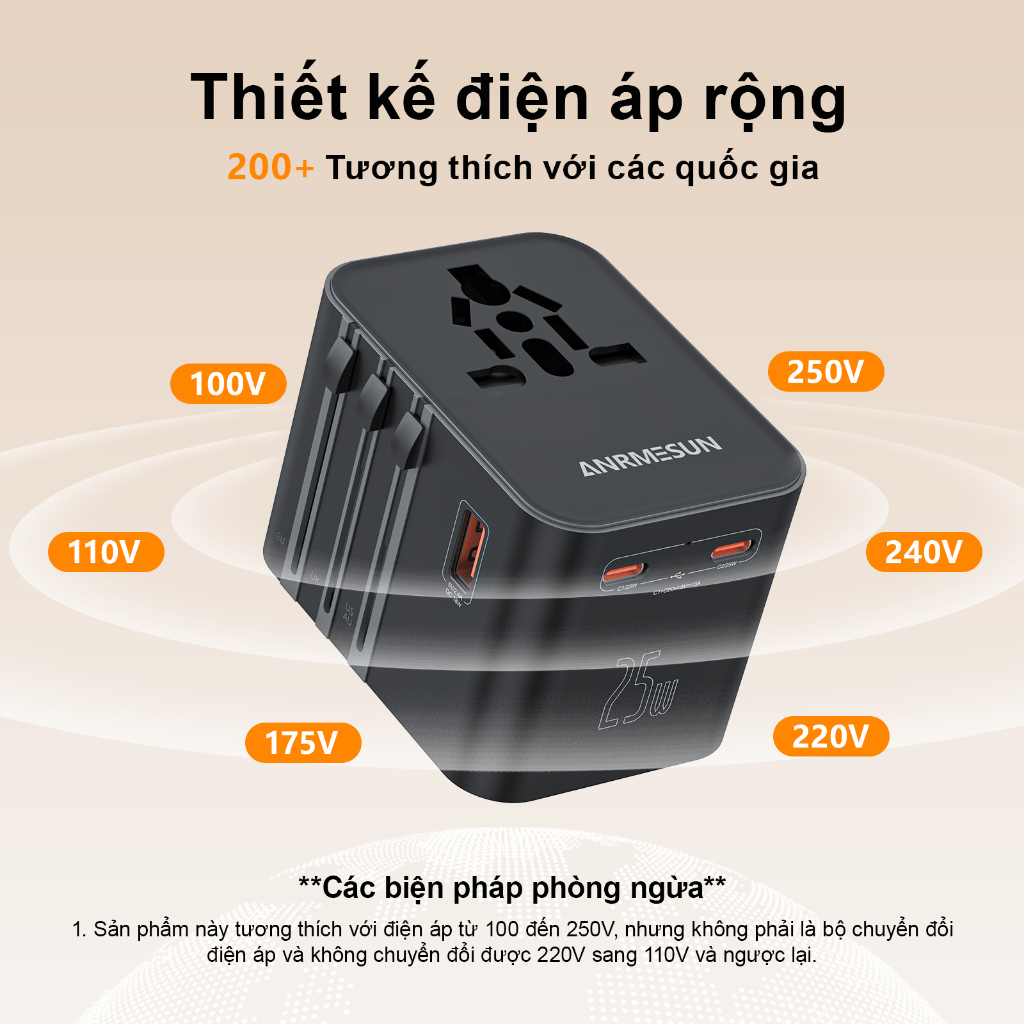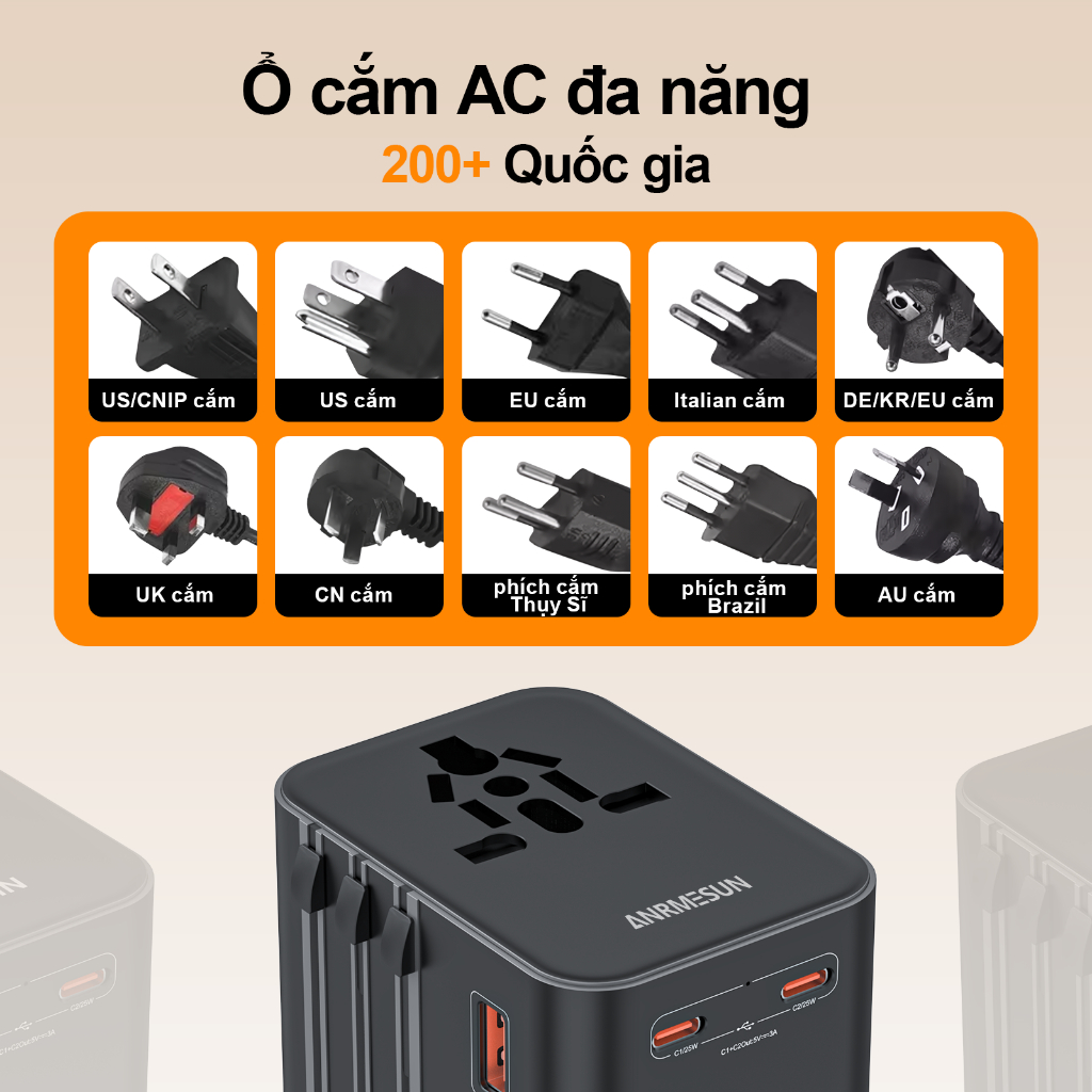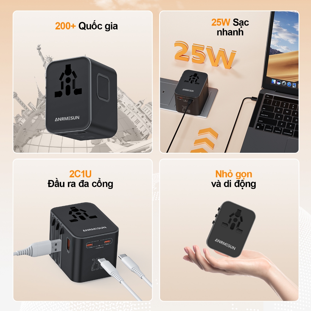 Ổ Cắm Du Lịch toàn cầu ANRMESUN, 25W 45W 65W công suất,USB TypeC Hỗ trợ sạc nhanh,Bảo vệ quá tải tích,4 Loại Chân Că