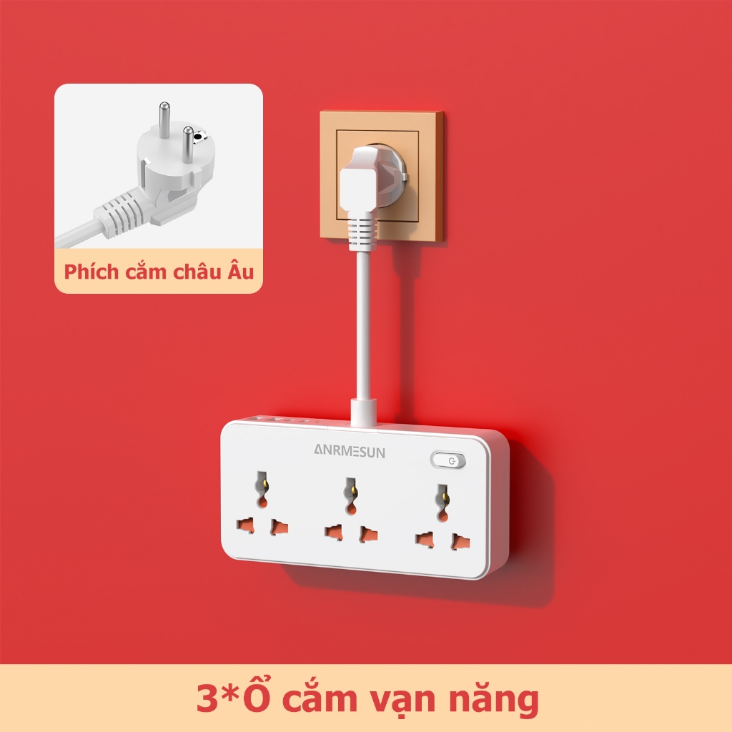 Ổ cắm Điện Đa Năng ANRMESUN 2400W Công Suấ Tích Hợp Cổng 2 USB & 2 Type-C Sạc Nhanh PD20W Chống Cháy Bảo Vệ Quá Tải