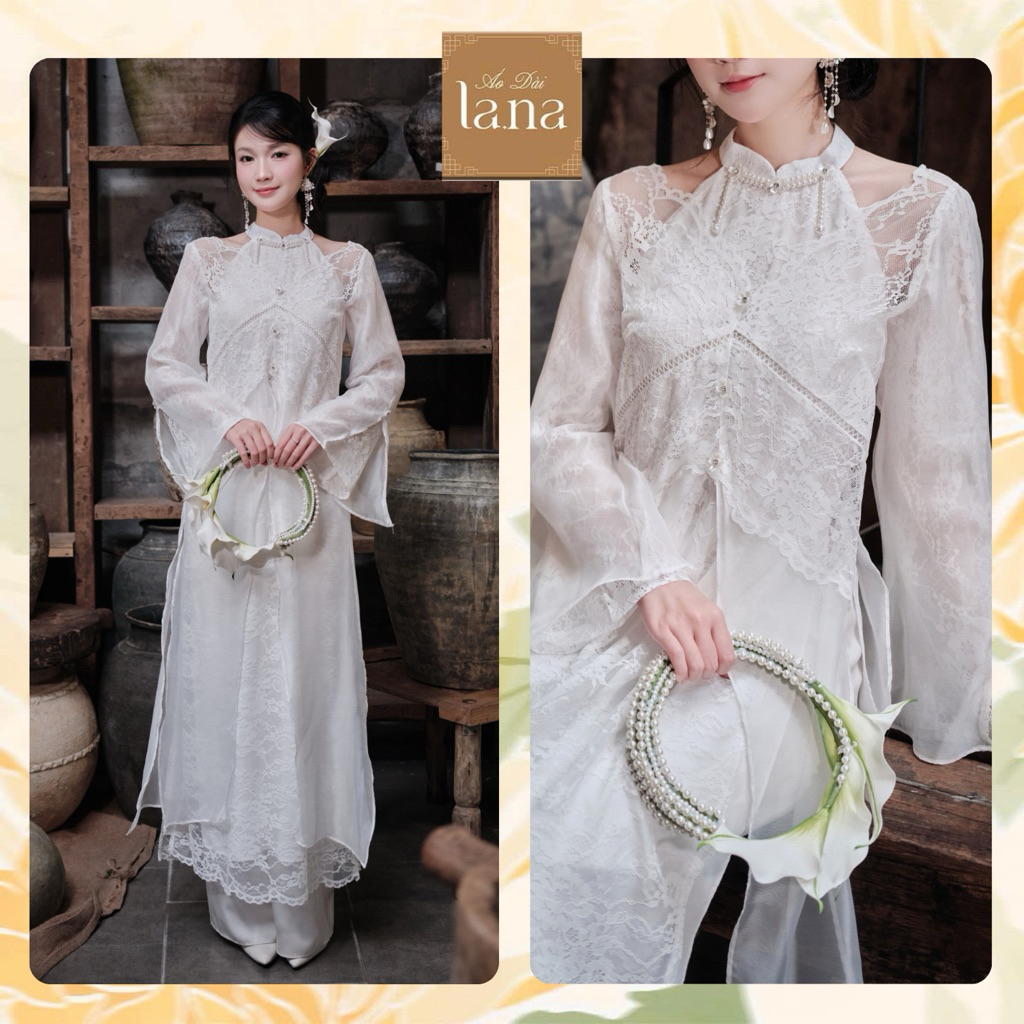 Áo dài cách tân Uyển Ngọc Trang dáng giả yếm cutout vai phối vải ren hoa chìm phối tằm óng nhẹ – SD396 LANA DESIGN