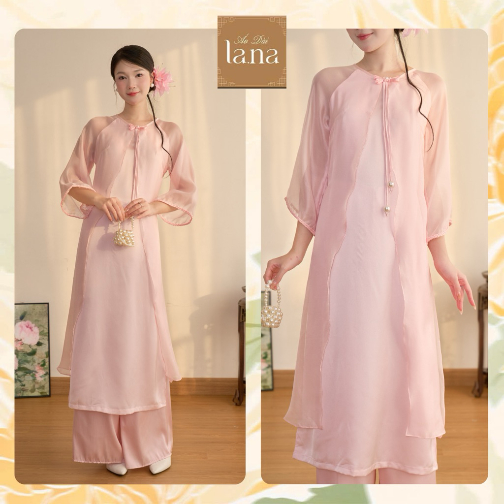 Áo dài thiết kế Từ Nhiên hồng chất lụa phối tơ mềm form suông 4 tà tơ bay nhẹ kèm quần lụa - SD257 LANA DESIGN