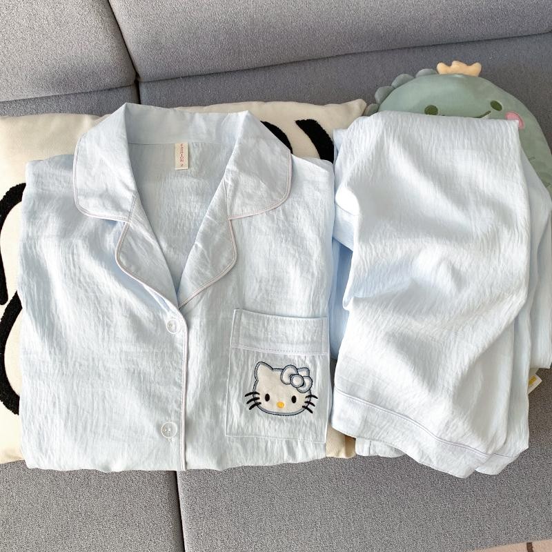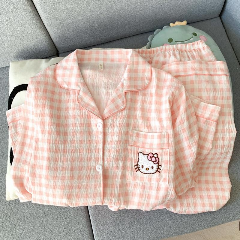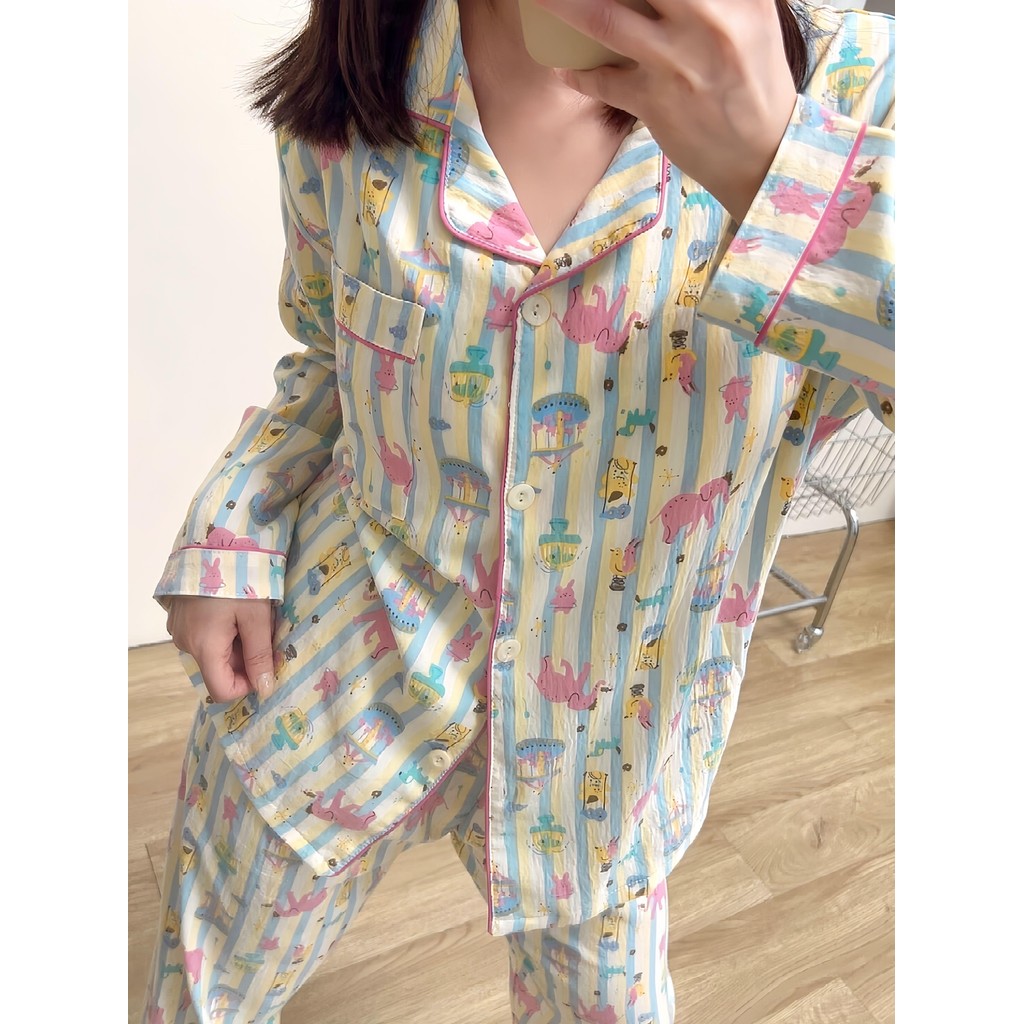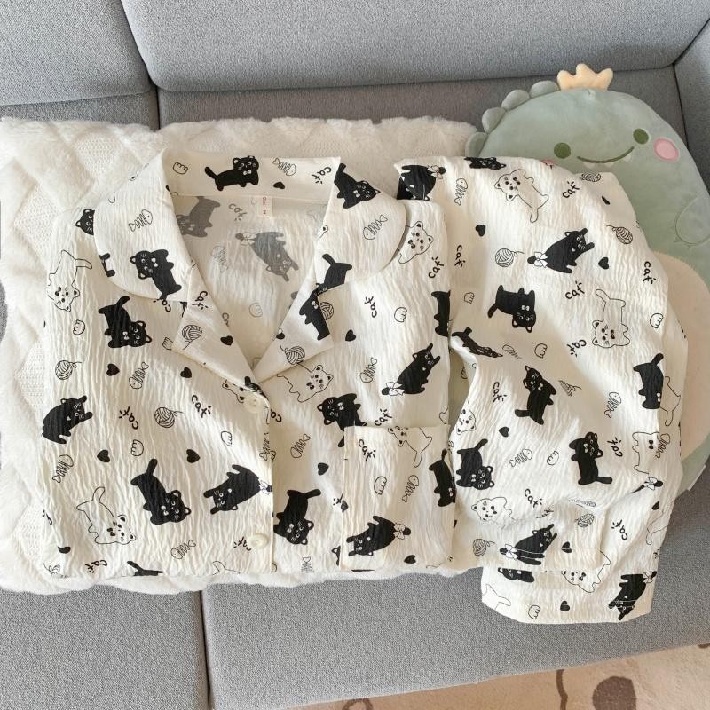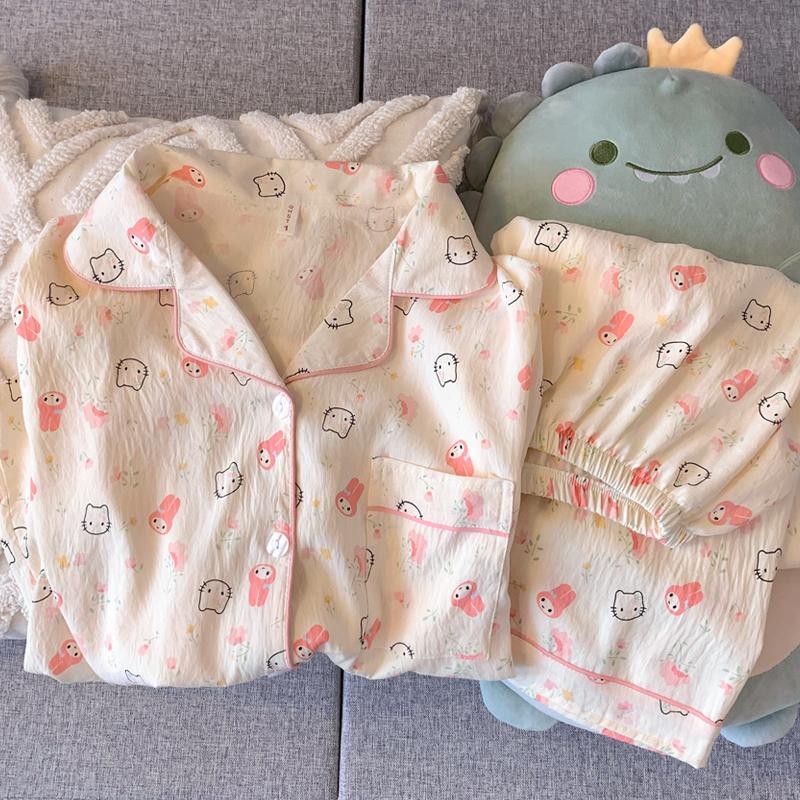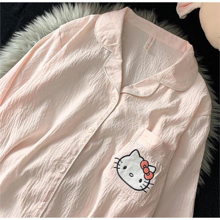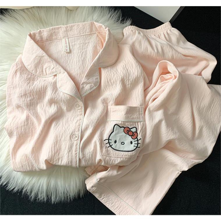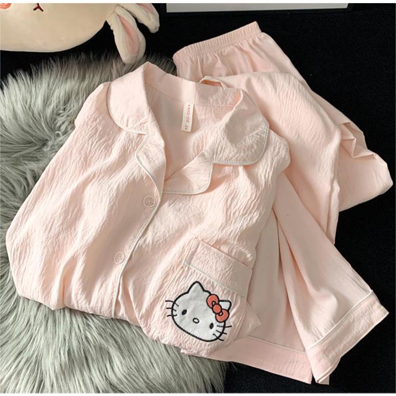 QHSW Bộ Đồ Ngủ Nữ satin Pink Pocket Cat Dài Tay Quần Nhập Khẩu