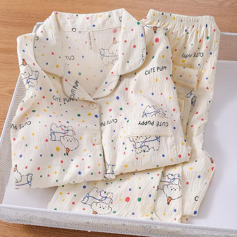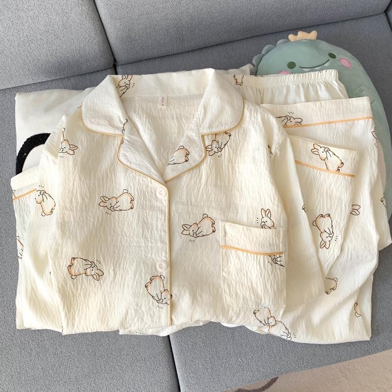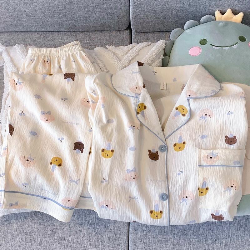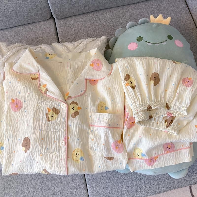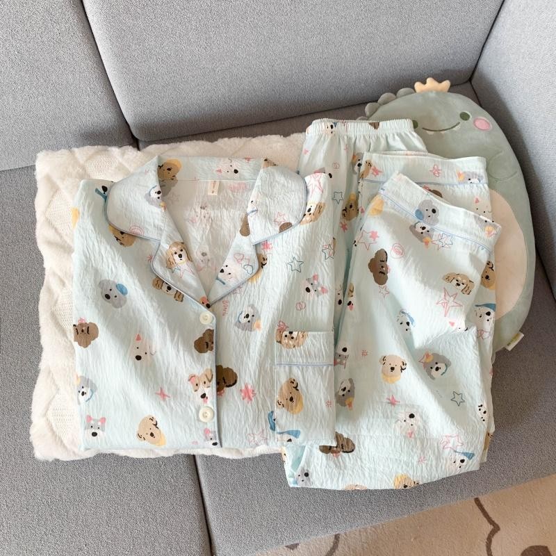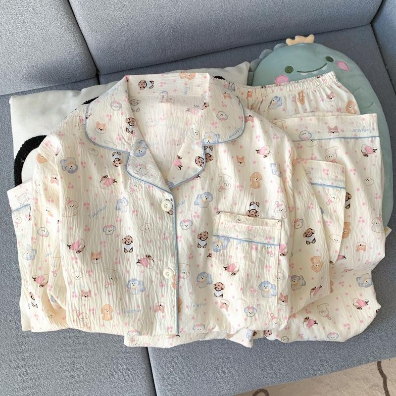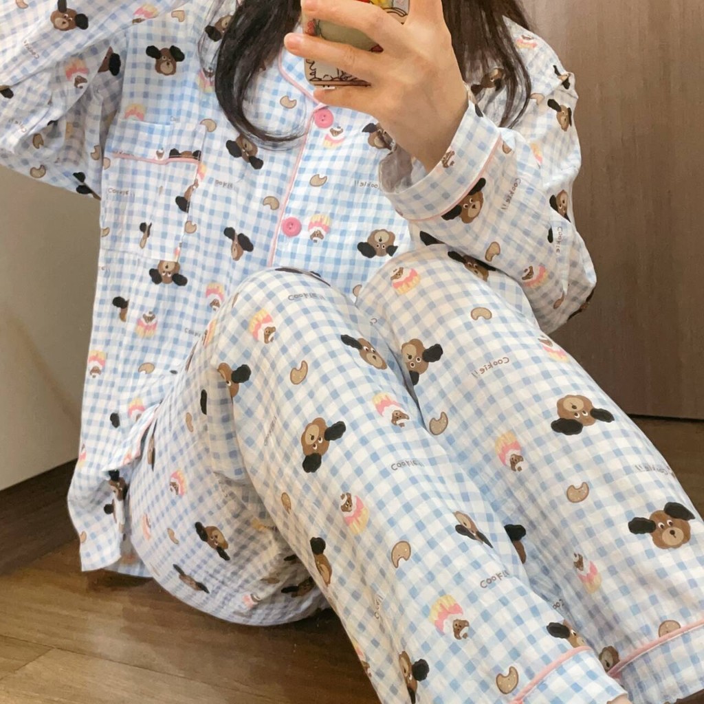 QHSW Bộ Đồ Ngủ Nữ satin Pink Pocket Cat Dài Tay Quần Nhập Khẩu