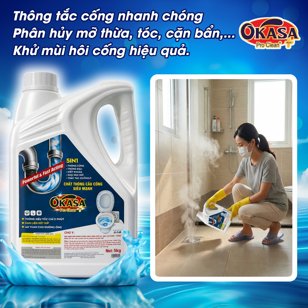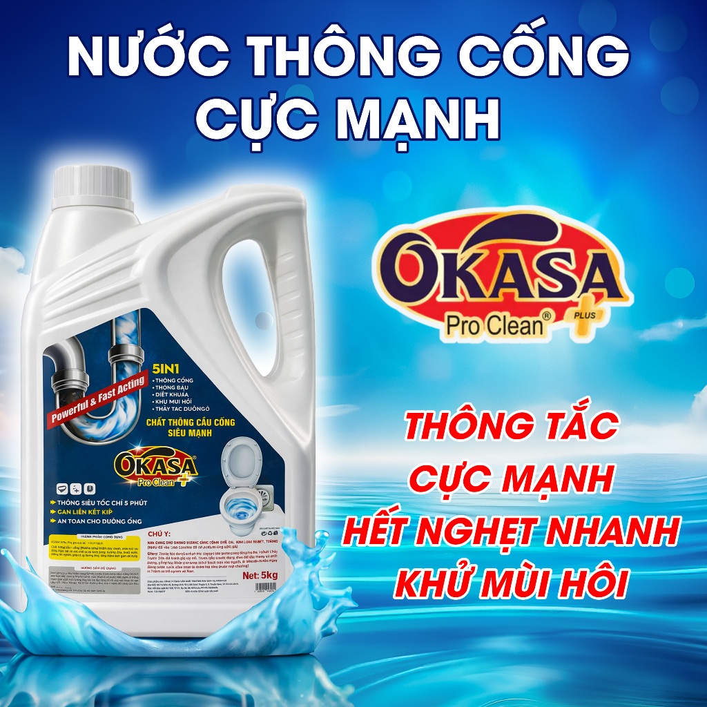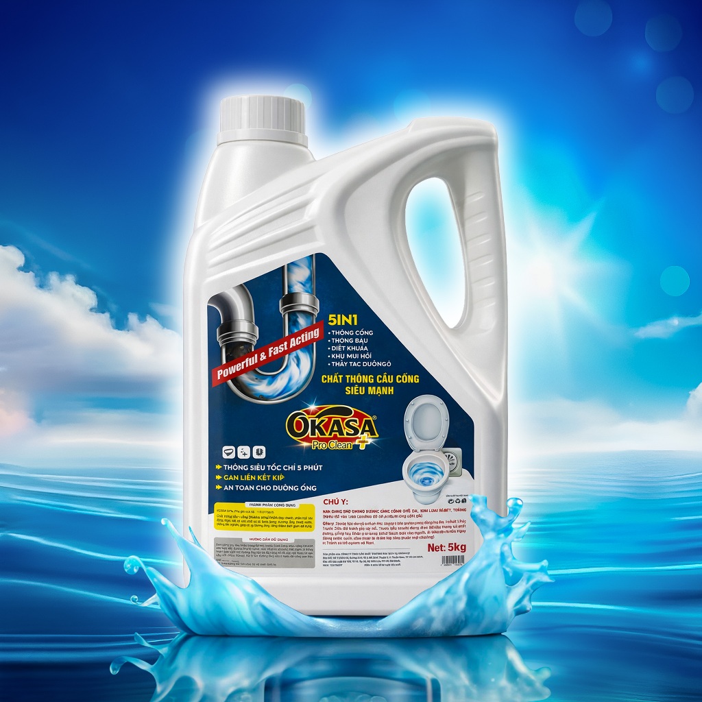 Nước thông cống OKASA 5KG siêu mạnh, thông tắc nhanh cống, bồn cầu, lavabo, phân hủy dầu mỡ, tóc và mọi chất thải.