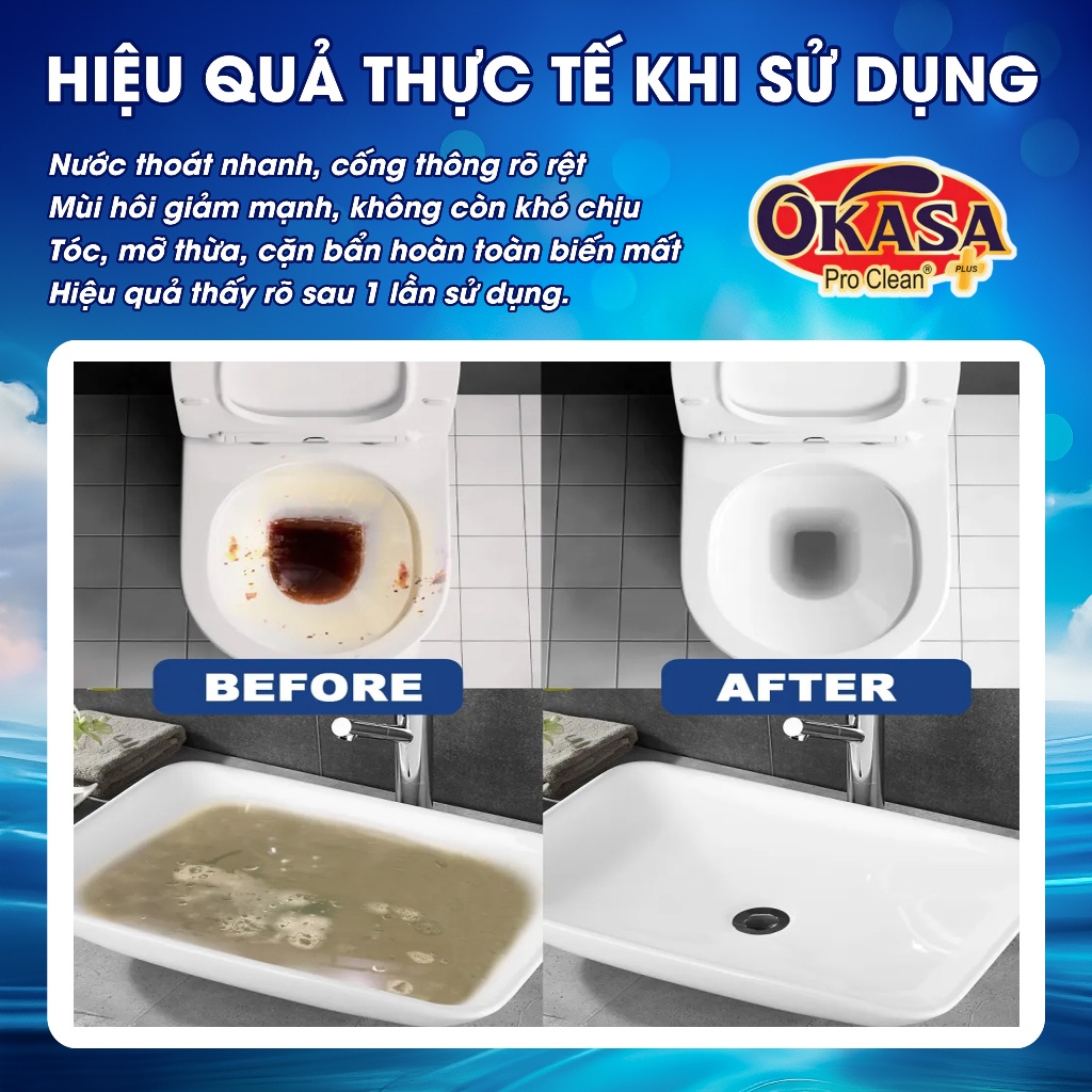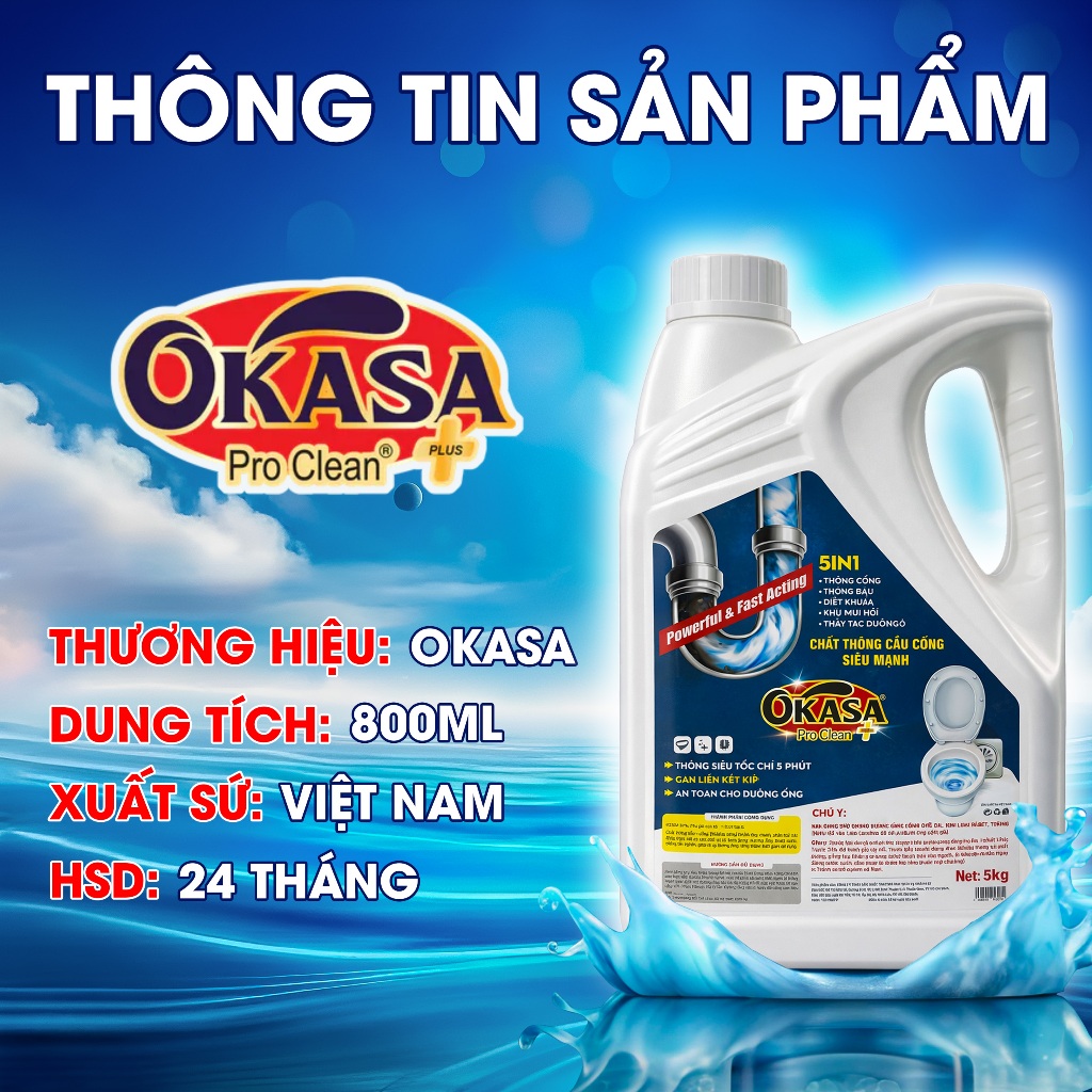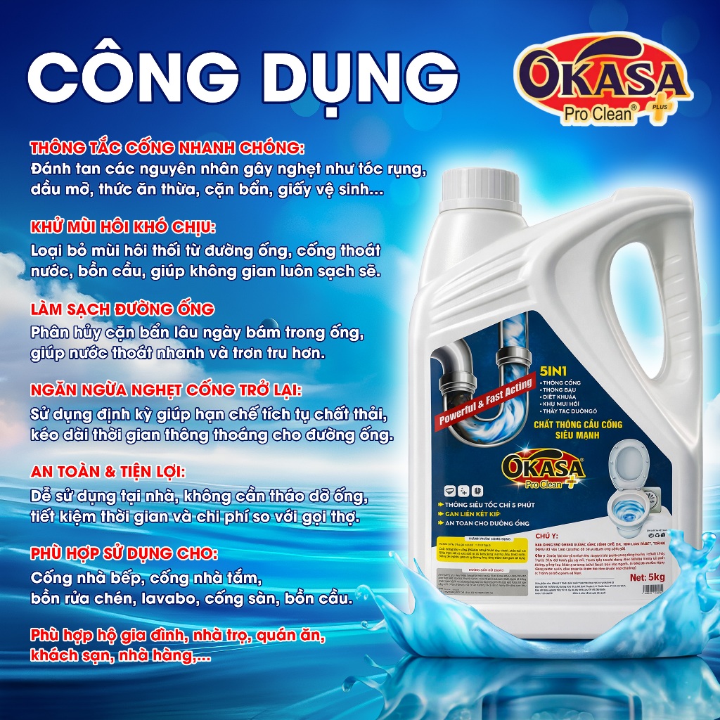 Nước thông cống OKASA 5KG siêu mạnh, thông tắc nhanh cống, bồn cầu, lavabo, phân hủy dầu mỡ, tóc và mọi chất thải.