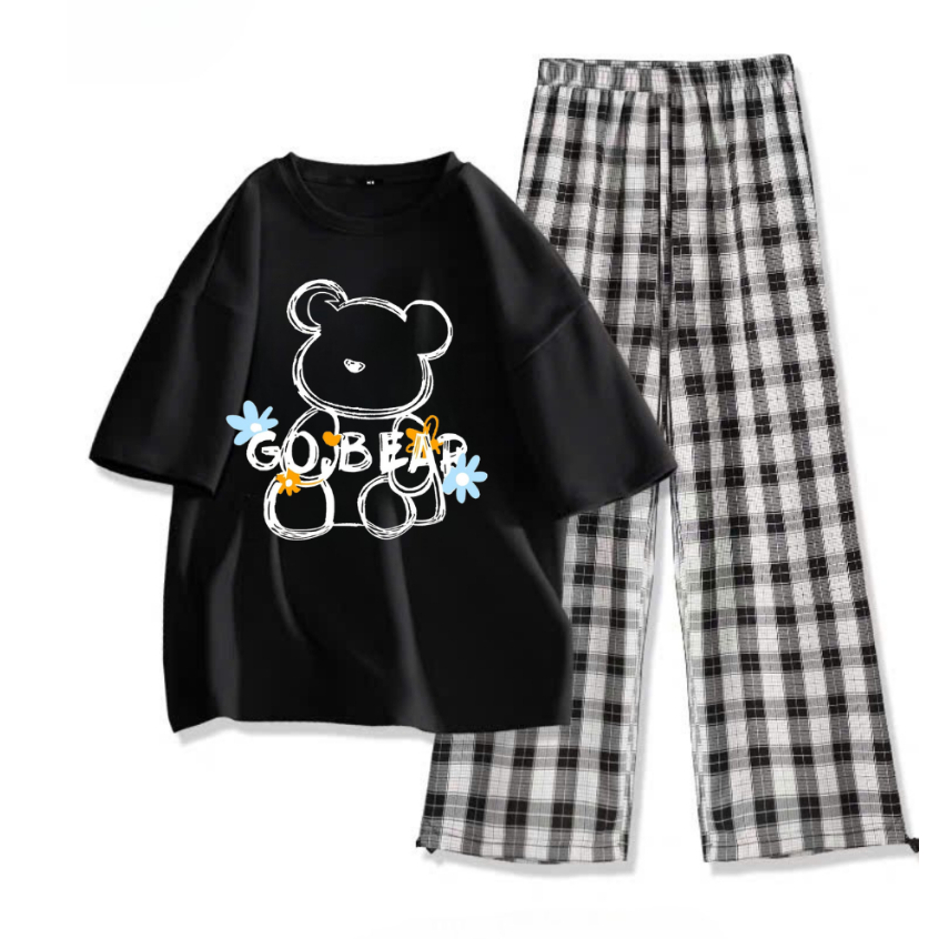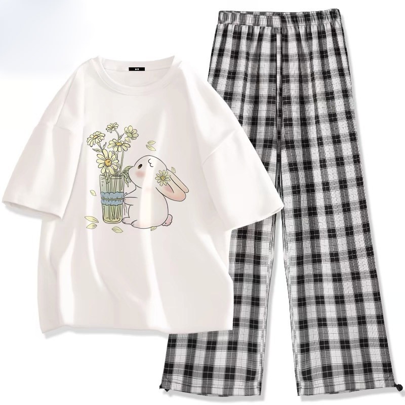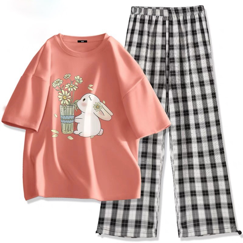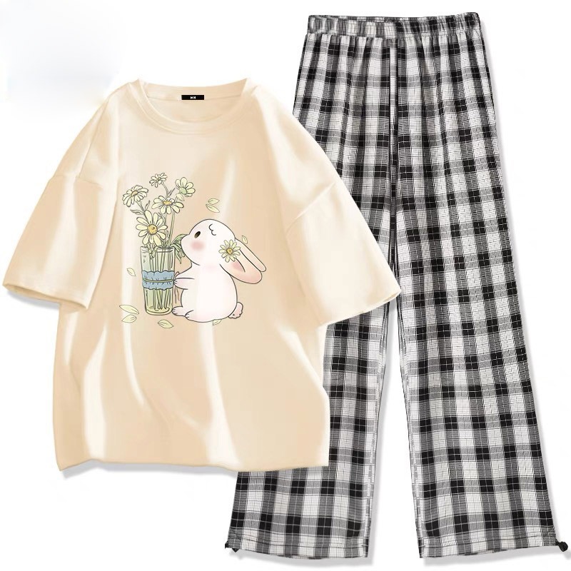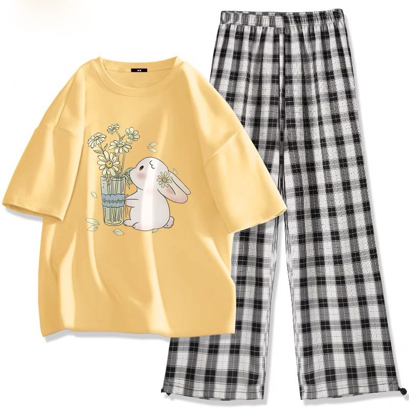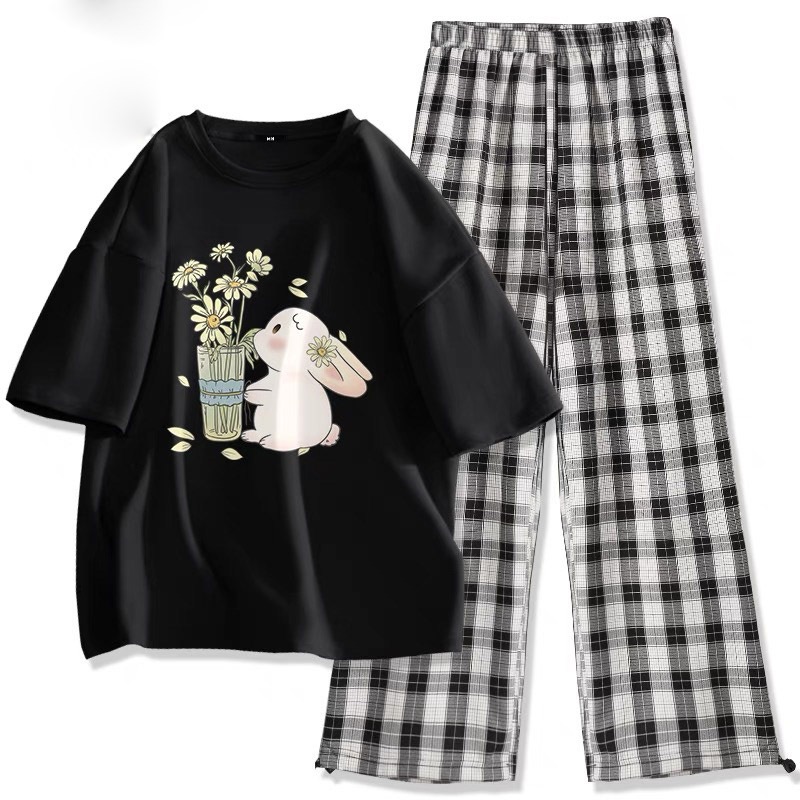 Set bộ dài áo thun cotton, quần suông caro to nữ thời trang. Đồ bộ mặc nhà, đi chơi in THỎ HOA