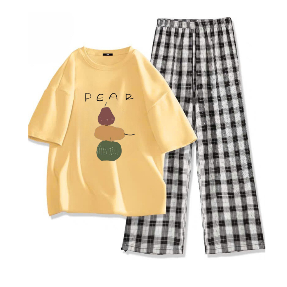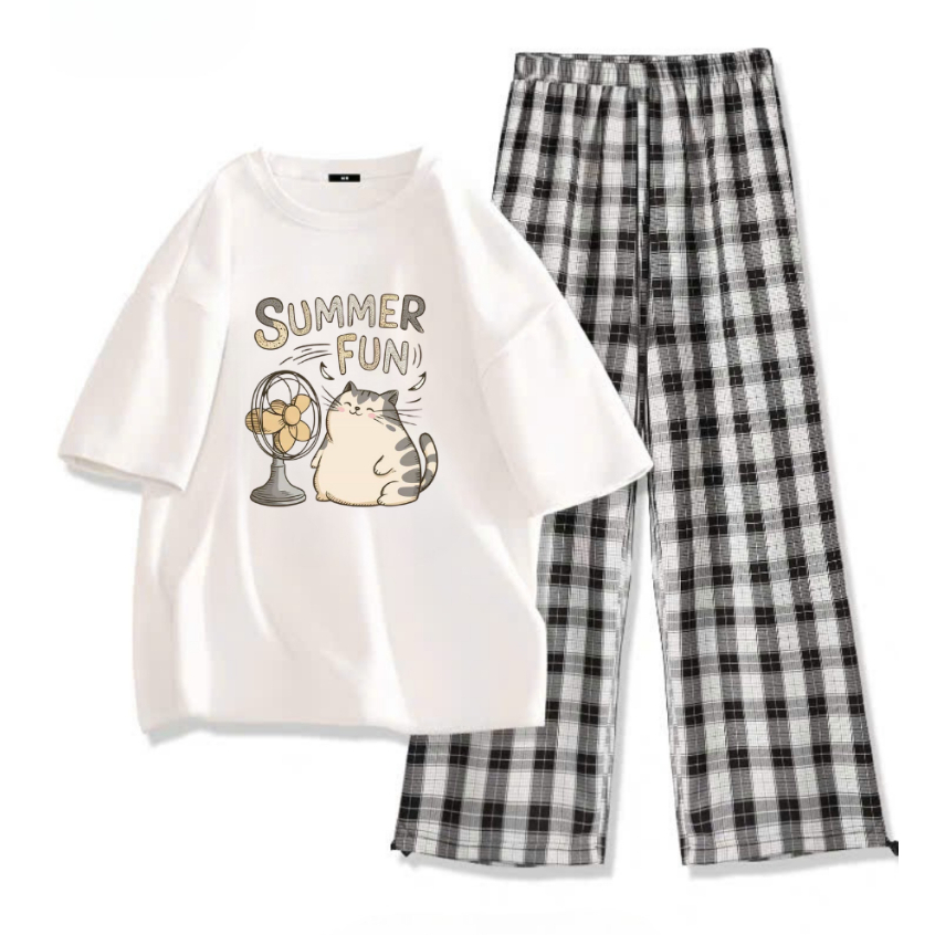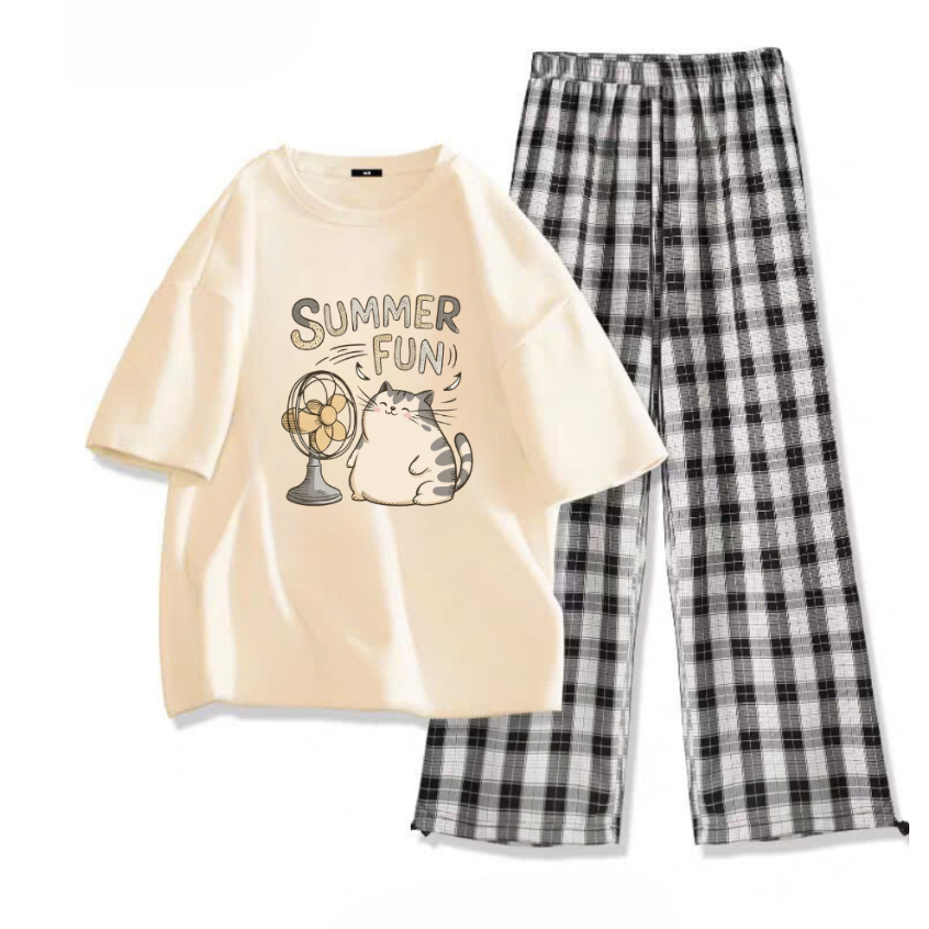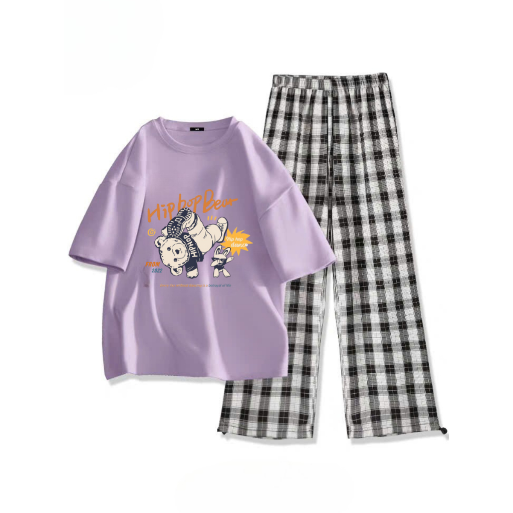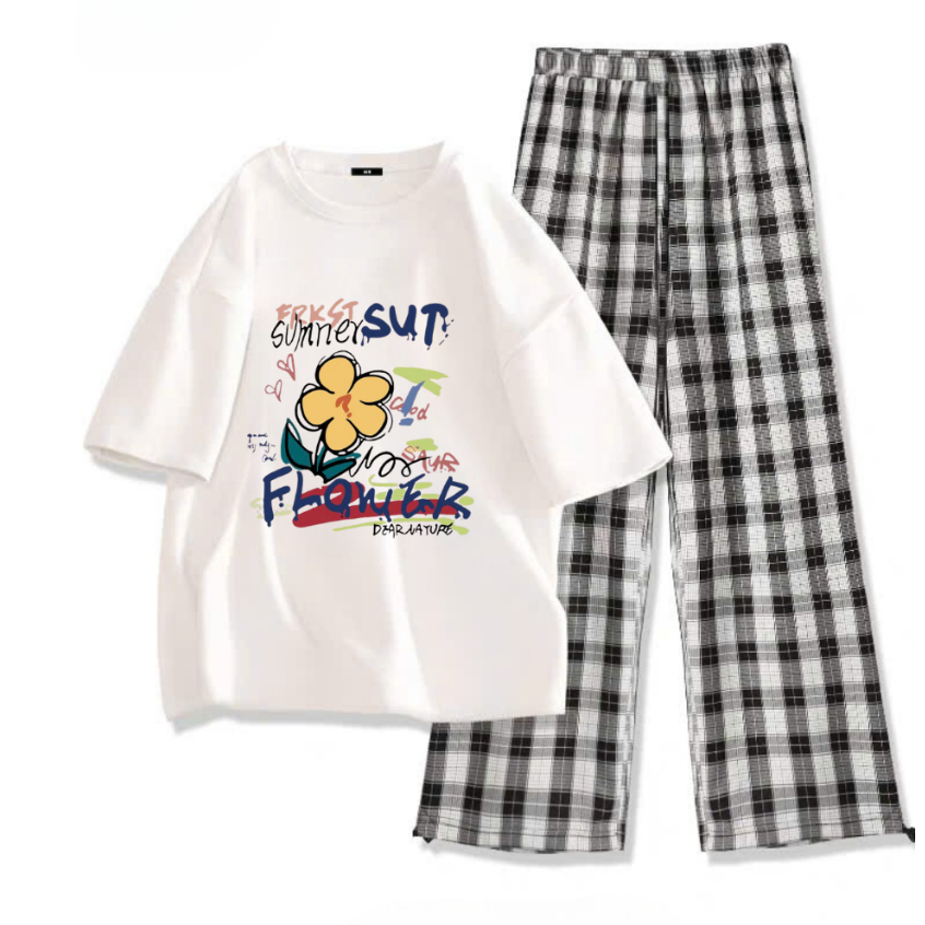 Set bộ dài áo thun cotton, quần suông caro to nữ thời trang. Đồ bộ mặc nhà, đi chơi in THỎ HOA