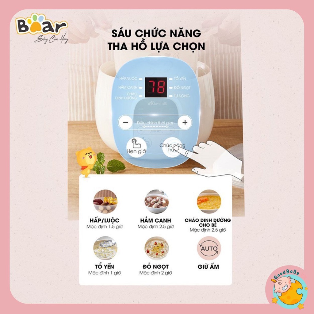 [Tặng Sổ Tay] Nồi Nấu Cháo Chậm, Nồi Ninh Hầm 6in1 BEAR 0,8L - Tiếng Việt Bảo hành 18m Goodbabyvn