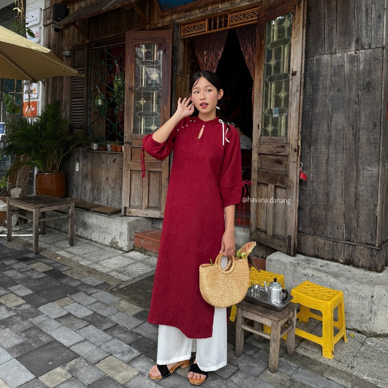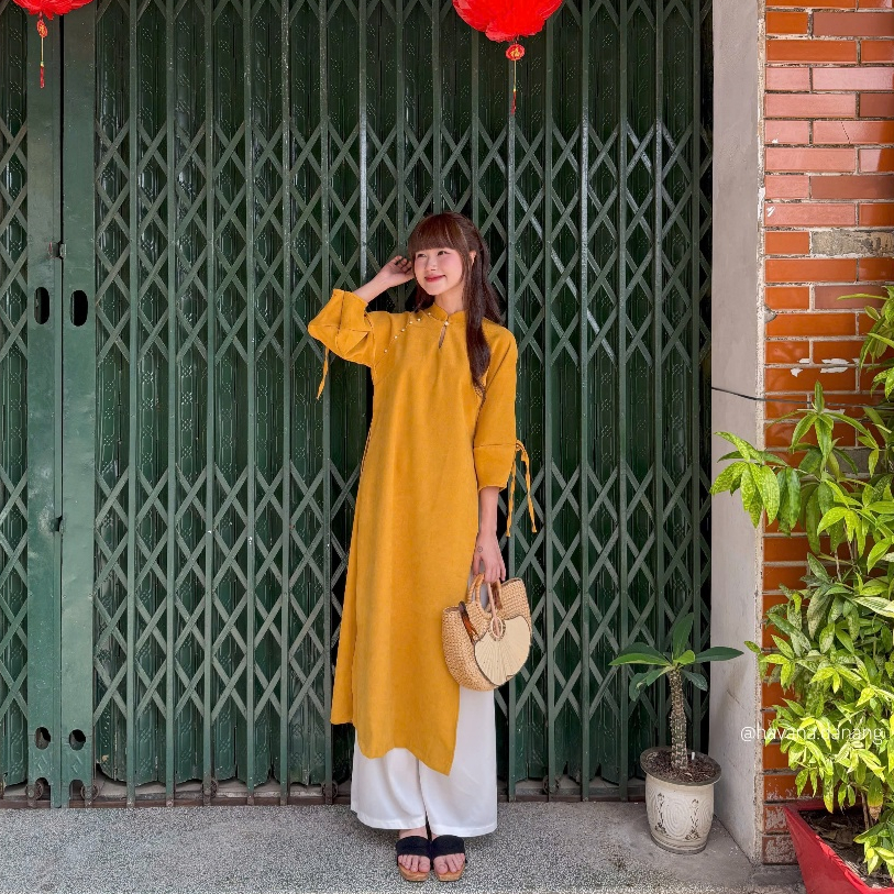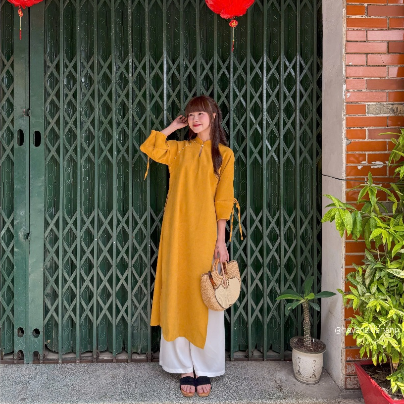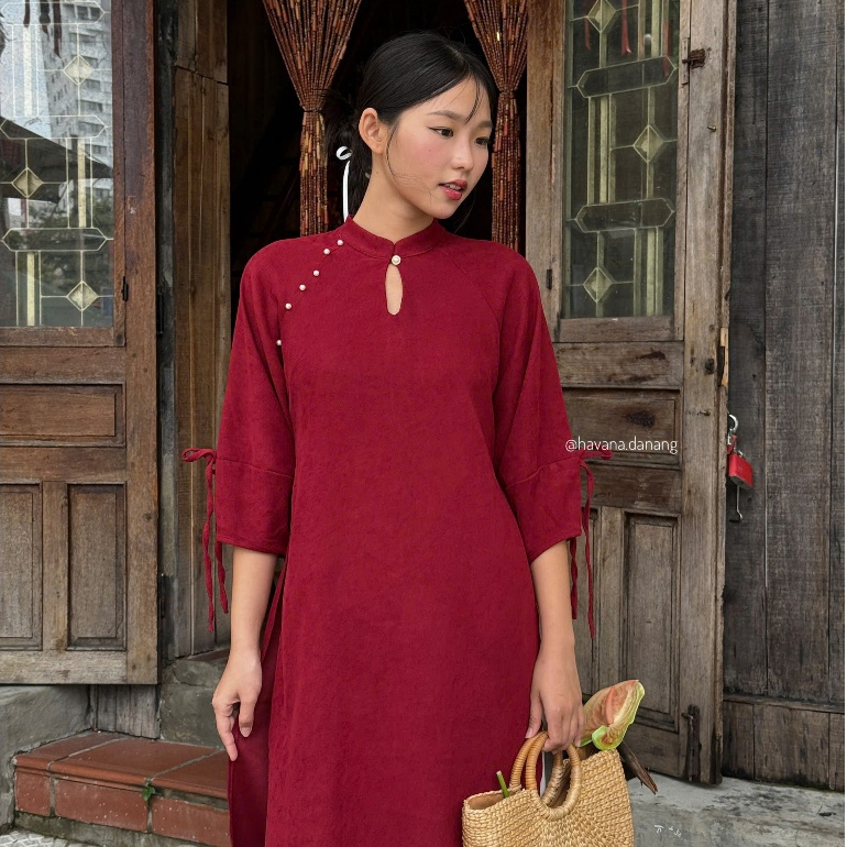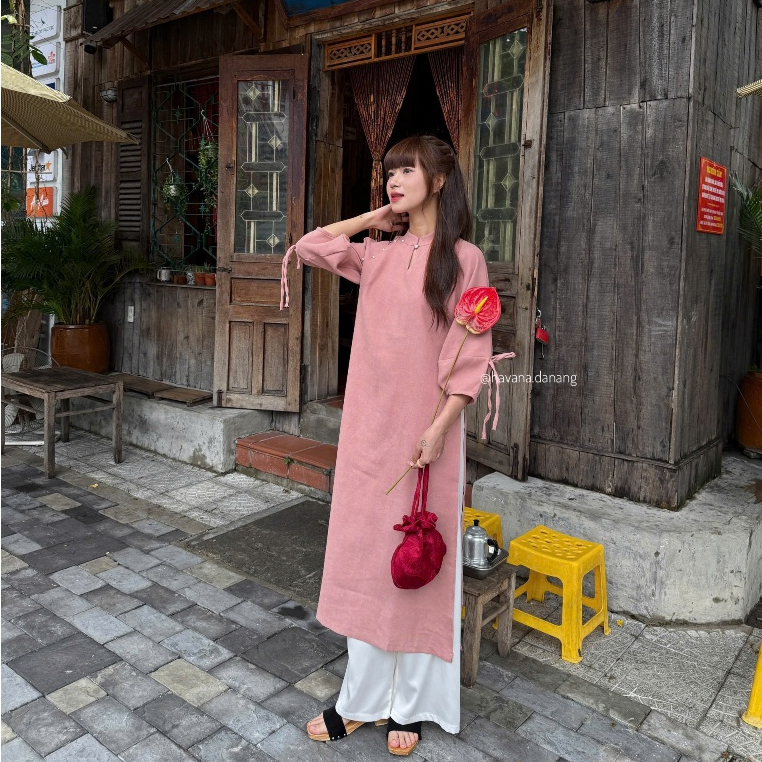 Áo dài VIÊN NGUYỆT nhung chéo cutouti cổ giọt nước đính cúc ngọc kèm quần HAVANA AD98