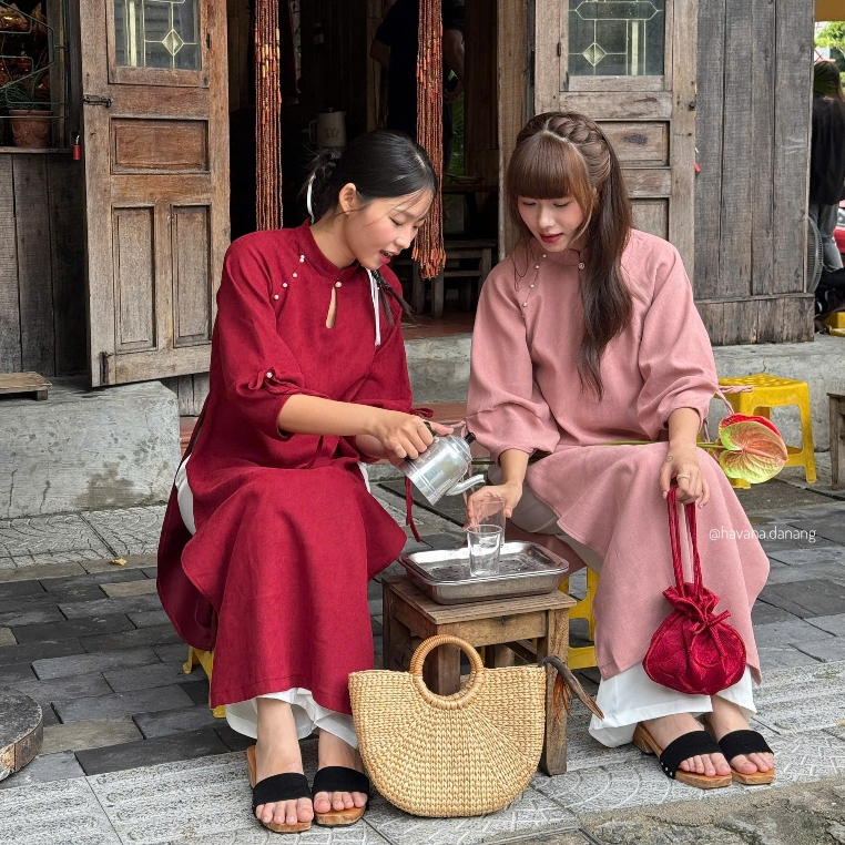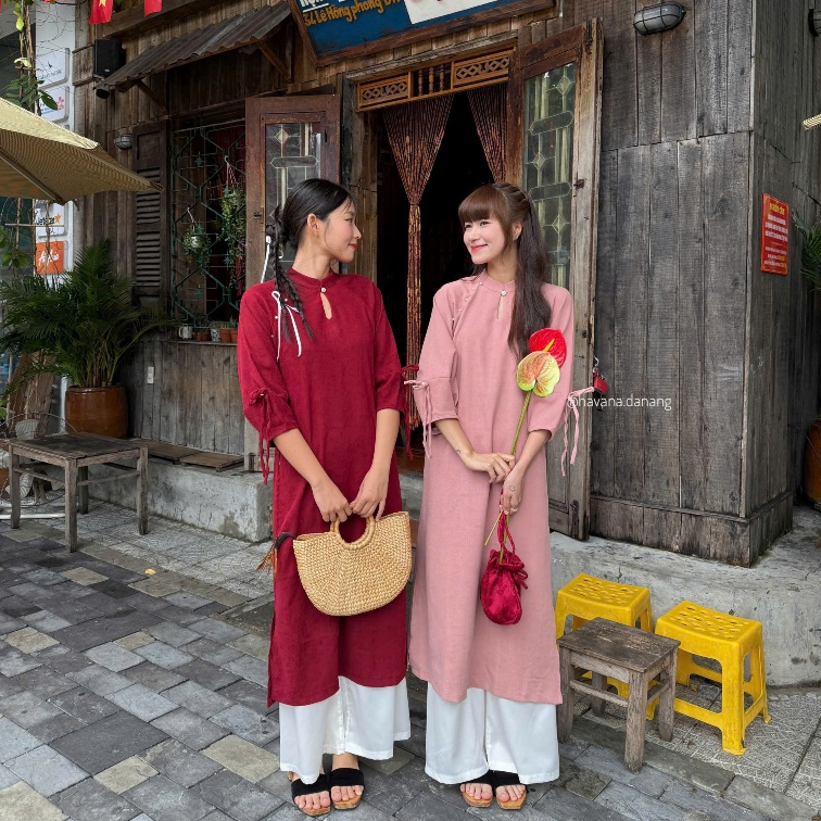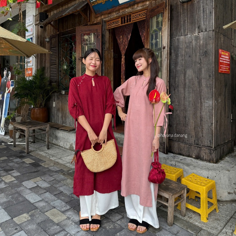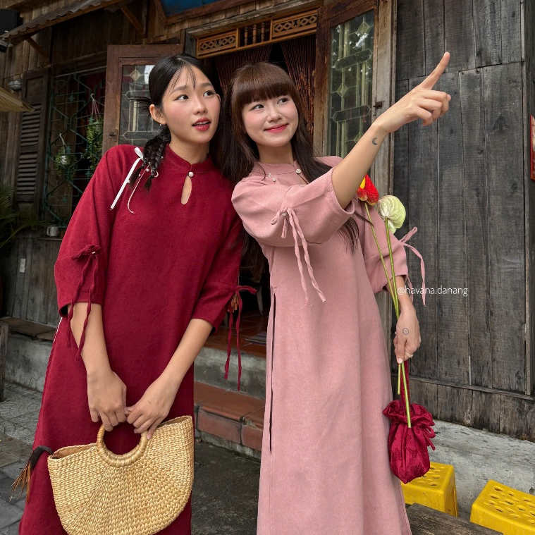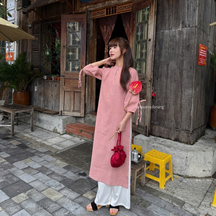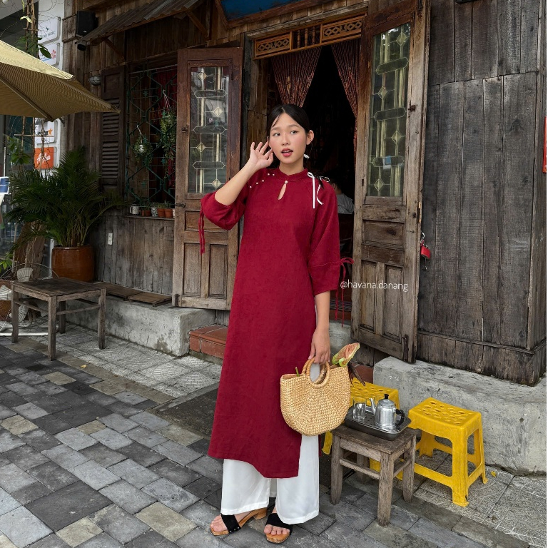 Áo dài VIÊN NGUYỆT nhung chéo cutouti cổ giọt nước đính cúc ngọc kèm quần HAVANA AD98