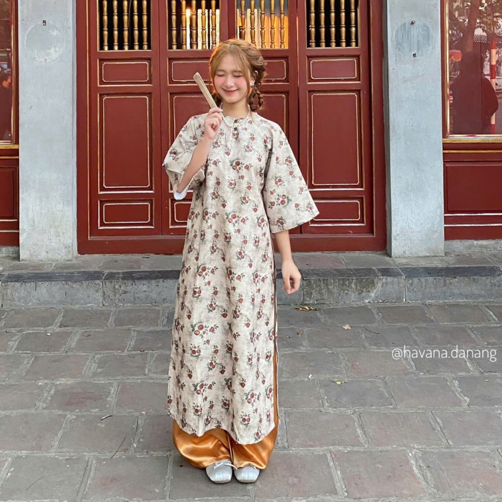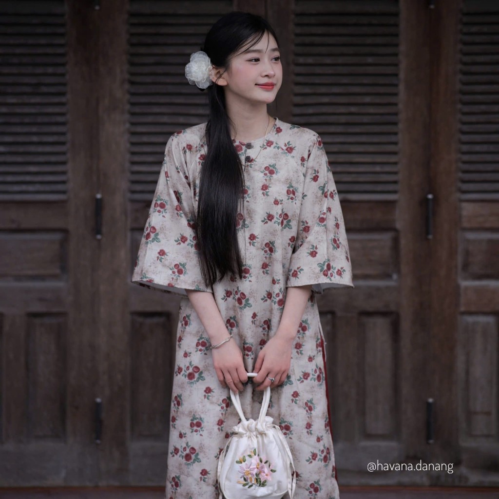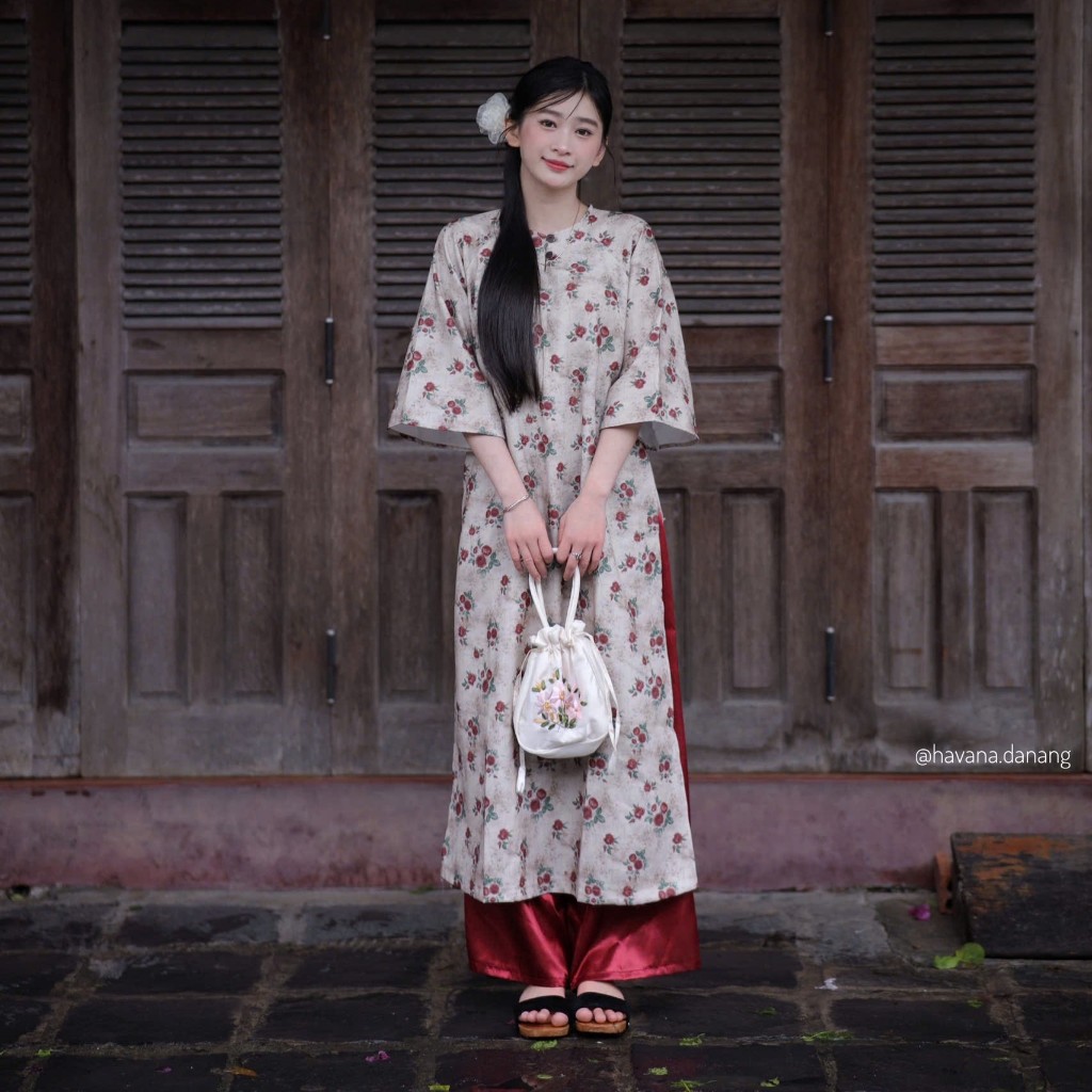 Áo dài nhung chéo HẢI QUỲNH in hoa quả đính cúc đôi cài kèm quần phi bóng HAVANA AD163