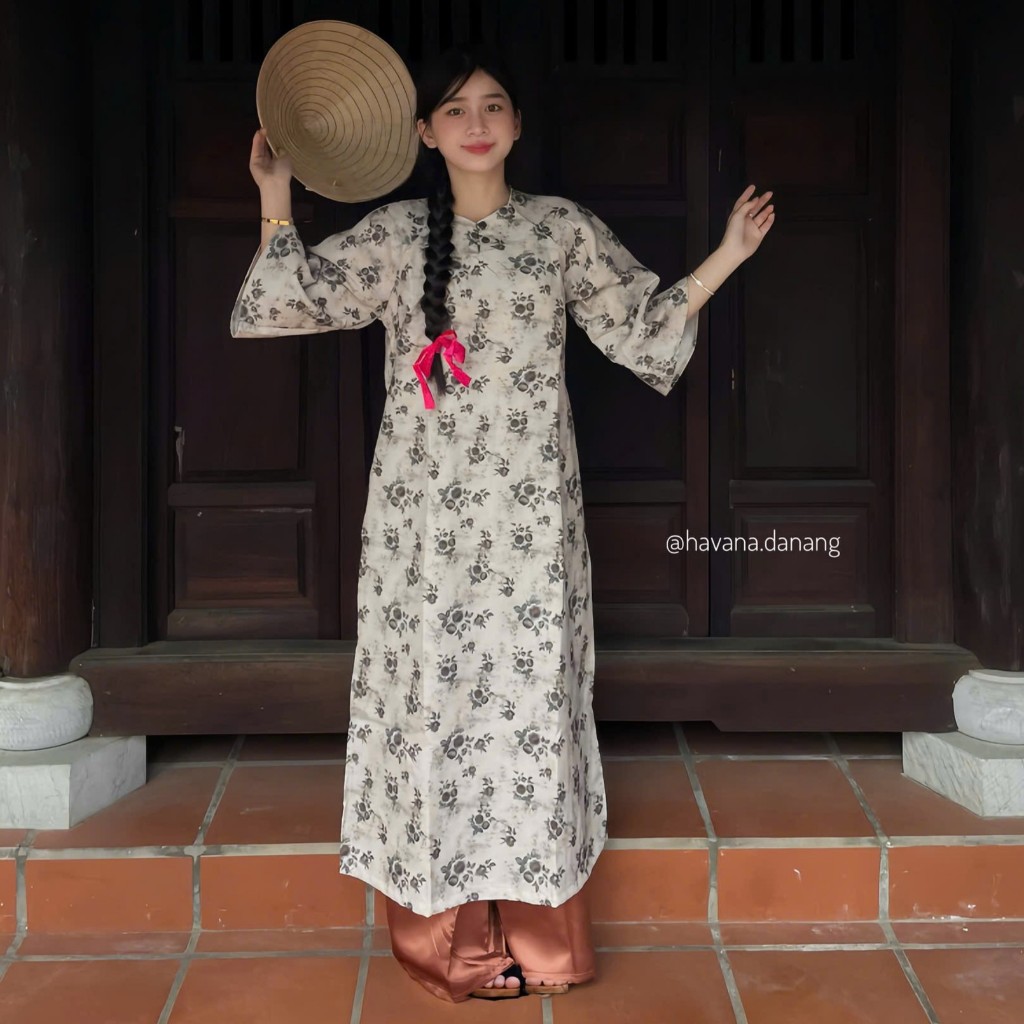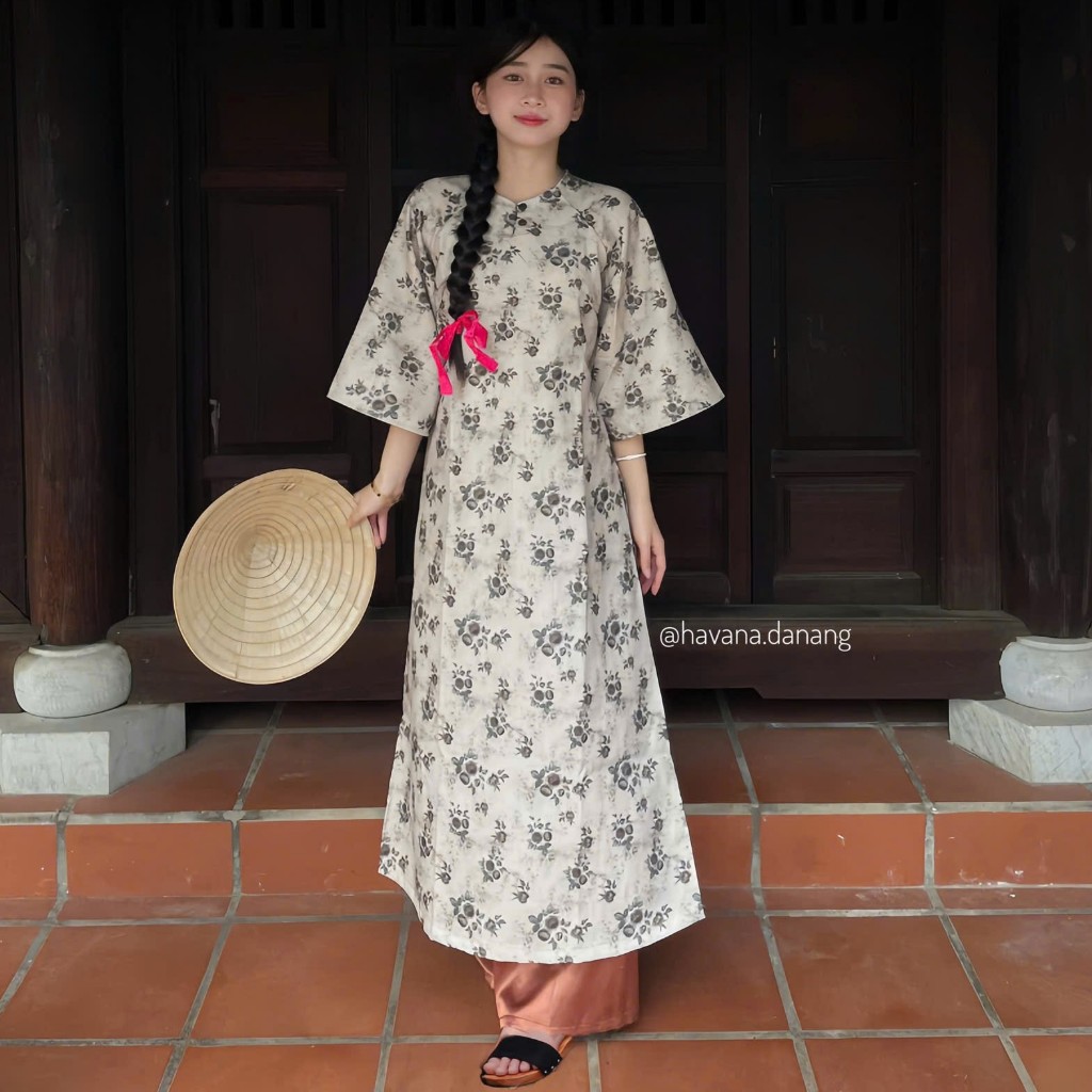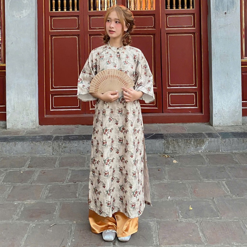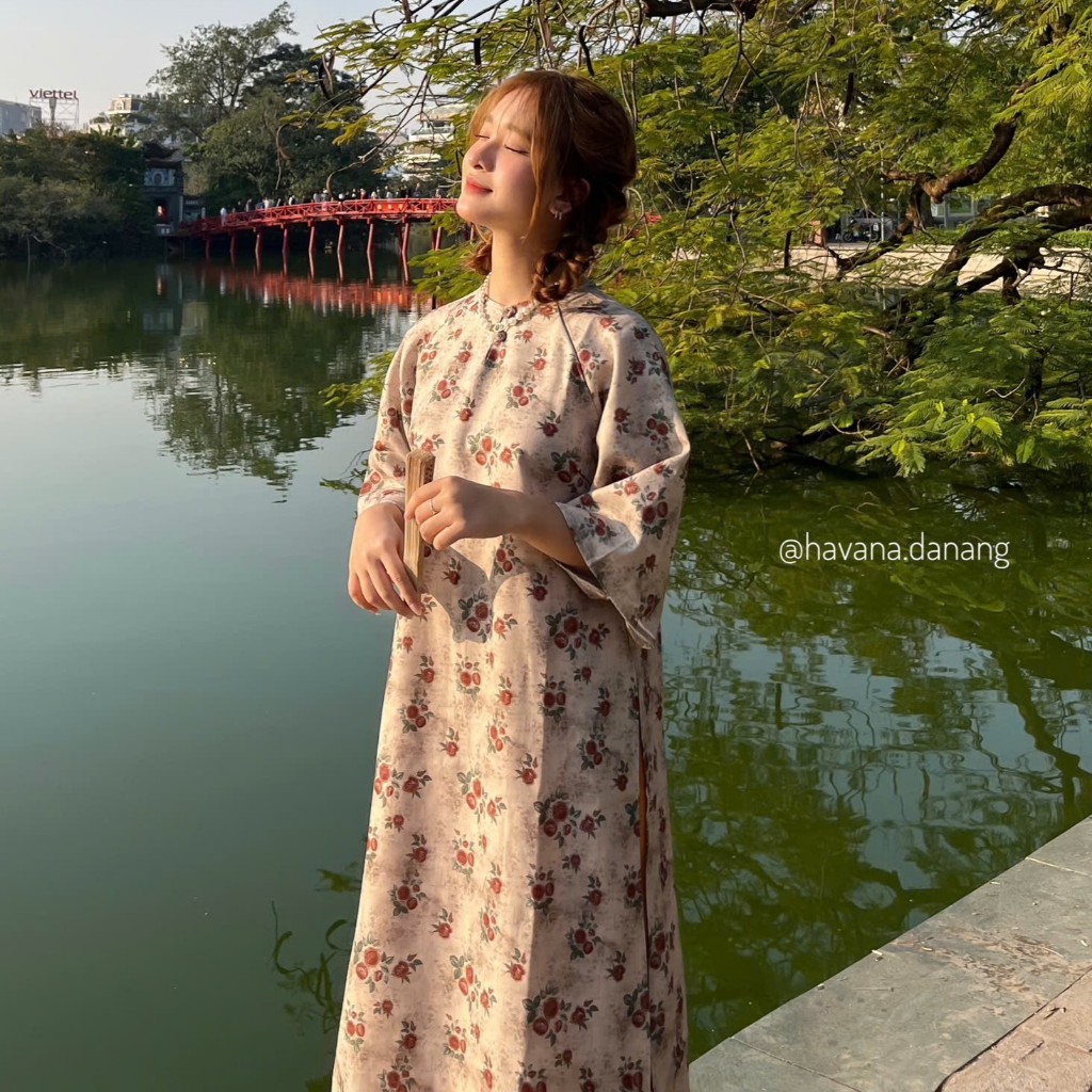 Áo dài nhung chéo HẢI QUỲNH in hoa quả đính cúc đôi cài kèm quần phi bóng HAVANA AD163