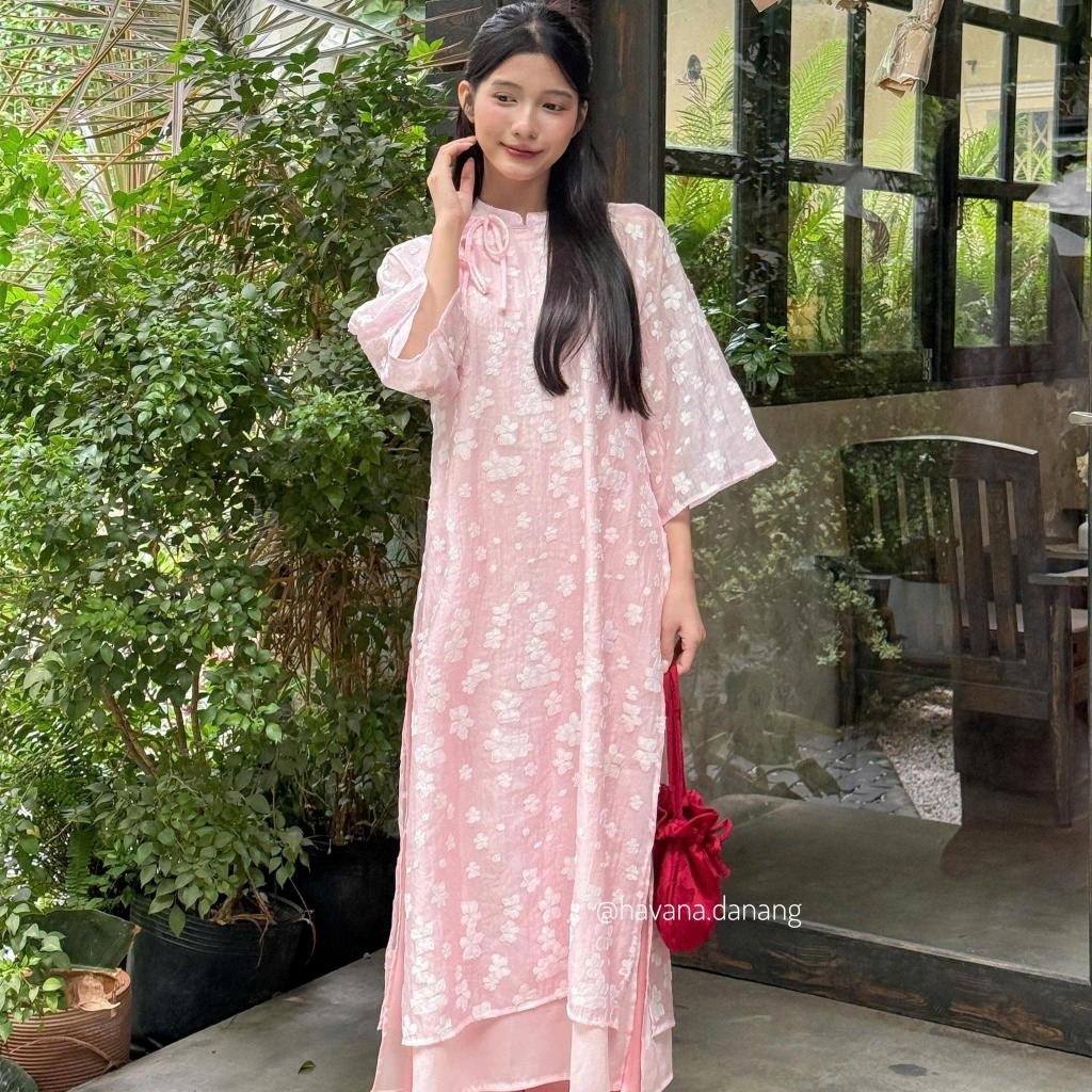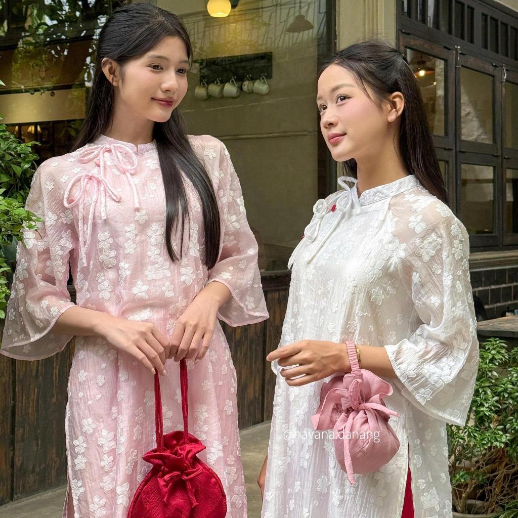 (HAVANA) XẢ KHO - Áo dài voan tơ NHÃ XUYÊN dập hoa nổi trắng phối cúc bọc cách điệu kèm quần Satin AD188