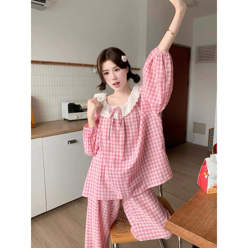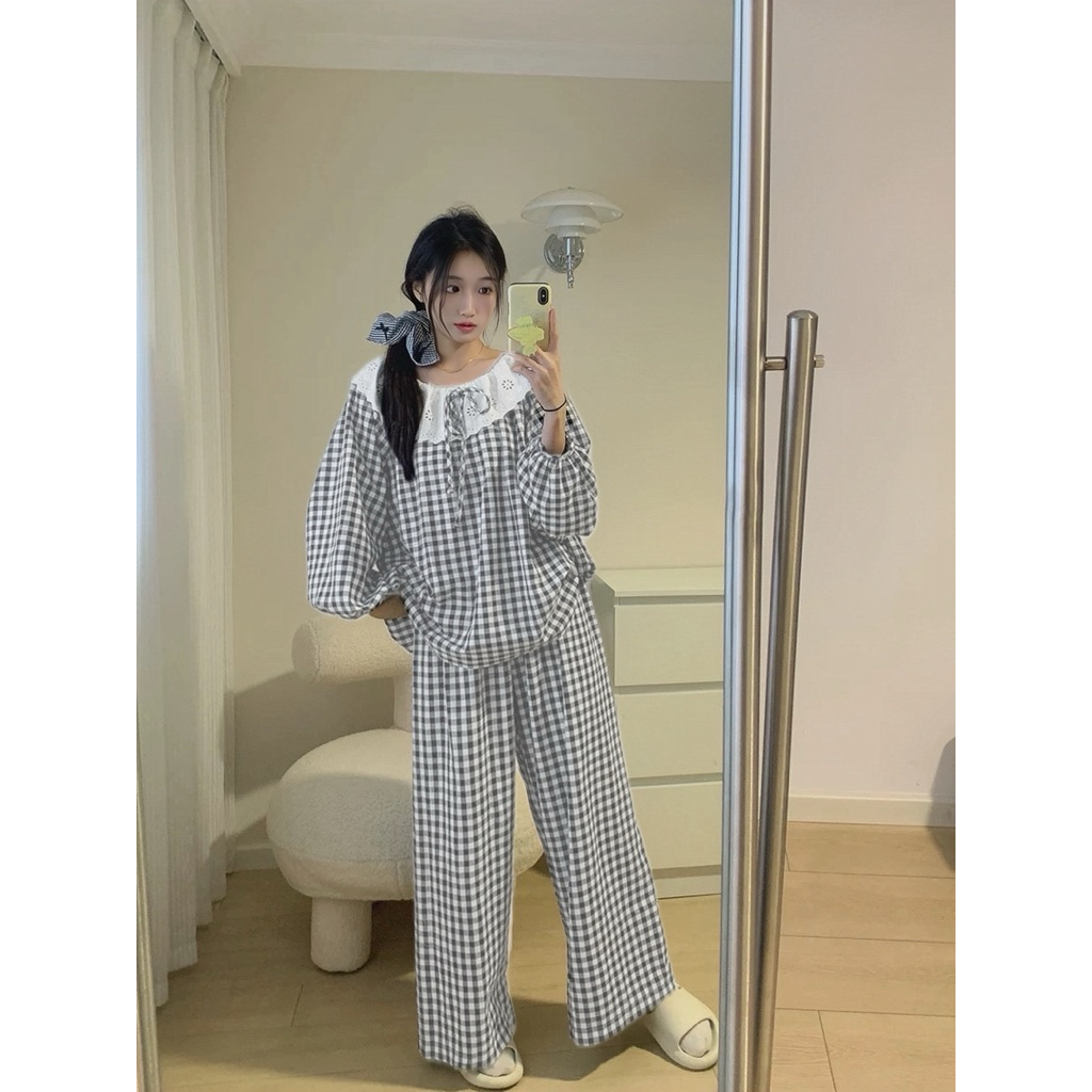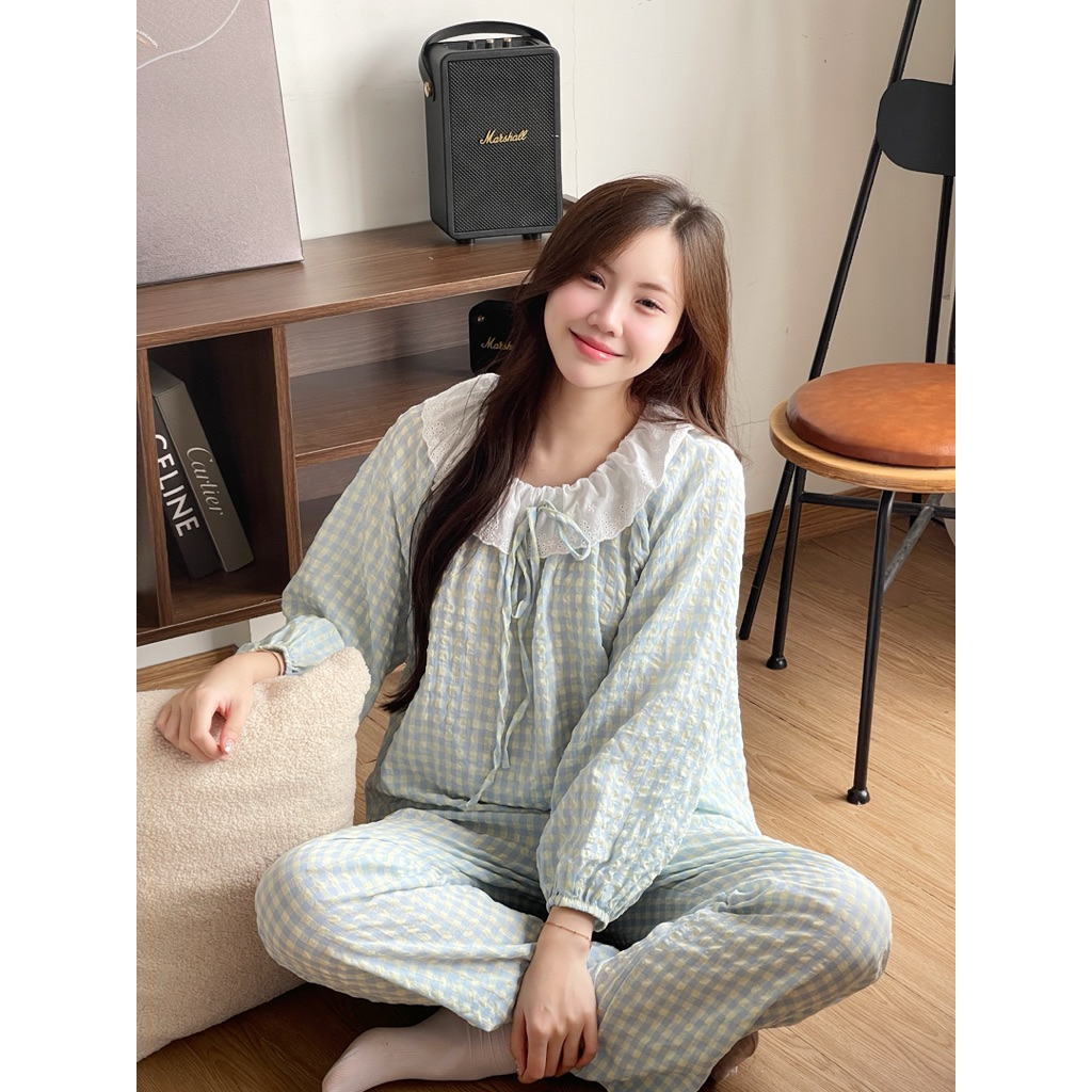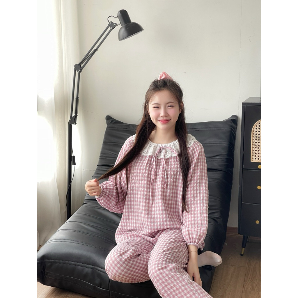 Bộ Đồ Ngủ Kẻ Caro Thắt Nơ Xinh Xắn Áo Dài Tay Dài Quần Dài Nữ Tuni.studio T04