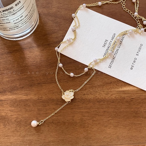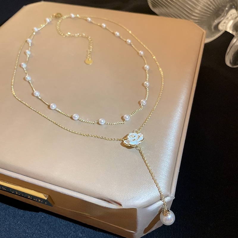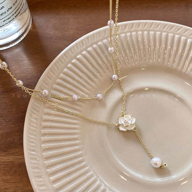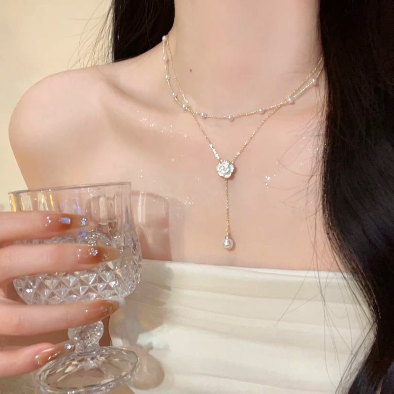 Vòng Cổ Choker 2 Lớp Hình Hoa Trà Lãng Mạn Đính Ngọc Trai Sang Trọng Cho Nữ
