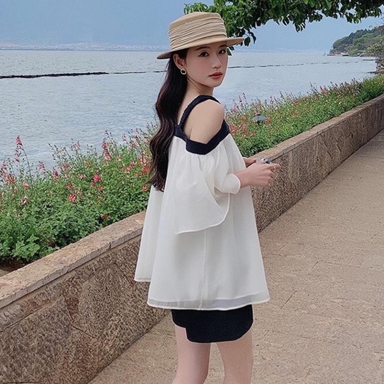Set đồ nữ áo trễ vai babydoll voan tơ phối quần short tacta phong cách hàn quốc B785 SUTANO