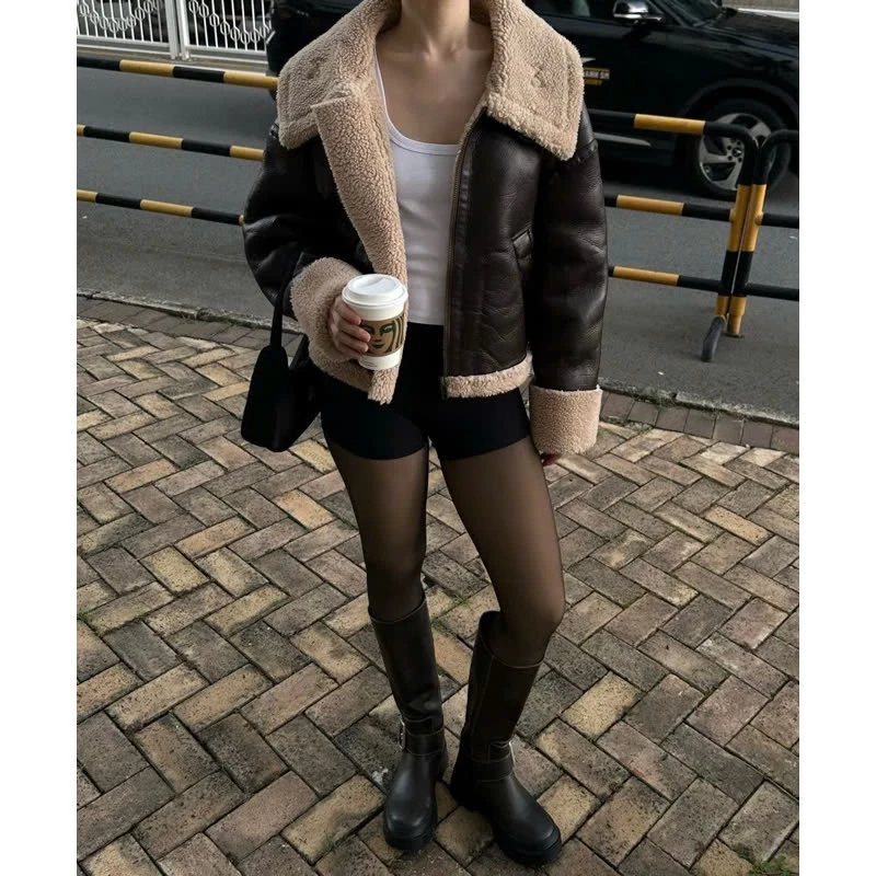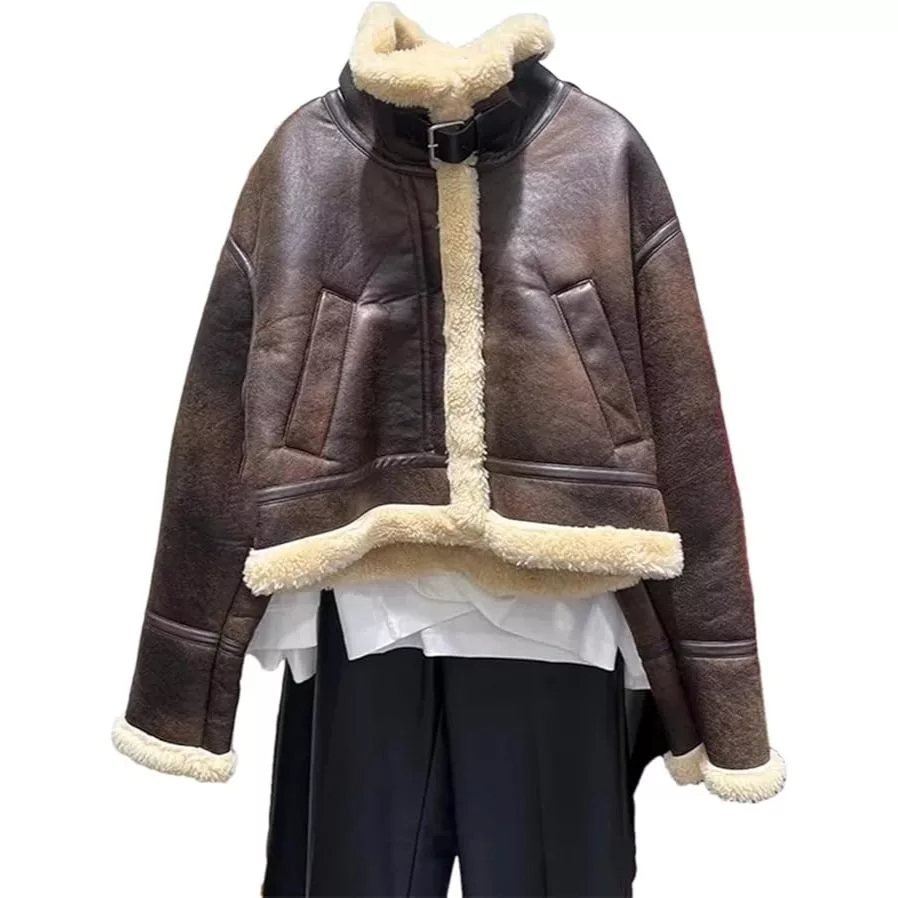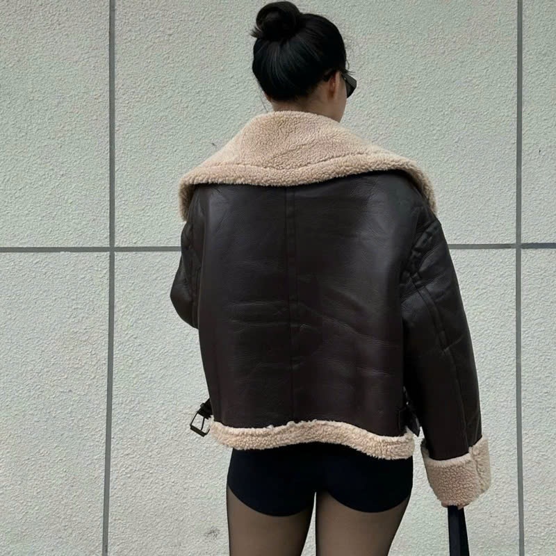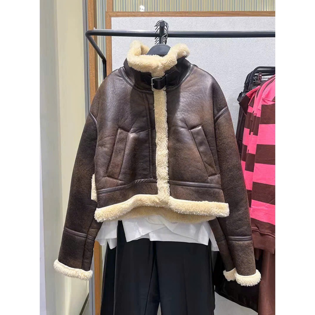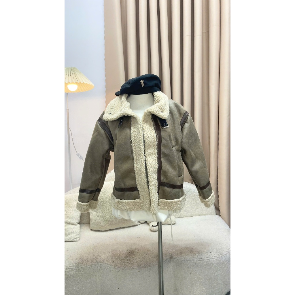 Áo khoác da Forgirl áo da lót lông dáng ngắn kèm đai cổ phối túi phong cách cá tính T093